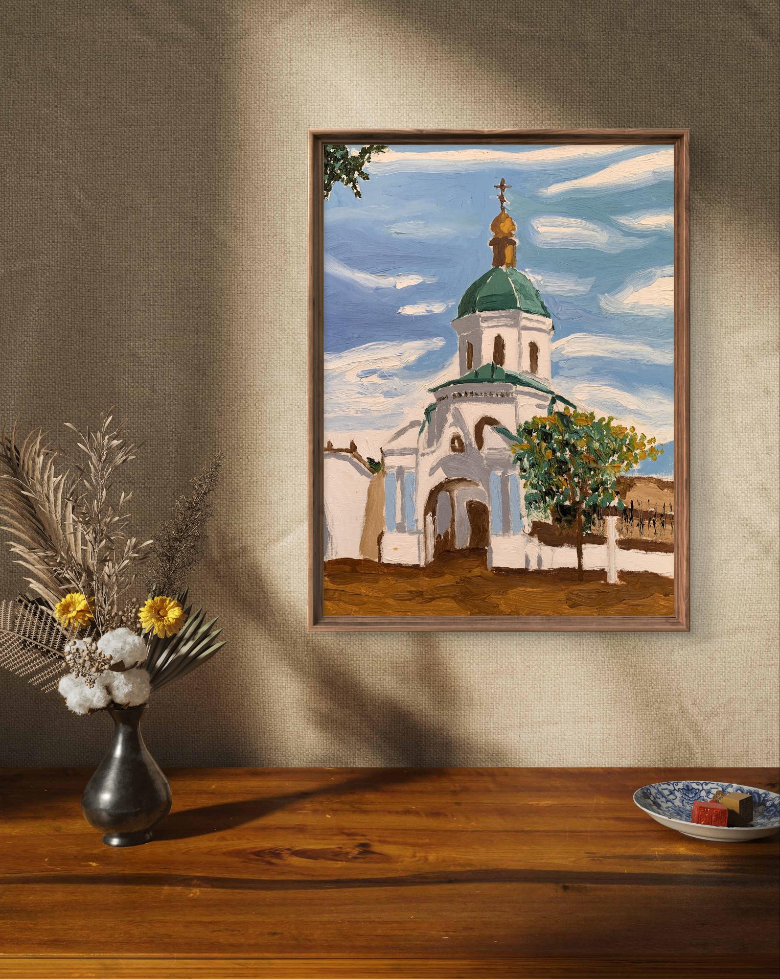 "City Church" is a beautifully rendered oil painting that captures the serene and timeless beauty of a traditional church in a city setting. The artist uses a realistic yet slightly impressionistic style to convey the grandeur and spiritual essence of the church. The composition is dominated by the central structure of the church, with its white walls and green-domed roof drawing the viewer’s attention. The church is framed by a clear blue sky with soft, wispy clouds, adding to the peaceful atmosphere of the scene. A tree with lush green foliage is positioned to the right, providing a natural contrast to the architectural lines of the church. The artist employs a soothing palette of whites, greens, blues, and browns. The white of the church stands out against the blue sky, symbolizing purity and tranquility. The green domes and foliage add a touch of vibrancy and life to the scene. The church features intricate architectural details, including arched windows and doorways, which are carefully depicted with precise brushwork. The golden cross atop the dome gleams subtly, symbolizing the spiritual significance of the building. The brushwork is fluid and expressive, particularly in the depiction of the sky and foliage. The artist uses broader strokes for the sky and tree, creating a sense of movement and lightness, while the church is painted with more defined lines to emphasize its solidity and structure. The painting conveys a sense of peace and spiritual tranquility, inviting viewers to reflect on the calm and solace that such sacred spaces provide. The inclusion of the tree and the natural surroundings suggests a harmonious relationship between the spiritual and natural worlds. The combination of realistic detail in the church and impressionistic elements in the sky and tree creates a balanced and aesthetically pleasing composition. The artist skillfully uses light and shadow to add depth and dimension to the painting, highlighting the architectural features and creating a sense of time and atmosphere. "City Church" is a captivating work of art that beautifully encapsulates the serene beauty of a city church. The artist’s skillful use of color, composition, and brushwork creates a harmonious and tranquil scene, inviting viewers to appreciate both the architectural splendor and the peaceful ambiance of the sacred space. Through its thoughtful depiction of light, shadow, and detail, the painting stands as a testament to the enduring beauty and spiritual significance of such edifices.