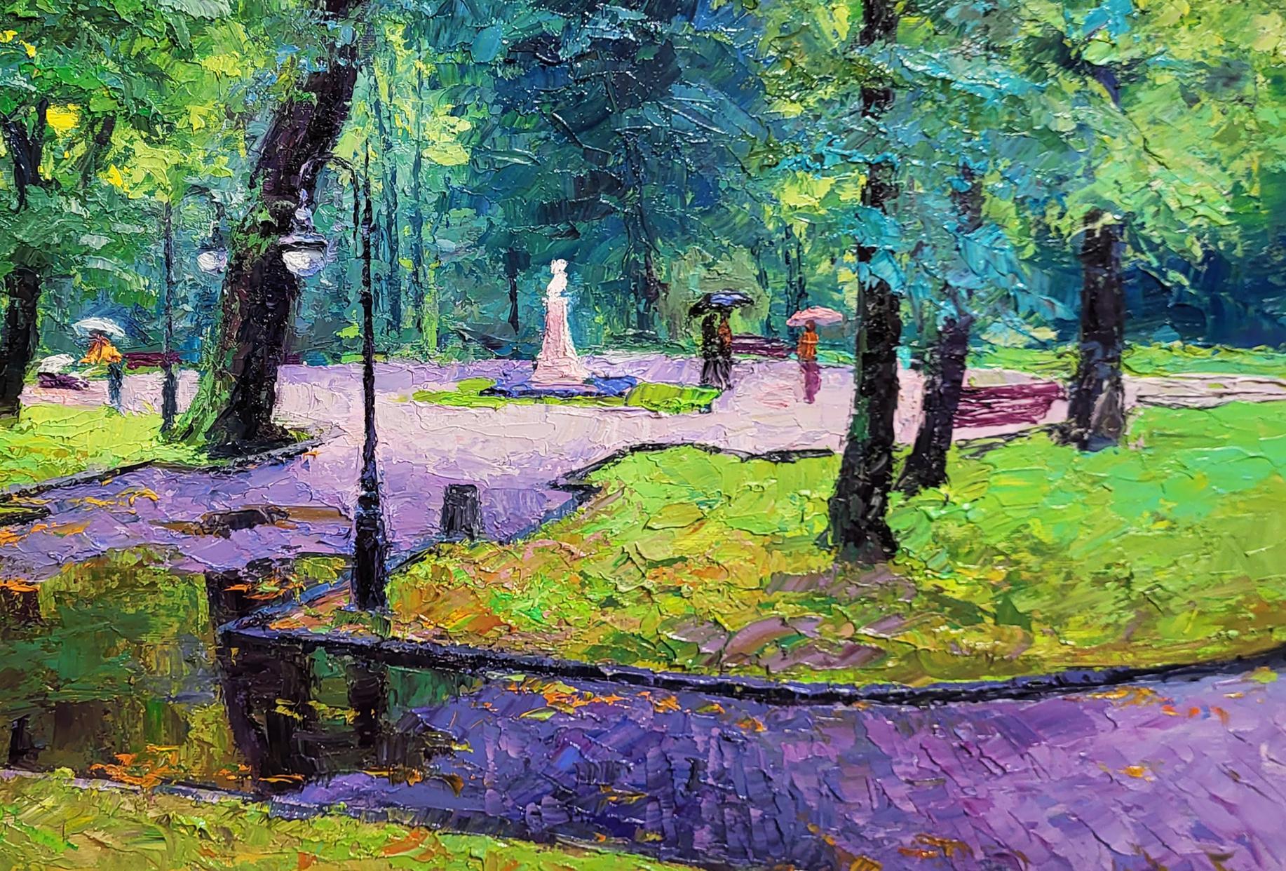 The painting titled "City Park" captures a serene and peaceful scene of a park on a rainy day, evoking feelings of tranquility and quiet reflection. The composition showcases a lush, green park filled with tall trees, winding paths, and small puddles reflecting the surroundings. The atmosphere is calm, and the soft, diffused light suggests that the rain has recently stopped or is gently falling. The park is alive with the vibrant greenery of spring or summer, creating a refreshing and soothing ambiance.In the foreground, a narrow pathway covered in wet cobblestones leads deeper into the park. The path is bordered by patches of grass and trees, and small puddles of rainwater reflect the light and surrounding colors, adding depth and movement to the scene. The reflections in the water create a sense of life and realism, enhancing the dynamic nature of the painting.Scattered throughout the park are a few figures with umbrellas, leisurely strolling along the paths. Their presence adds a human element to the painting, suggesting that the park is a place for quiet walks, even during rainy weather. In the distance, a statue can be seen standing gracefully in the center of a clearing, lending a sense of history and permanence to the park. The statue appears to be a significant landmark, adding a sense of culture and tradition to the scene.The trees, painted with thick, textured brushstrokes in various shades of green and blue, dominate the composition. The artist skillfully uses color to convey the lushness and freshness of the park. The leaves appear to glisten with rain, and the trunks of the trees are darkened from the moisture, further emphasizing the rainy atmosphere.Through "City Park," the artist conveys a message of peace, introspection, and the beauty of nature in urban spaces. The painting invites viewers to appreciate the calming effect of nature, even in the midst of a bustling city. The rainy weather adds an element of melancholy, but the bright greens and vibrant reflections suggest renewal and hope, as rain often brings life and growth.The scene evokes a sense of timelessness, reminding viewers that parks are places of refuge and relaxation, where one can escape the noise of the city and connect with nature. "City Park" encourages the viewer to slow down, take a walk, and appreciate the quiet moments of life, even on rainy days. The painting beautifully captures the harmonious coexistence of nature and urban life, symbolizing the importance of preserving green spaces for future generations.