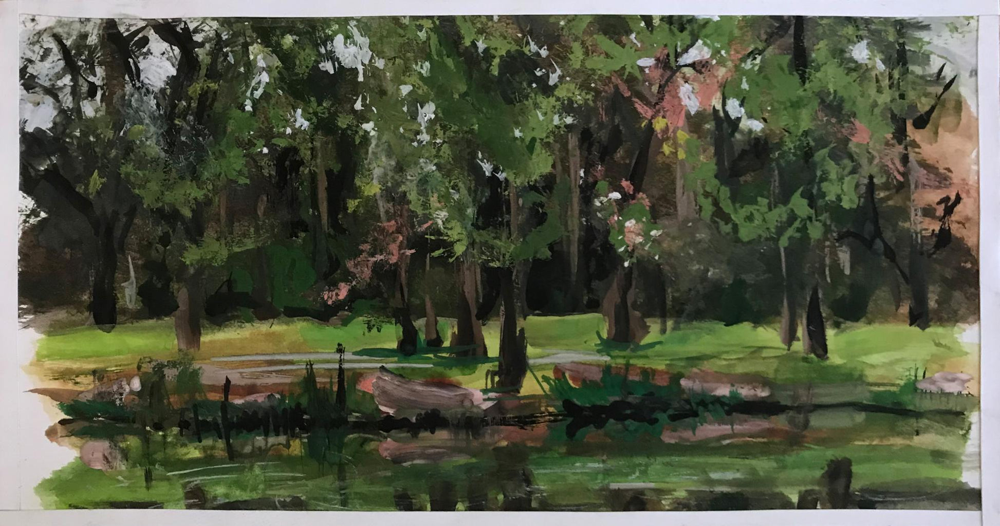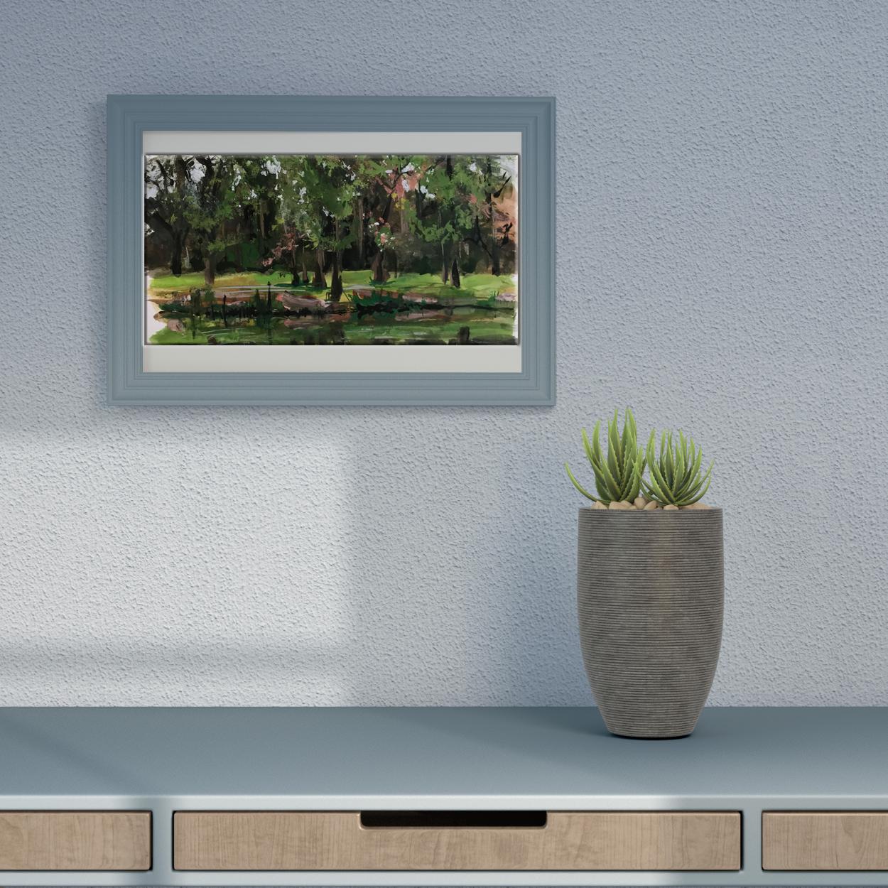 Introducing the "City Park" oil painting - a beautiful and tranquil scene that is sure to bring a touch of peace and serenity to any home or office. This lovely painting features a city park with a pond and green lawn, surrounded by tall trees. The Summer sun shines down upon the scene, creating a warm and inviting atmosphere.