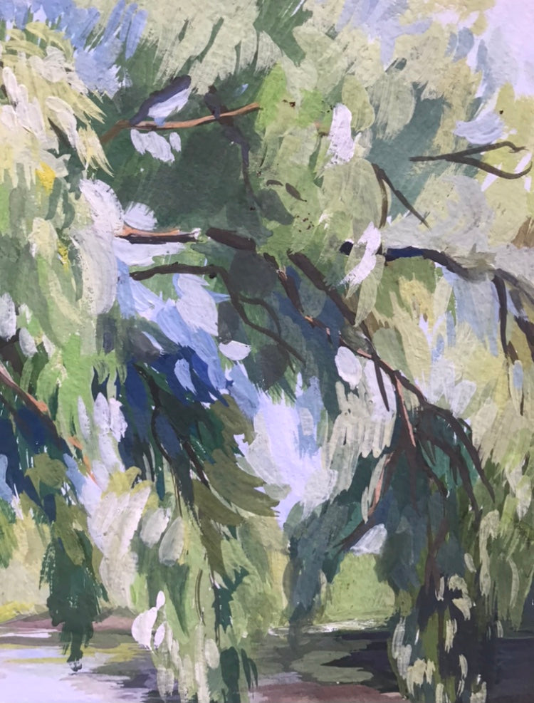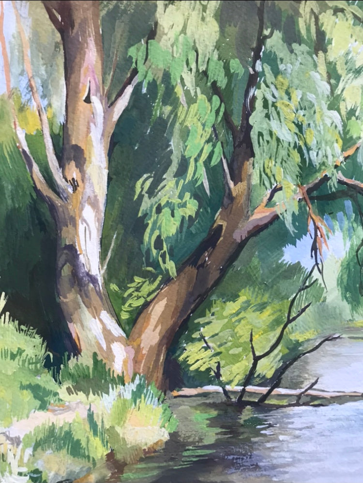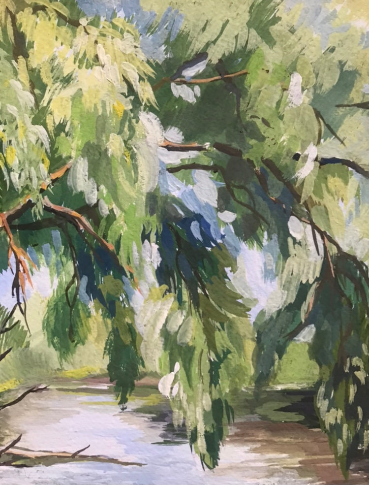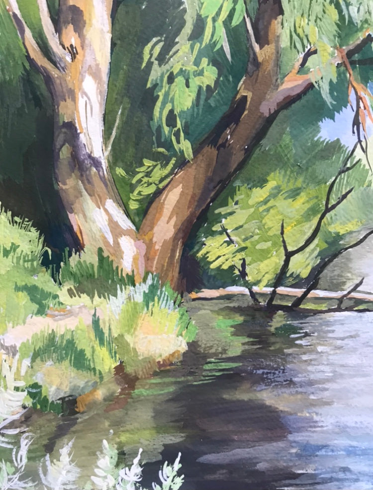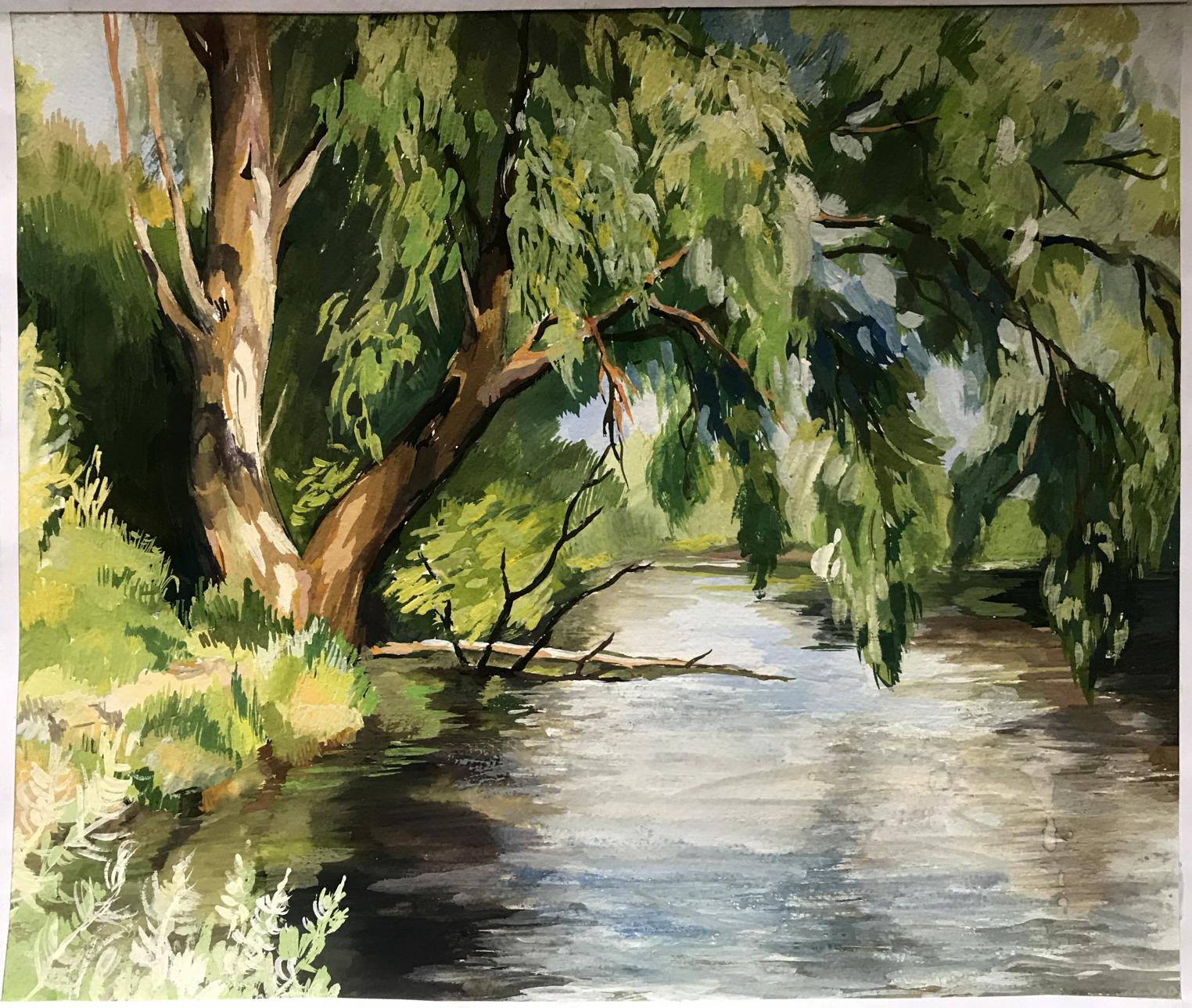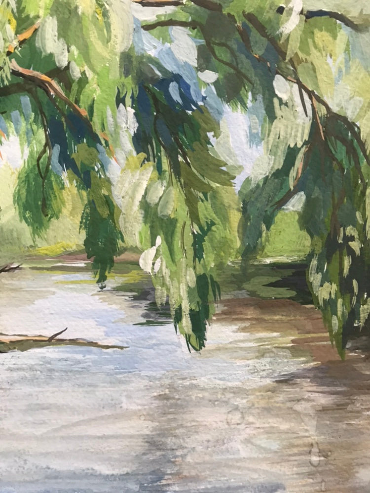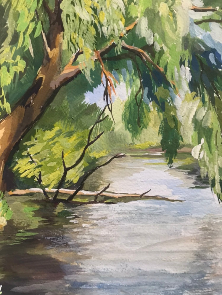 This beautiful painting will transport you to a summer day by the river. The thickets on the banks and the large tree above the water create a feeling of peacefulness and calm. The warm colors will bring a touch of sunshine to any room. This painting is sure to please anyone who loves nature or enjoys tranquil scenes.