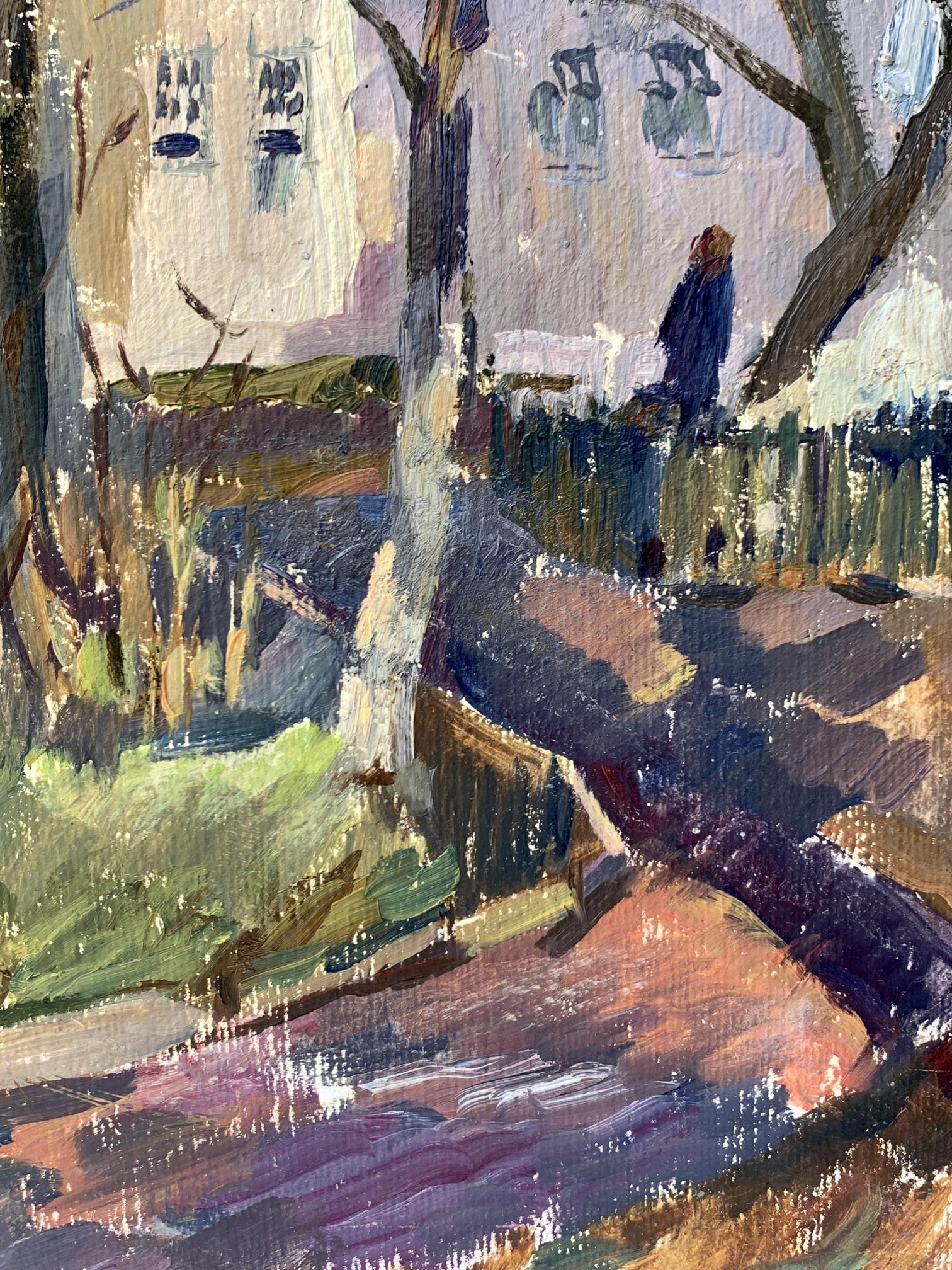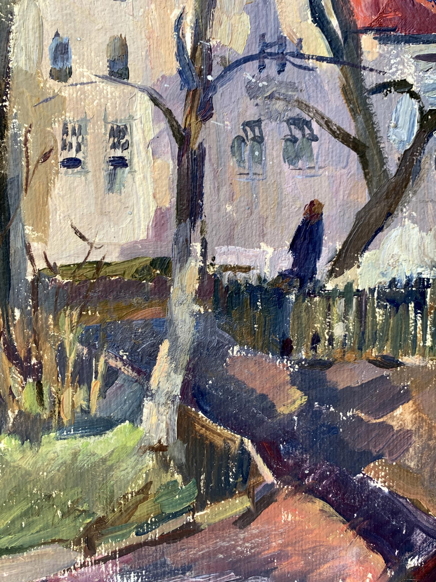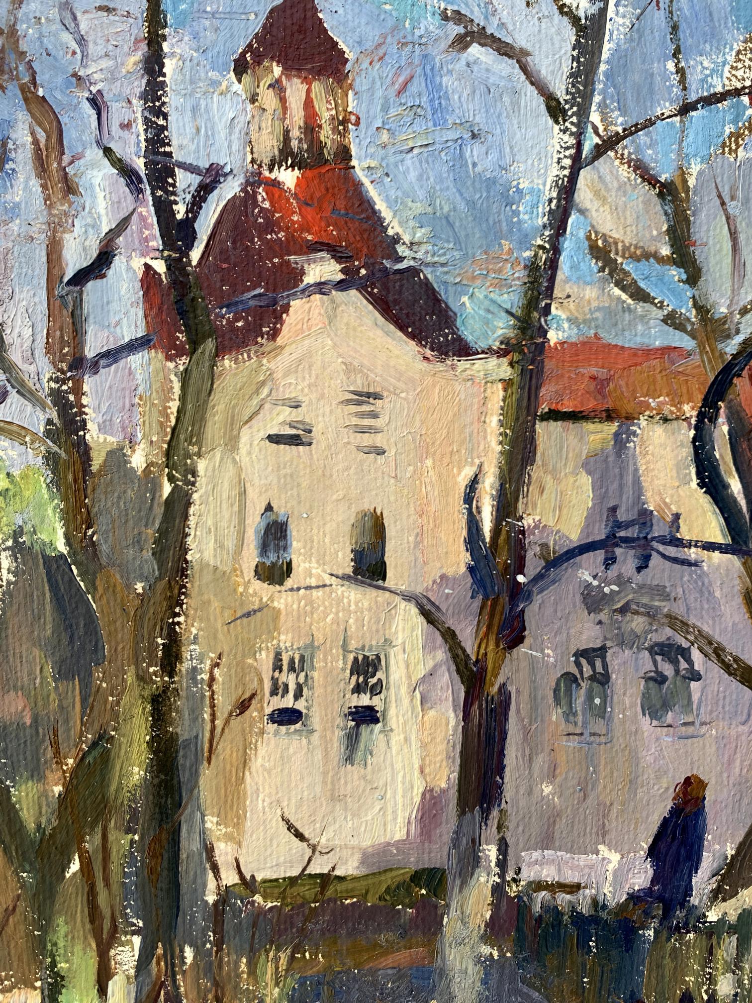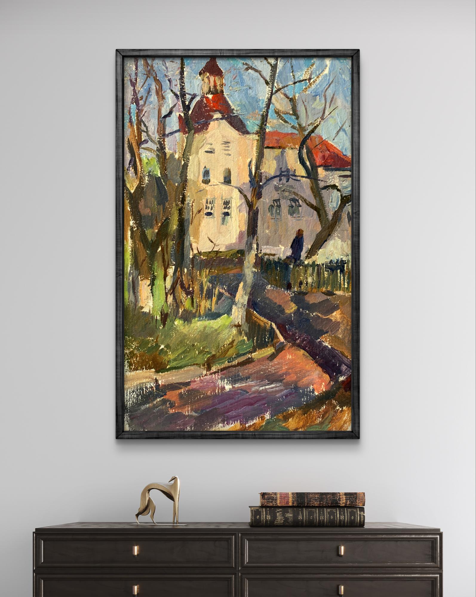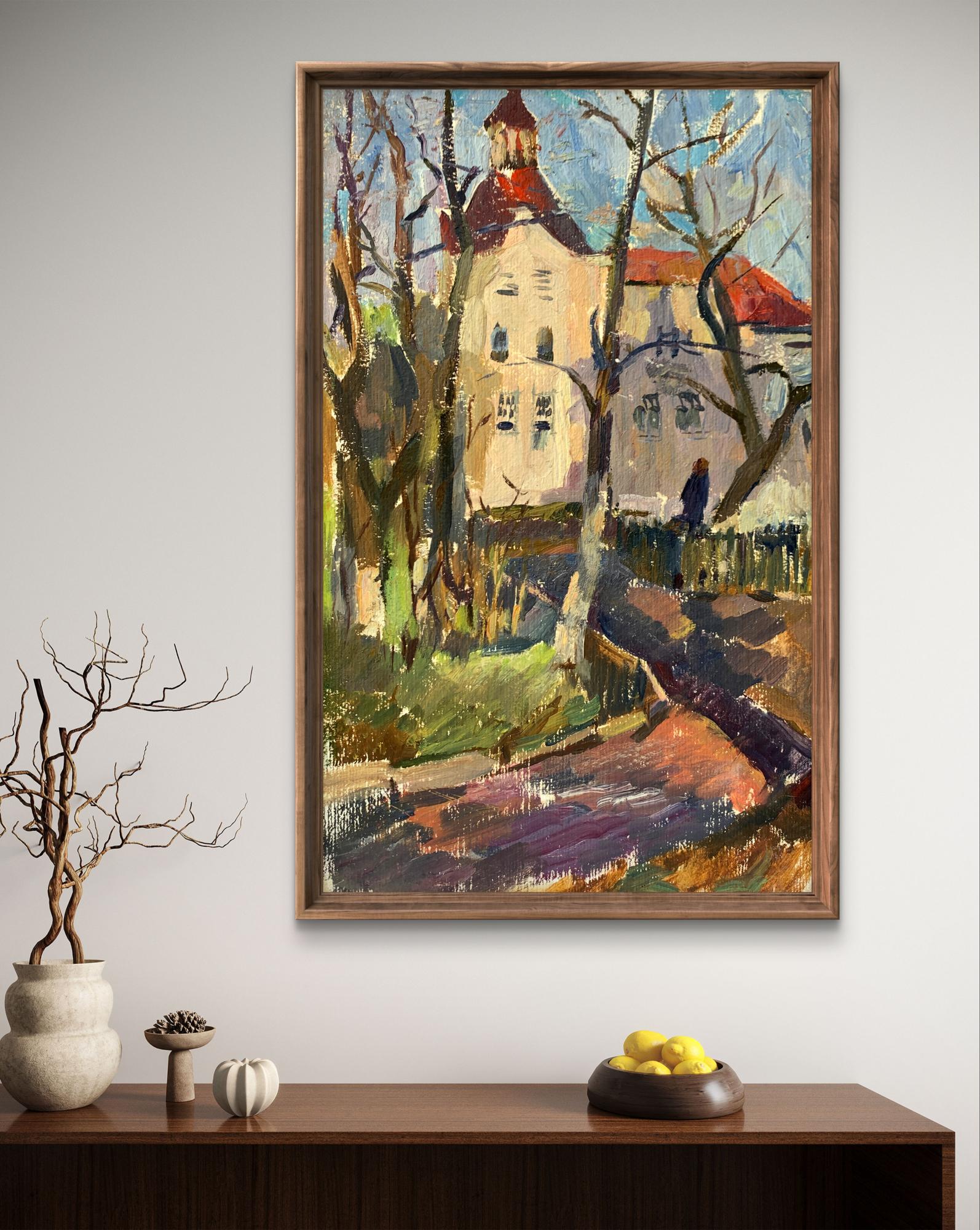 The painting titled "City Streets" is a poetic and intimate representation of a quiet urban scene, masterfully crafted with oil on canvas. The composition centers around a charming building with a red roof and distinct architectural details, perhaps an old church or town hall, standing tall amidst the trees that frame the image. The warm sunlight casts soft shadows, adding a dynamic interplay of light and shade, which brings the scene to life.The artist uses loose and expressive brushstrokes, giving the piece an impressionistic quality that captures the essence of the moment rather than precise details. The bare branches of the trees create intricate patterns, partially obscuring the building, and evoke the feeling of early spring or late autumn. The choice of earthy tones in the foreground, combined with the creamy whites and warm reds of the building, creates a harmonious balance, contrasting beautifully with the cool blues of the sky.In the foreground, a path or bridge, rendered with textured brushwork, guides the viewer's eye into the scene. A solitary figure is seen walking, their presence adding a human touch and an element of storytelling to the painting. The figure's dark silhouette contrasts subtly with the bright backdrop, emphasizing a sense of solitude and reflection.Through "City Streets," the artist appears to celebrate the quiet beauty of everyday life in an urban setting. The scene is devoid of hustle and bustle, focusing instead on the peaceful coexistence of nature and architecture. The interplay of light and shadow suggests the passage of time, capturing a fleeting moment where the warmth of the sun meets the cool shade of the trees.The painting conveys a sense of nostalgia and tranquility, inviting the viewer to pause and appreciate the simple yet profound beauty of a cityscape that often goes unnoticed. It serves as a reminder of the charm found in quiet corners of urban life, where history, nature, and humanity converge in harmony. Through this work, the artist not only depicts a scene but also evokes emotions of introspection and connection with one's surroundings.