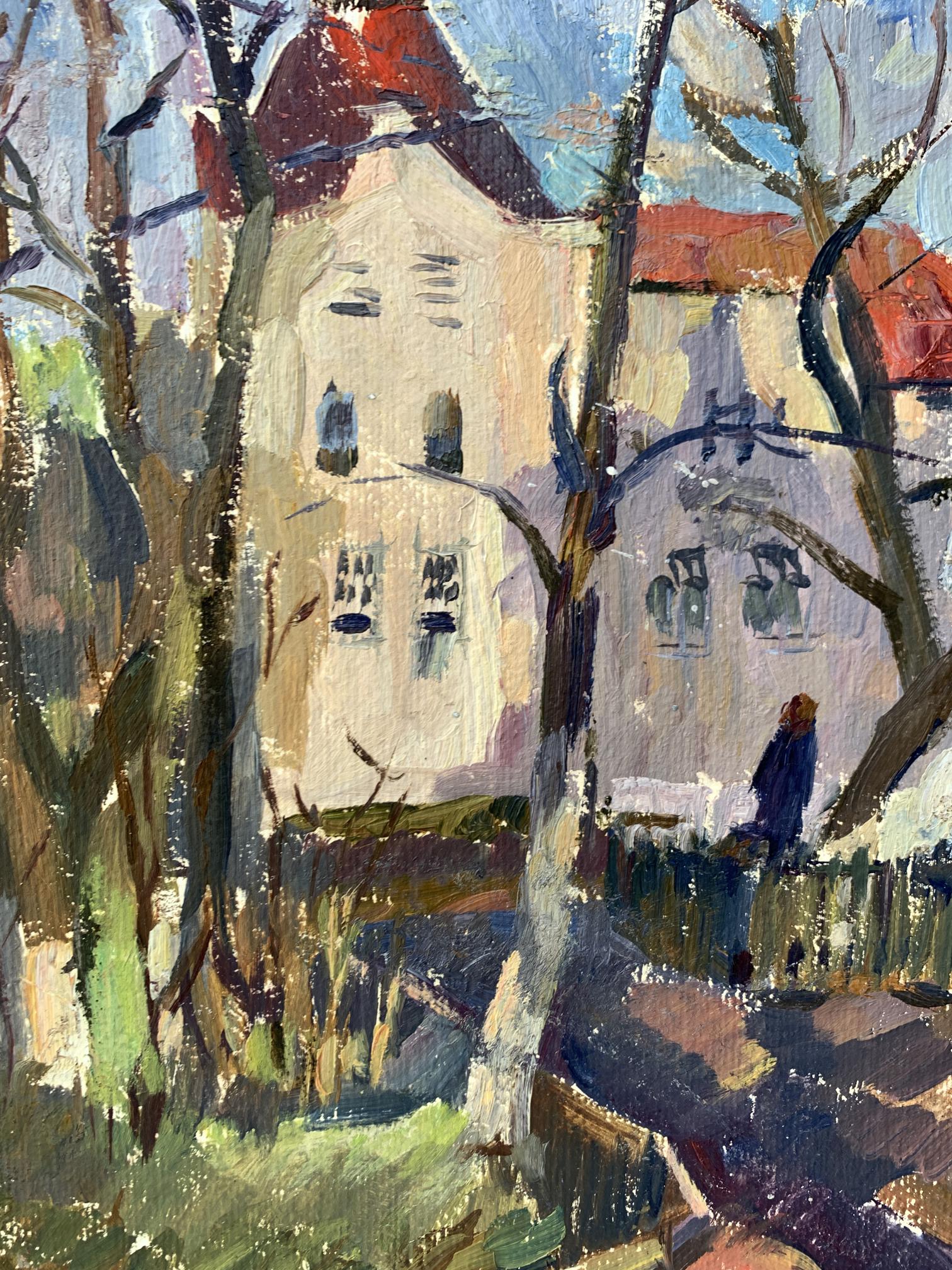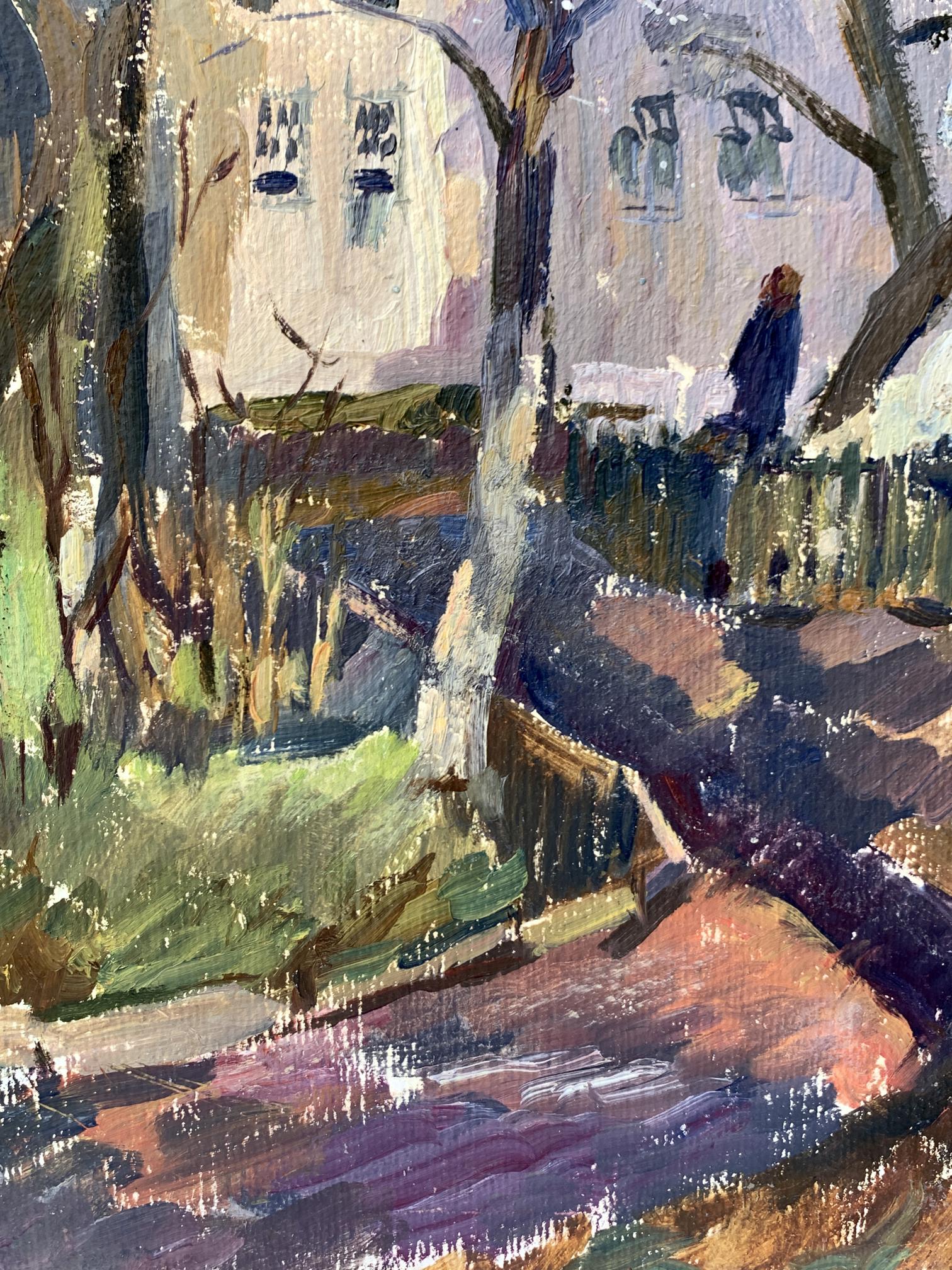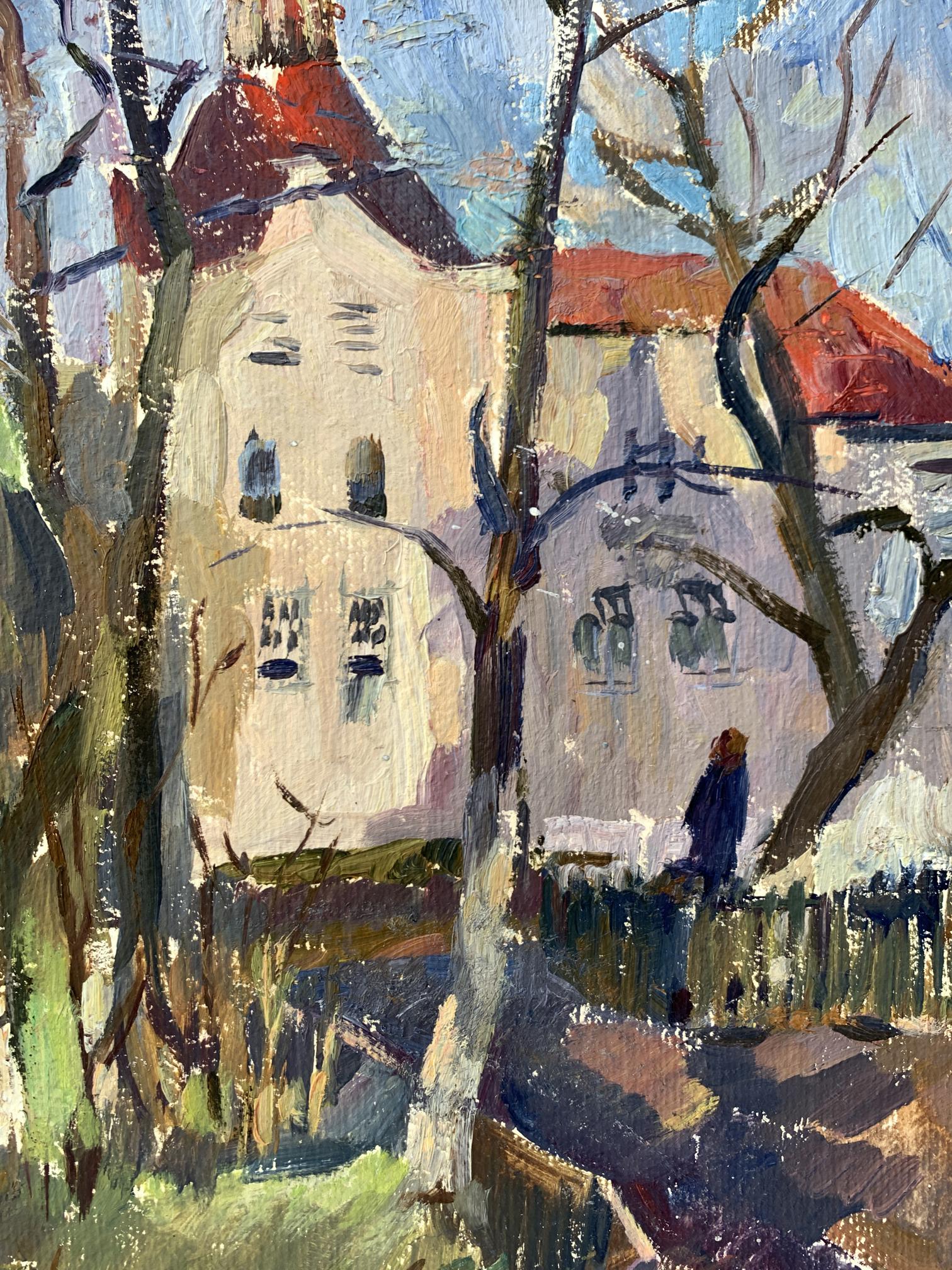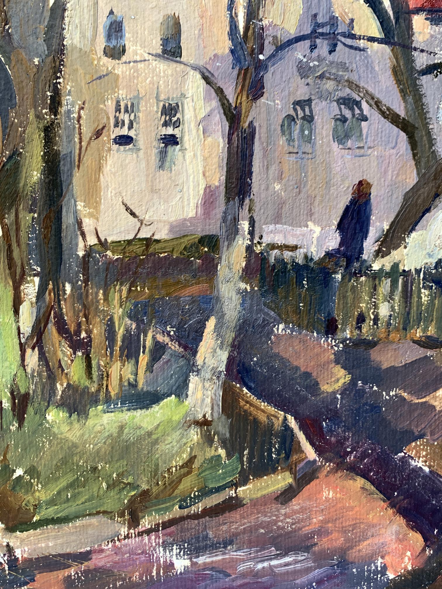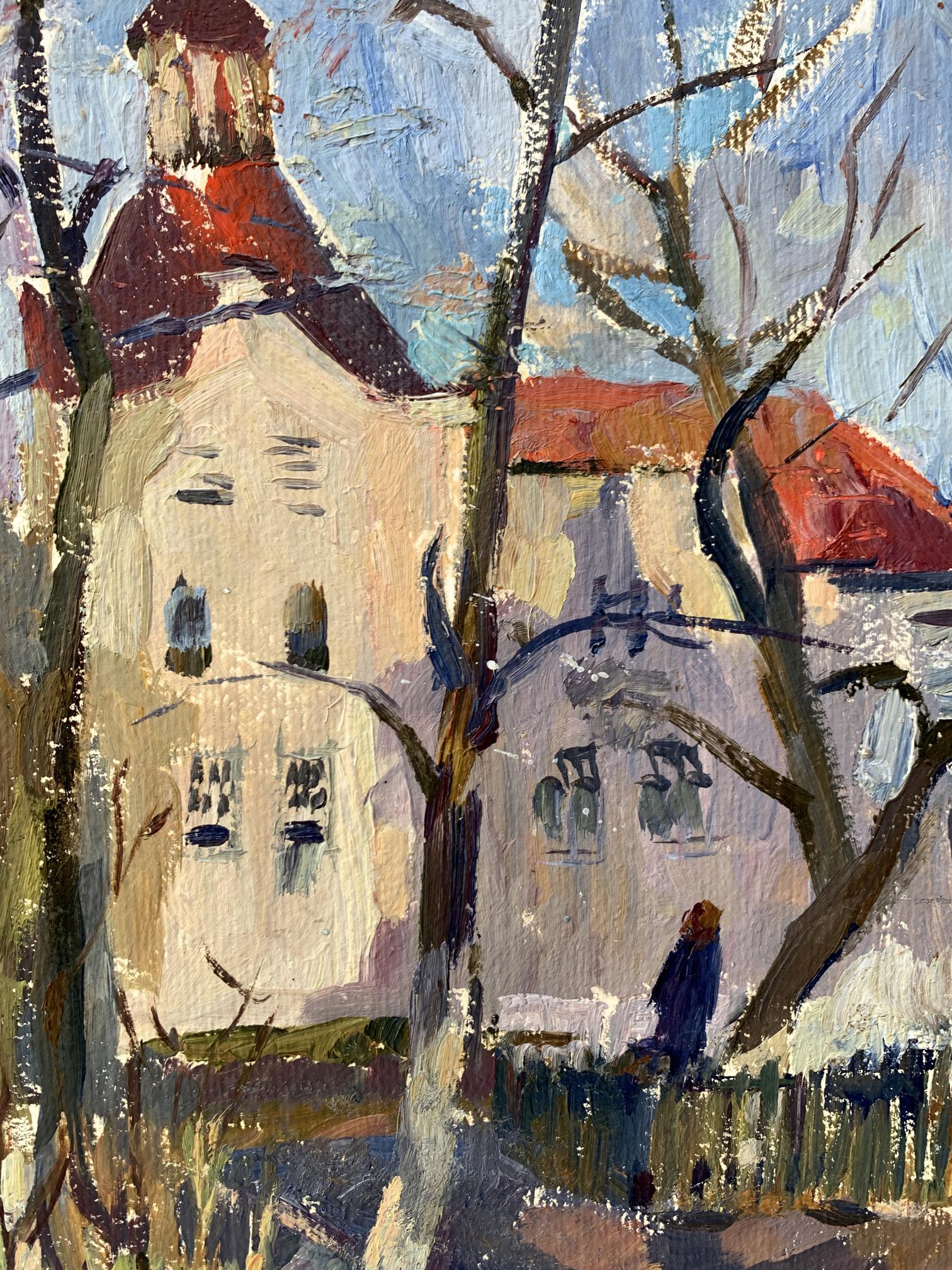 The painting titled "City Streets" is a poetic and intimate representation of a quiet urban scene, masterfully crafted with oil on canvas. The composition centers around a charming building with a red roof and distinct architectural details, perhaps an old church or town hall, standing tall amidst the trees that frame the image. The warm sunlight casts soft shadows, adding a dynamic interplay of light and shade, which brings the scene to life.The artist uses loose and expressive brushstrokes, giving the piece an impressionistic quality that captures the essence of the moment rather than precise details. The bare branches of the trees create intricate patterns, partially obscuring the building, and evoke the feeling of early spring or late autumn. The choice of earthy tones in the foreground, combined with the creamy whites and warm reds of the building, creates a harmonious balance, contrasting beautifully with the cool blues of the sky.In the foreground, a path or bridge, rendered with textured brushwork, guides the viewer's eye into the scene. A solitary figure is seen walking, their presence adding a human touch and an element of storytelling to the painting. The figure's dark silhouette contrasts subtly with the bright backdrop, emphasizing a sense of solitude and reflection.Through "City Streets," the artist appears to celebrate the quiet beauty of everyday life in an urban setting. The scene is devoid of hustle and bustle, focusing instead on the peaceful coexistence of nature and architecture. The interplay of light and shadow suggests the passage of time, capturing a fleeting moment where the warmth of the sun meets the cool shade of the trees.The painting conveys a sense of nostalgia and tranquility, inviting the viewer to pause and appreciate the simple yet profound beauty of a cityscape that often goes unnoticed. It serves as a reminder of the charm found in quiet corners of urban life, where history, nature, and humanity converge in harmony. Through this work, the artist not only depicts a scene but also evokes emotions of introspection and connection with one's surroundings.