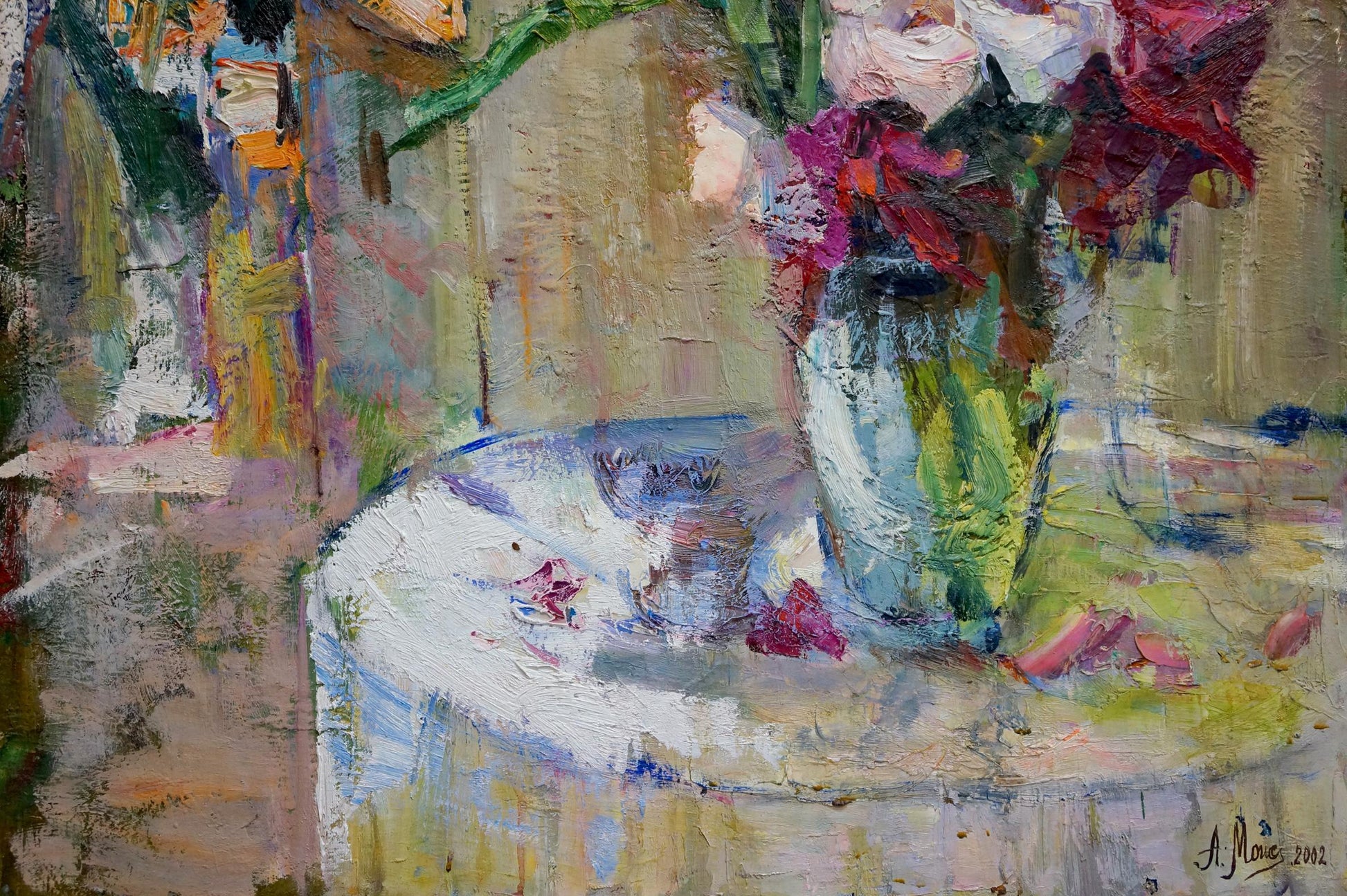 The first personal-joint exhibition "Meeting" of Angela Moiseenko and her husband Vsevolod Sukhorukikh took place in 2004. Sevastopol artists showed their work in the "Green Pyramid" gallery, which will become a hospitable home for their paintings. At the exhibition "Meeting" Angela Moiseenko presented bright paintings with various subjects - Ukrainian flavor and folklore, circus motifs, as well as "living" still lifes with flowers streaming across the canvas.