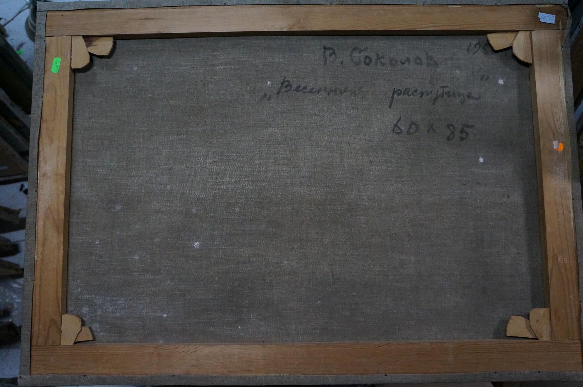 About the artist: Soviet painter. People's Artist of Russia. Laureate of the Stalin Prize of the first degree (1951). Professor of the Department of Painting and Composition of the St. Petersburg State Institute of Painting, Sculpture and Architecture named after I.E. Repin, head of the personal workshop at the painting faculty of the LIZHSA them. I.E. Repin of the Russian Academy of Arts, was the chairman of the Leningrad branch of the Union of Artists of Russia (LOSKh). Laureate of the State Prize in the field of fine arts, awarded with many medals for participation in the Great Patriotic War, a medal of the Order of Merit to the Fatherland, 2nd degree, and others. Born July 31, 1915 in Petrograd. In 1938 he entered the LIZHSA them. I.E. Repin at the All-Russian Academy of Arts. In 1946 he graduated from the institute in the workshop of B.V. Johanson with the title of painting artist. Thesis - the painting "The entry of the Red Army into the liberated Novgorod." In 1946-1949 he studied at the graduate school of the institute. In 1950, for the painting “I. V. Stalin and K. Ye. Voroshilov at the Tsaritsyn Front in 1918 "awarded the degree of Candidate of Art History. From 1945 to 1950 he taught drawing and composition at the Secondary Art School at the Institute of Fine Arts named after I.E. Repin. Since 1949 he has been teaching at the LIZHSA them. I.E. Repin. Professor, head of the personal workshop. Participant of exhibitions since 1946. In the same year he was accepted as a member of the Leningrad Union of Soviet Artists. He writes genre and historical compositions, landscapes, portraits. The works of Vasily Vasilyevich Sokolov are in the State Russian Museum, in museums and private collections in Russia, China, Japan, France, Belgium and other countries. Died in April 2013. Participant of many international, regional and city exhibitions in Moscow and St. Petersburg, in foreign countries: China, France, USA, Canada, Germany, Italy, Spain and others. Sokolov acquired and are in: the Kremlin, the Ministry of Culture, the State Russian Museum, the Art Fund of Russia, museums in Russia (Veliky Novgorod, Krasnoyarsk, Murmansk, Petrozavodsk, etc.), Ukraine, Belarus and other countries of the near and far abroad. Died in April 2013.