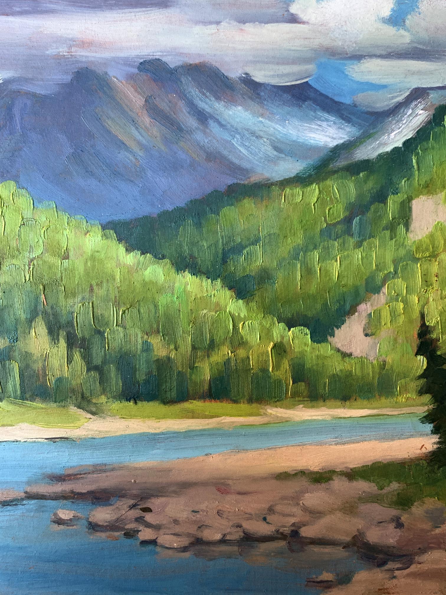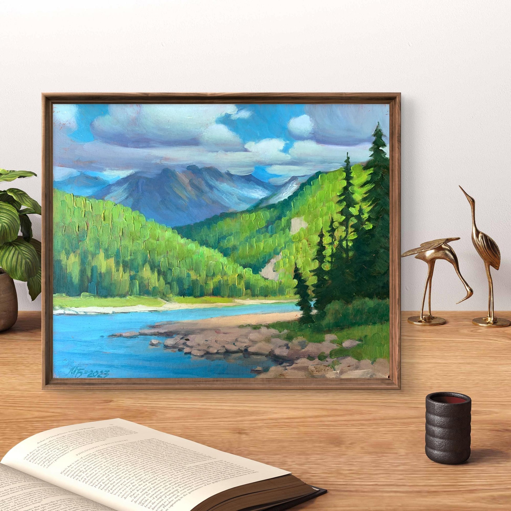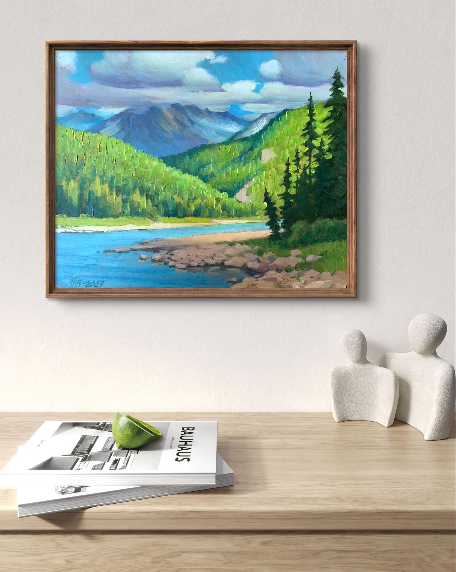 The oil painting titled "Clouds Over the Mountain" presents a breathtaking view of a mountainous landscape, capturing the peaceful beauty of nature in its purest form. The composition features a river winding gently through the valley, with rocky shores and crystal-clear water reflecting the vibrant sky. The calm river leads the viewer’s gaze toward the majestic mountains in the distance, covered in a soft haze. The mountain peaks, painted in muted shades of blue and gray, contrast with the lush green forest that covers the lower slopes and valley. This contrast between the cool tones of the mountains and the warm greens of the trees creates a balanced and harmonious composition, evoking a sense of tranquility and timelessness.The foreground shows the riverbank with scattered stones and patches of grass, painted in earthy tones that enhance the natural feel of the scene. On the right side of the painting, tall pine trees frame the composition, adding depth and balance. The dense forest, with its various shades of green, suggests the richness and vitality of nature during the summer season. The sunlight filters through the trees, creating dappled light on the riverbank and highlighting the vibrant colors of the landscape.The sky above is filled with fluffy white clouds that cast soft shadows over the mountains and forest. The clouds are dynamic and ever-changing, adding a sense of movement and life to the scene. The play of light and shadow on the landscape gives the painting depth and dimension, making the viewer feel as though they are standing in the middle of this peaceful, untouched wilderness. The cool blues of the sky and water balance the warm greens of the land, creating a soothing and calming atmosphere.Through "Clouds Over the Mountain," the artist conveys a message of peace, harmony, and the enduring beauty of nature. The painting invites viewers to pause and appreciate the grandeur of the natural world, reminding them of the importance of finding moments of stillness and reflection. The mountains, standing tall and steady, symbolize strength and resilience, while the river represents life’s journey, flowing steadily forward. The clouds above suggest the passage of time and the ever-changing nature of life, while the landscape remains grounded and timeless.The artist likely aimed to capture the feeling of freedom and connection that comes from being in nature. The painting evokes a sense of awe and respect for the natural world, encouraging viewers to find peace and inspiration in its beauty. "Clouds Over the Mountain" leaves a lasting impression of serenity and balance, reminding viewers of the calming and restorative power of nature. The scene celebrates the harmony between land, water, and sky, offering a moment of tranquility in a busy, modern world.