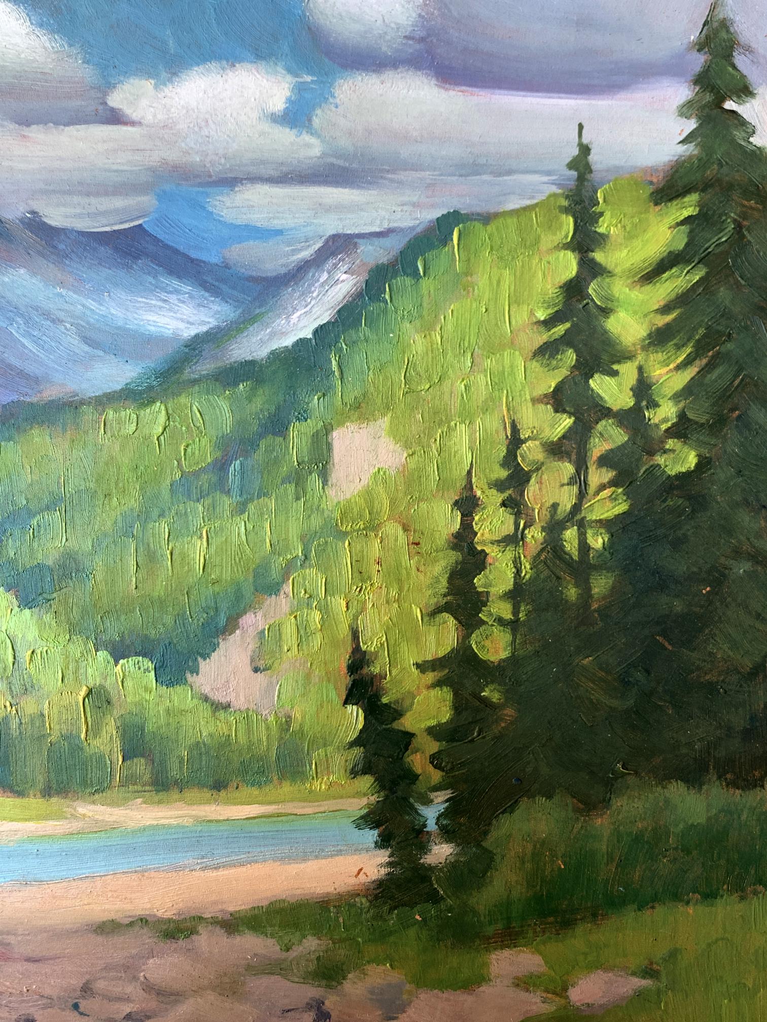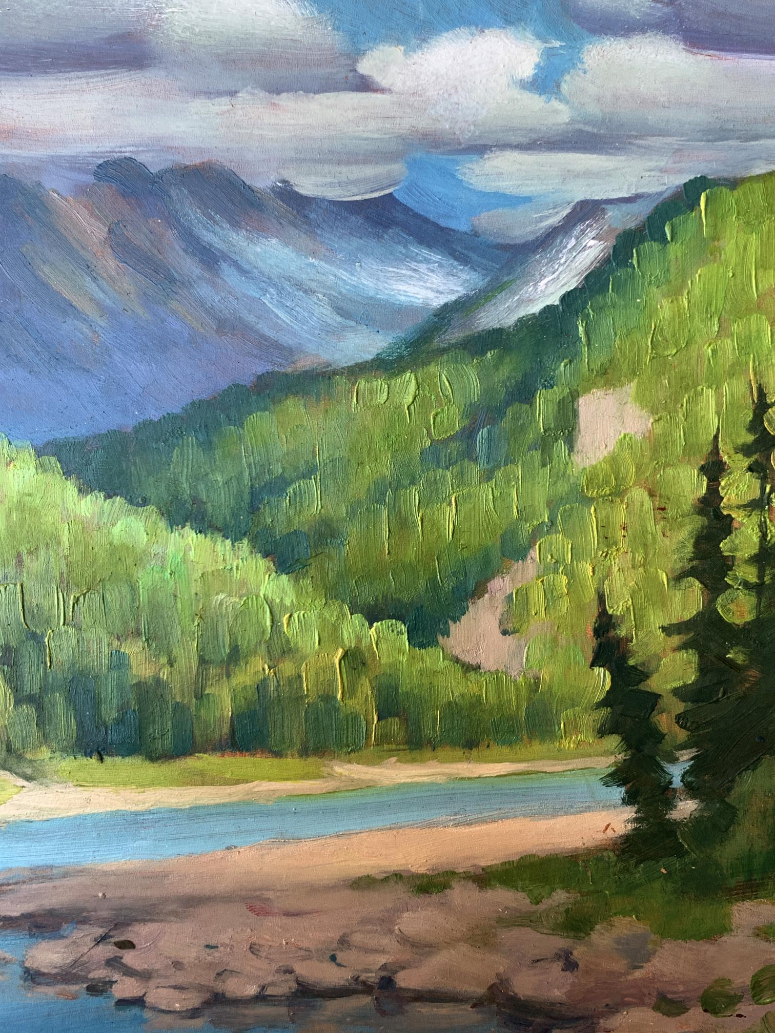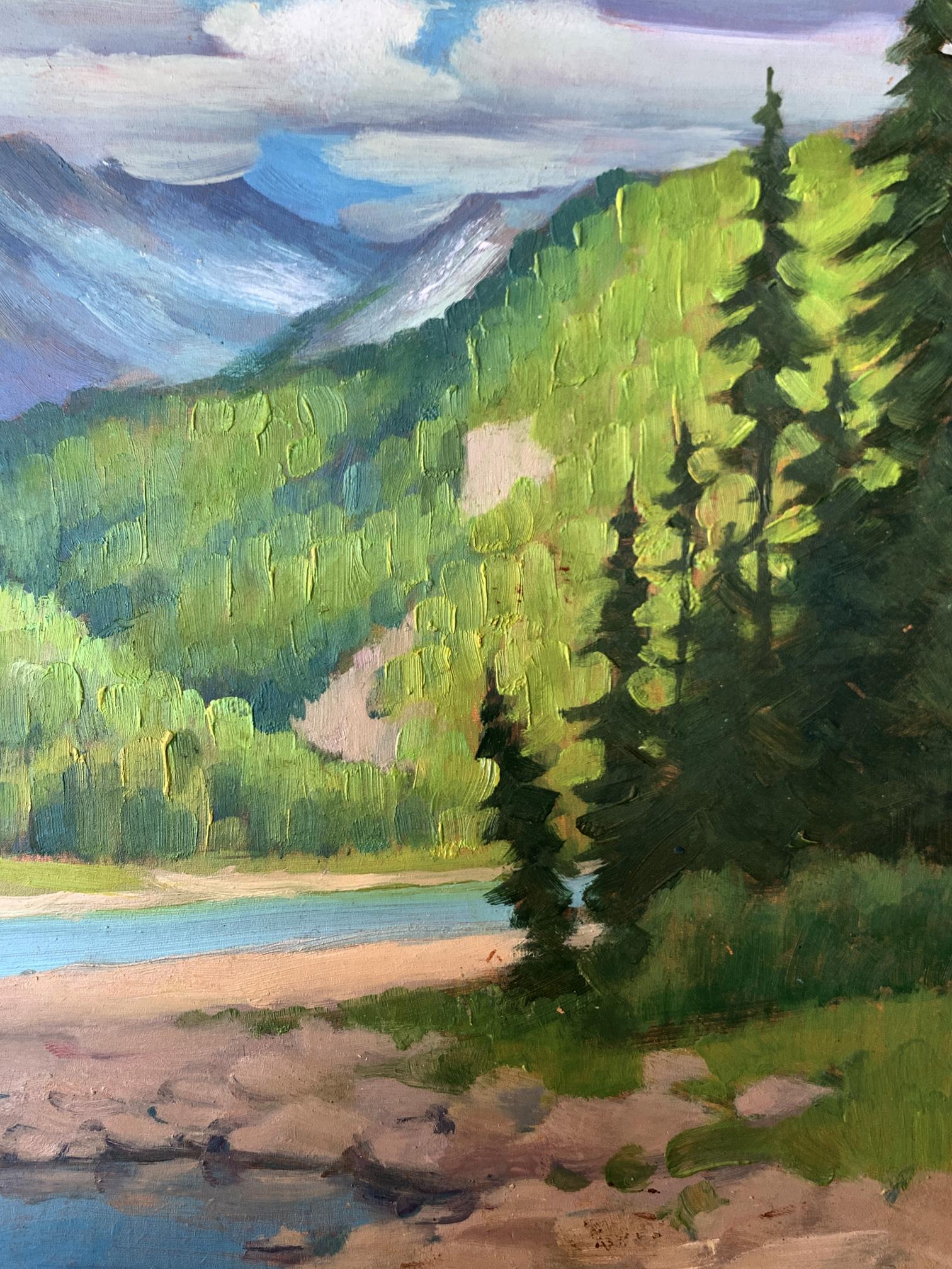 The oil painting titled "Clouds Over the Mountain" presents a breathtaking view of a mountainous landscape, capturing the peaceful beauty of nature in its purest form. The composition features a river winding gently through the valley, with rocky shores and crystal-clear water reflecting the vibrant sky. The calm river leads the viewer’s gaze toward the majestic mountains in the distance, covered in a soft haze. The mountain peaks, painted in muted shades of blue and gray, contrast with the lush green forest that covers the lower slopes and valley. This contrast between the cool tones of the mountains and the warm greens of the trees creates a balanced and harmonious composition, evoking a sense of tranquility and timelessness.The foreground shows the riverbank with scattered stones and patches of grass, painted in earthy tones that enhance the natural feel of the scene. On the right side of the painting, tall pine trees frame the composition, adding depth and balance. The dense forest, with its various shades of green, suggests the richness and vitality of nature during the summer season. The sunlight filters through the trees, creating dappled light on the riverbank and highlighting the vibrant colors of the landscape.The sky above is filled with fluffy white clouds that cast soft shadows over the mountains and forest. The clouds are dynamic and ever-changing, adding a sense of movement and life to the scene. The play of light and shadow on the landscape gives the painting depth and dimension, making the viewer feel as though they are standing in the middle of this peaceful, untouched wilderness. The cool blues of the sky and water balance the warm greens of the land, creating a soothing and calming atmosphere.Through "Clouds Over the Mountain," the artist conveys a message of peace, harmony, and the enduring beauty of nature. The painting invites viewers to pause and appreciate the grandeur of the natural world, reminding them of the importance of finding moments of stillness and reflection. The mountains, standing tall and steady, symbolize strength and resilience, while the river represents life’s journey, flowing steadily forward. The clouds above suggest the passage of time and the ever-changing nature of life, while the landscape remains grounded and timeless.The artist likely aimed to capture the feeling of freedom and connection that comes from being in nature. The painting evokes a sense of awe and respect for the natural world, encouraging viewers to find peace and inspiration in its beauty. "Clouds Over the Mountain" leaves a lasting impression of serenity and balance, reminding viewers of the calming and restorative power of nature. The scene celebrates the harmony between land, water, and sky, offering a moment of tranquility in a busy, modern world.