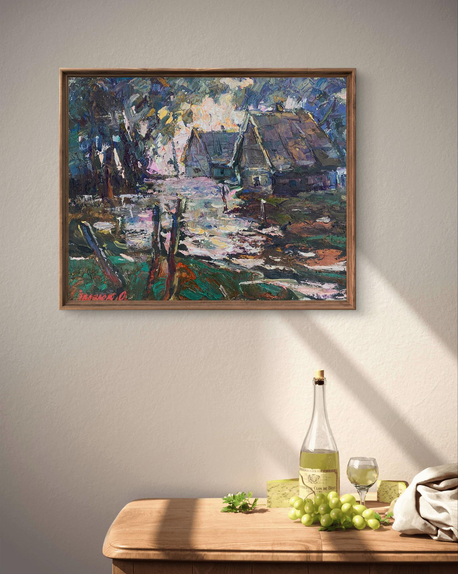 The painting titled "Country Night" depicts a quiet rural scene with traditional village houses nestled under a moody, twilight sky. The artwork is created with bold, expressive brushstrokes using a palette knife technique, giving it a distinctive textured surface that brings depth and emotion to the piece. The artist masterfully captures the atmosphere of a peaceful evening in the countryside, where nature and human dwellings coexist in harmony. The foreground features a rustic path or a muddy road leading to the houses. The ground is painted in rich, dark tones of green, brown, and earthy reds, with subtle reflections of light from the sky above. The thick application of paint in this area gives the road a rough, uneven texture, emphasizing the natural, untamed character of the countryside. In the lower part of the foreground, there are wooden fence posts leaning slightly, suggesting the passage of time and the rural charm of a simple village life. The bright spots of red, teal, and orange add warmth to the earthy tones, creating a dynamic contrast that draws the viewer’s attention to the details of the scene. The middle ground is dominated by two village houses with steep, pitched roofs. The houses are painted in a combination of cool blues, grays, and muted browns, suggesting that they are bathed in the fading light of dusk. The use of darker tones and shadows on the houses creates a sense of mystery and tranquility, evoking the peaceful silence of nightfall. Between the houses, there is a soft, diffused light that suggests the last traces of sunset or moonlight reflecting on a puddle or a path. This light brings a dreamlike quality to the scene, making the viewer feel the cool, calm air of a rural night. The background is a dense cluster of trees and foliage, painted in deep shades of emerald green, purple, and dark blue. The trees appear abstract and blend seamlessly into the night sky, creating a natural curtain that frames the houses. The sky above is painted in a mix of cool blues, violets, and subtle pinks, giving the impression of a twilight sky transitioning into night. The swirling brushstrokes in the sky add a sense of movement, suggesting a gentle breeze passing through the village. The overall mood of the painting is calm and contemplative, evoking the stillness of a countryside night. The combination of dark, rich tones with soft, glowing light creates a sense of balance between tranquility and mystery. The viewer can almost hear the distant sounds of nature — rustling leaves, chirping crickets, and the gentle rustle of the wind through the trees. The painting captures the timeless beauty of rural life, portraying a moment of peace and simplicity. The contrast between the rough textures of the land and the soft, fading light symbolizes the enduring connection between humans and nature. "Country Night" is a beautifully executed landscape that captures the quiet charm of a rural village at twilight. Through the use of bold colors, thick textures, and expressive brushstrokes, the artist conveys the mood and atmosphere of a peaceful evening in the countryside. The painting invites the viewer to experience the serenity and mystery of village life, reminding us of the simple pleasures of nature and the passage of time.