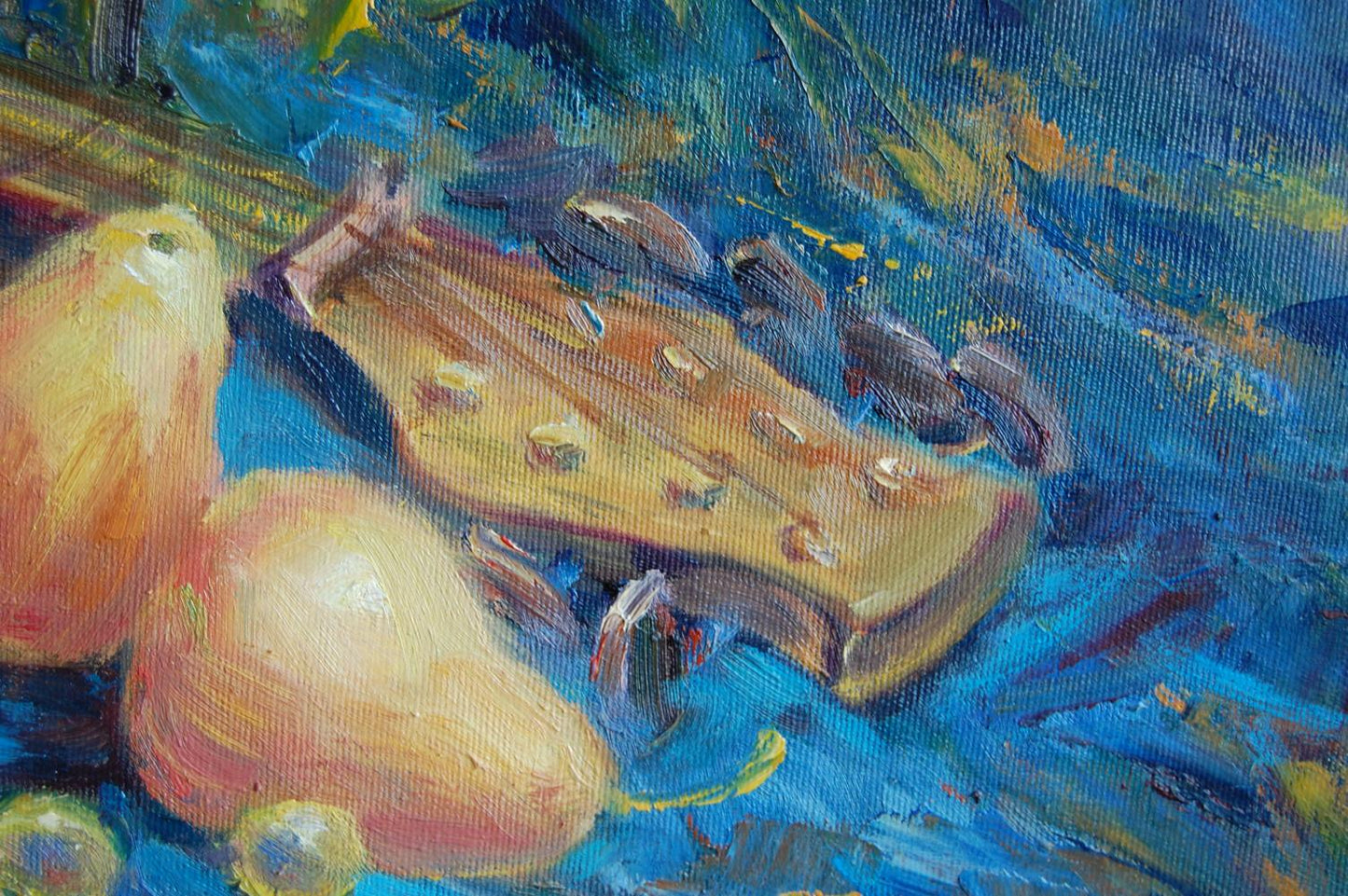 Artim Olga’s use of vibrant color, from the autumnal leaves to the cool blues of the background, adds dynamic energy to the composition, while the careful interplay of light and shadow enhances the atmosphere. The contrast between the natural pheasant and the man-made objects creates a harmonious balance that reflects the artist’s ability to merge the wild with the domestic. The intricate details of the bird and the lush fruits add depth to this piece, making it a standout in any Collection of Painting with Flowers and other still-life elements.