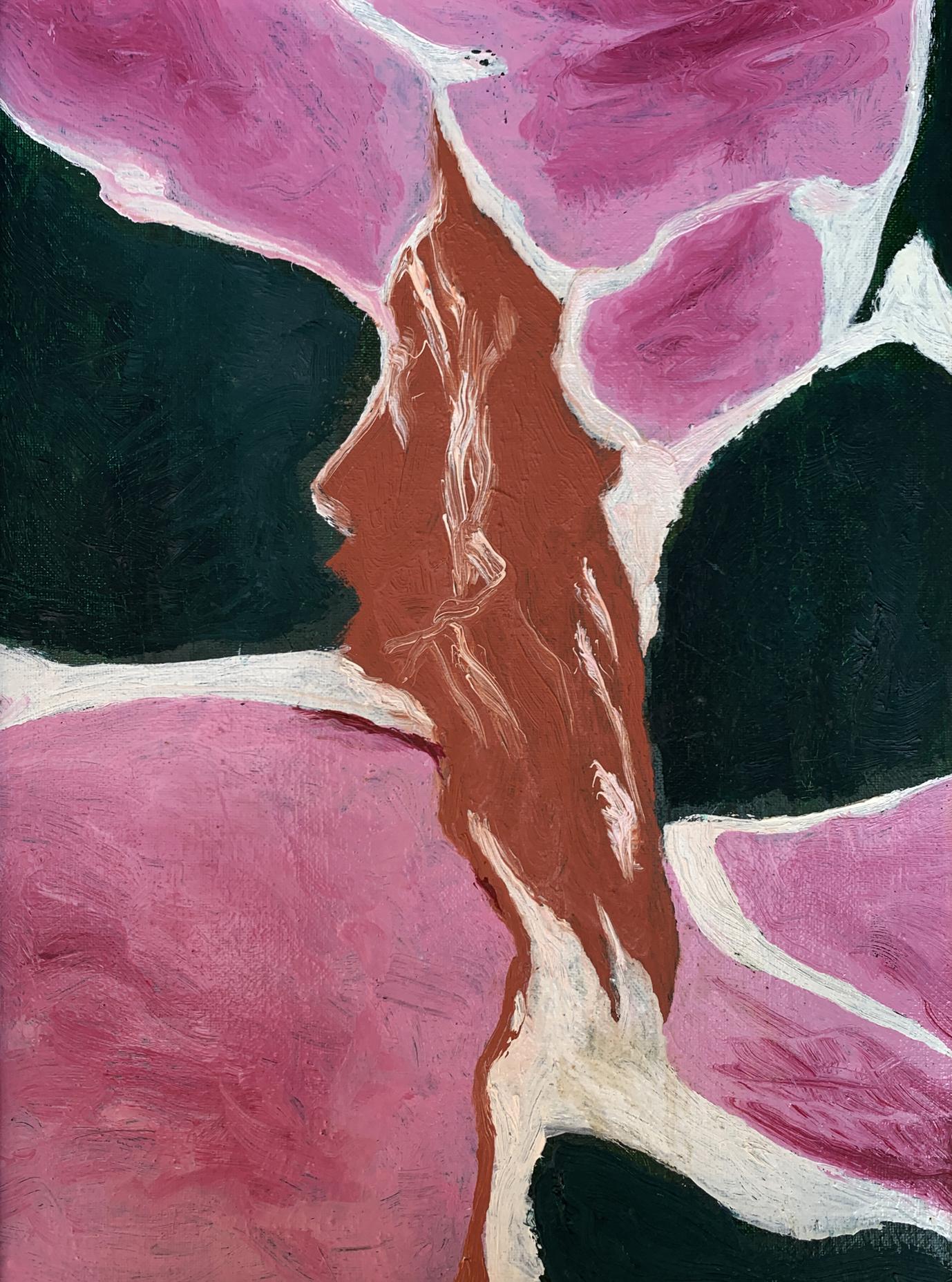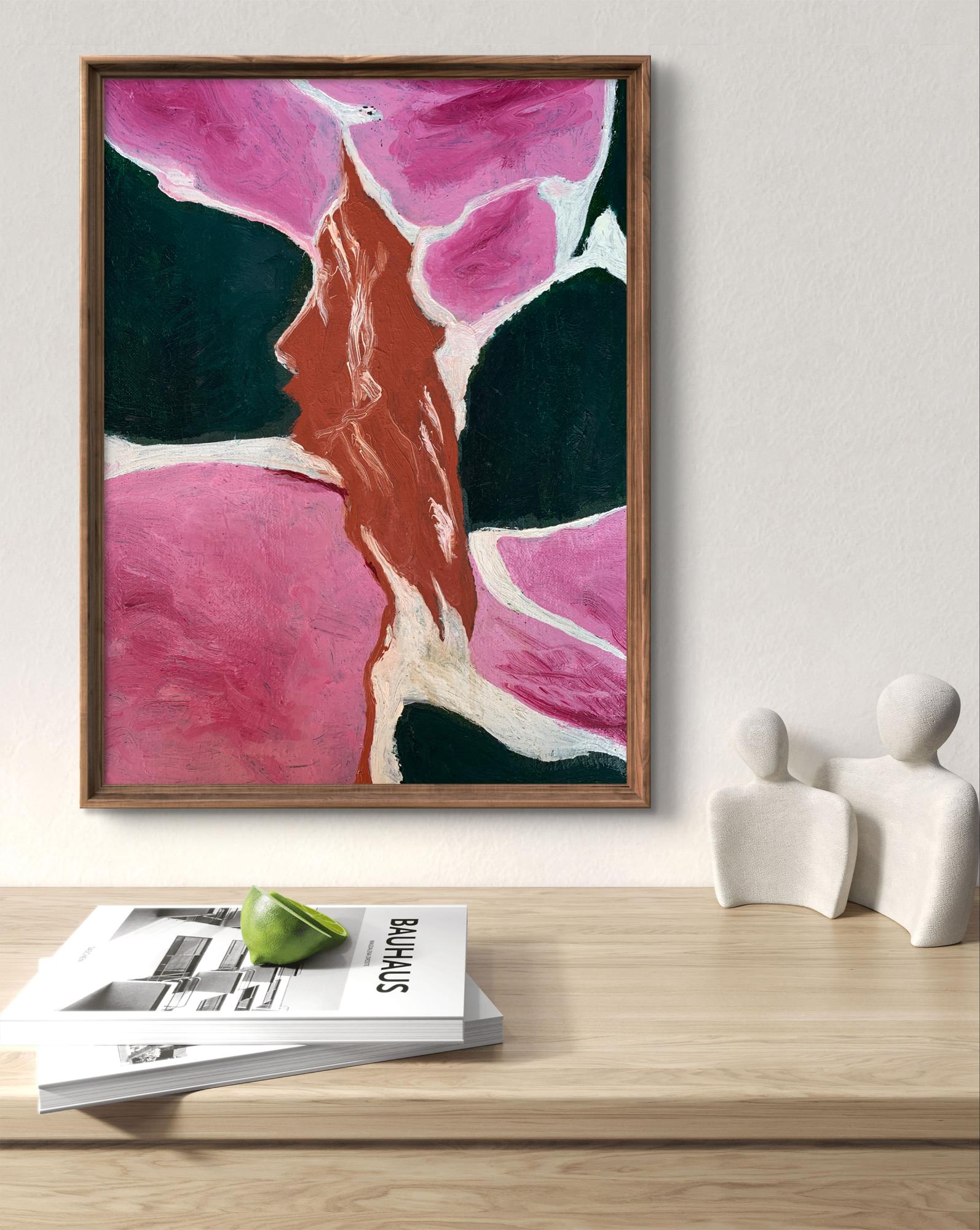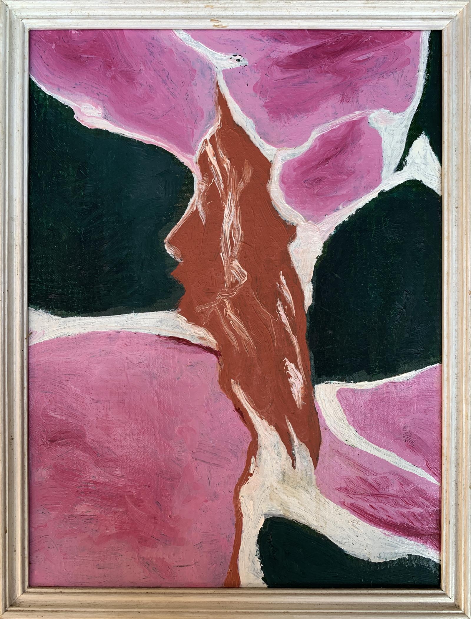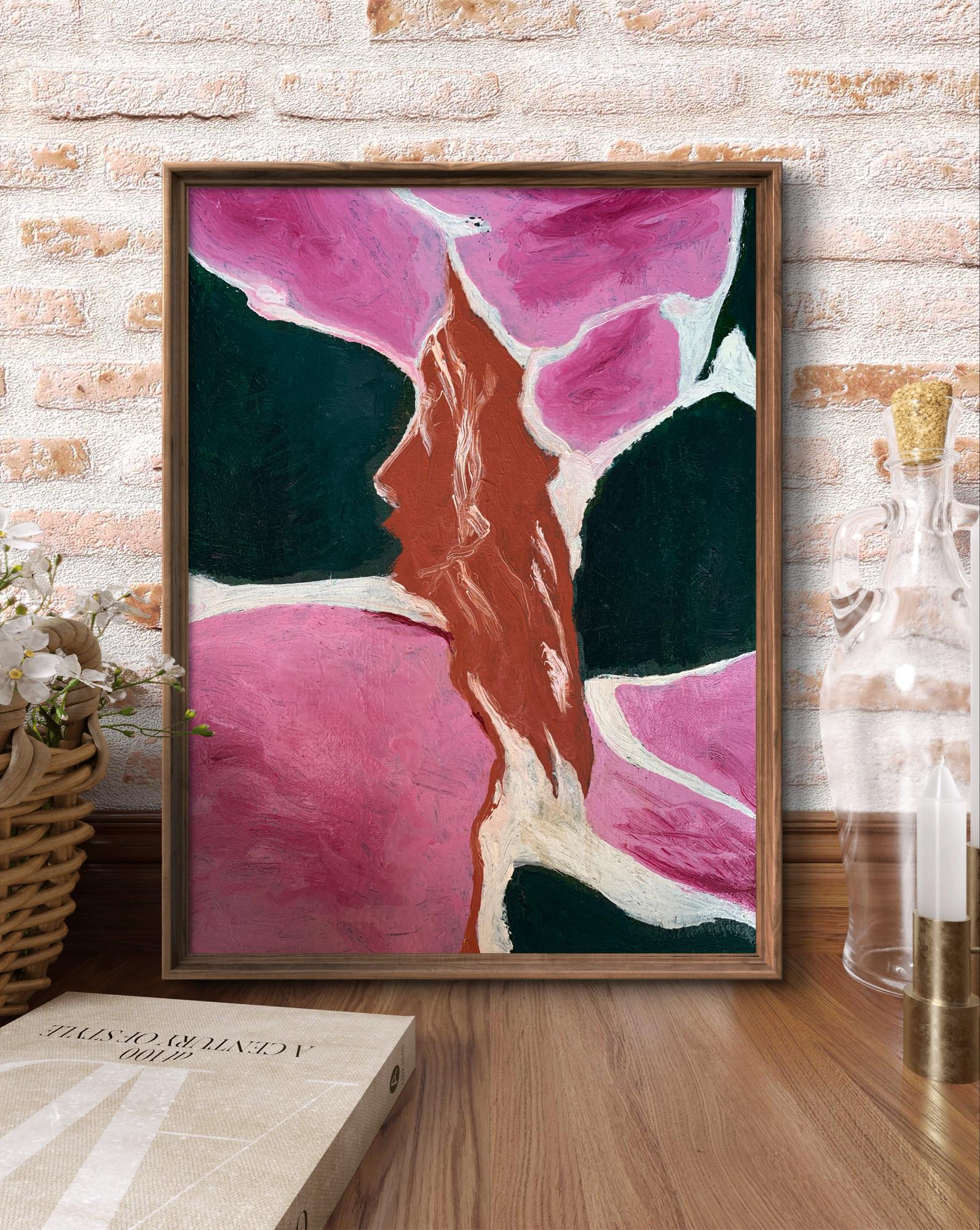The painting titled "Disappearing Thoughts", created with oil on canvas, explores the ephemeral and intangible nature of human thoughts and emotions. The composition is abstract yet evocative, with its interplay of bold colors and organic shapes forming a visual metaphor for the fleeting nature of mental processes.At the center of the artwork is a subtle silhouette of a human profile, rendered in earthy brown tones. The profile appears to emerge from, or perhaps dissolve into, the surrounding vibrant pink and deep green forms. This central figure is not sharply defined, symbolizing the transient and fluid nature of thoughts and memories as they come and go, often without clear boundaries or permanence.The dominant pink hues evoke a sense of warmth and vulnerability, while the contrasting dark green adds depth and introspection to the piece. The interplay between these two colors creates a sense of tension and balance, representing the duality of clarity and chaos within the human mind. The use of white lines and spaces between the shapes further emphasizes the fragmentation and disconnection that often characterize fleeting thoughts.The brushstrokes are expressive and textured, giving the painting a dynamic and almost tactile quality. The layering of colors and the subtle blending of shades suggest movement and change, reinforcing the theme of thoughts dissipating or transforming over time.Through "Disappearing Thoughts," the artist conveys a profound exploration of the subconscious mind. The painting invites viewers to reflect on their own internal landscapes—the moments of clarity, the fading of memories, and the elusive nature of ideas. It captures the beauty and fragility of human cognition, reminding us that while thoughts may vanish, the emotions and impressions they leave behind are often enduring. This artwork serves as both a meditation on the impermanence of mental experiences and a celebration of the creativity that arises from the mind’s fluidity.