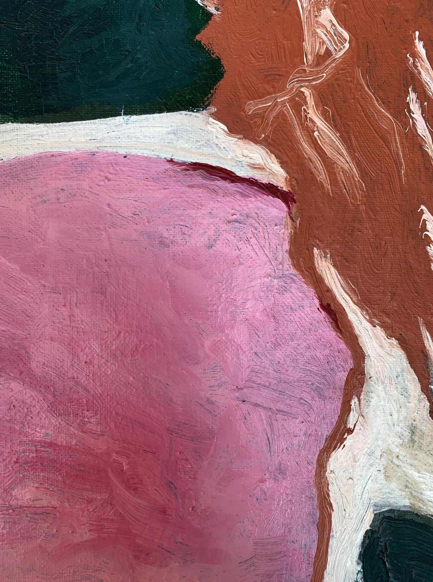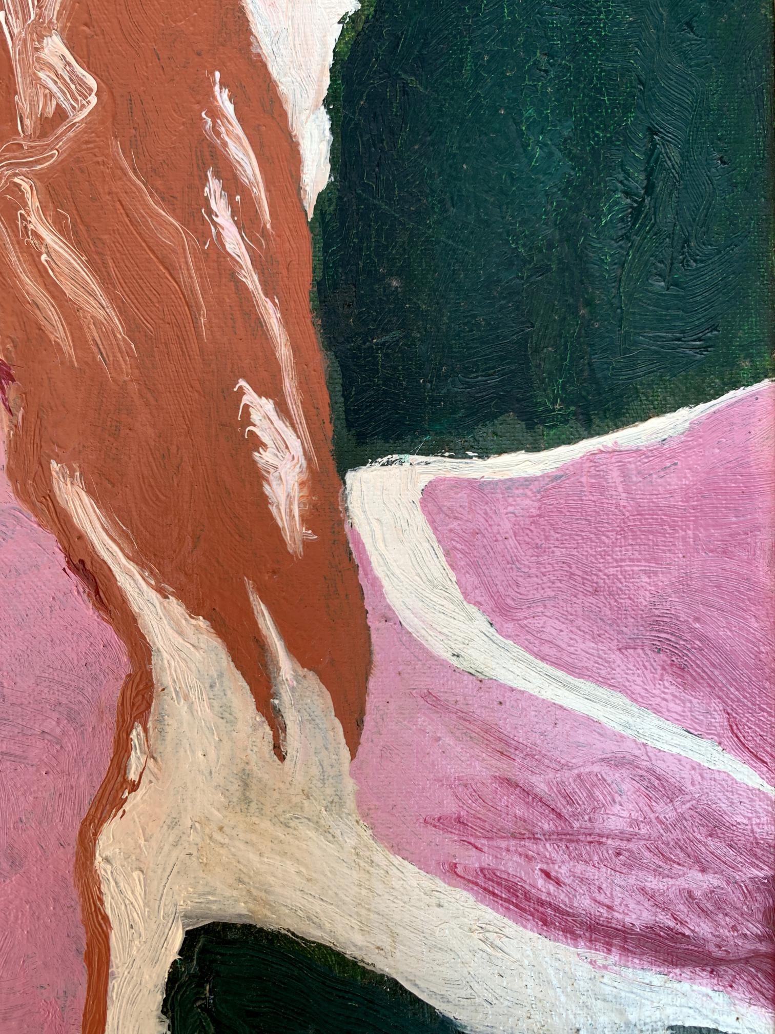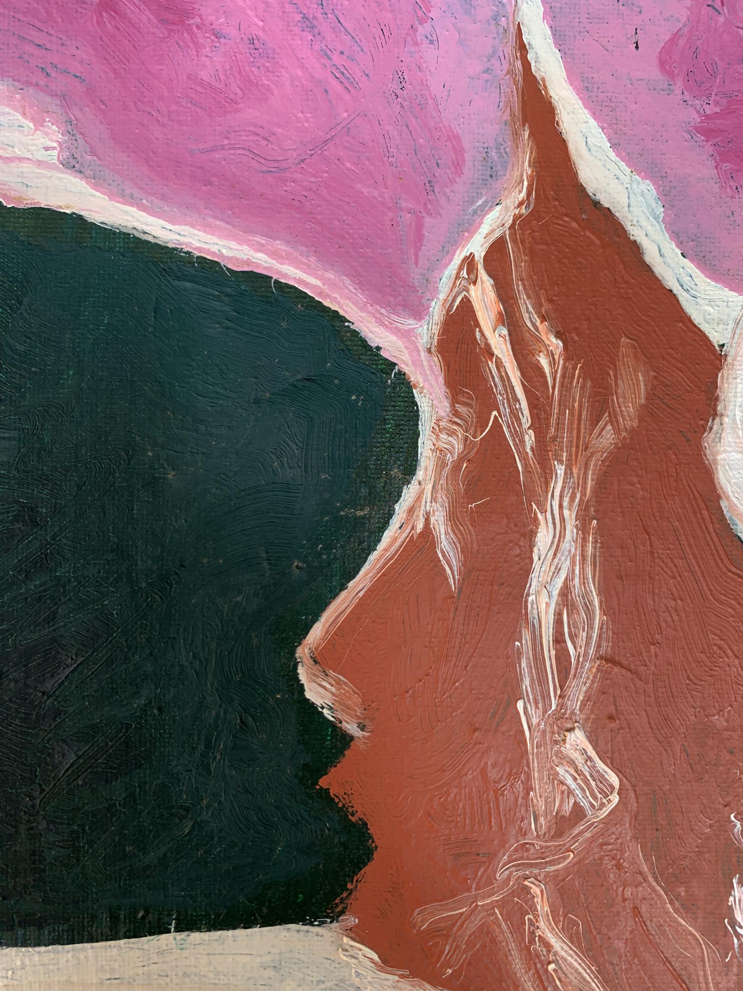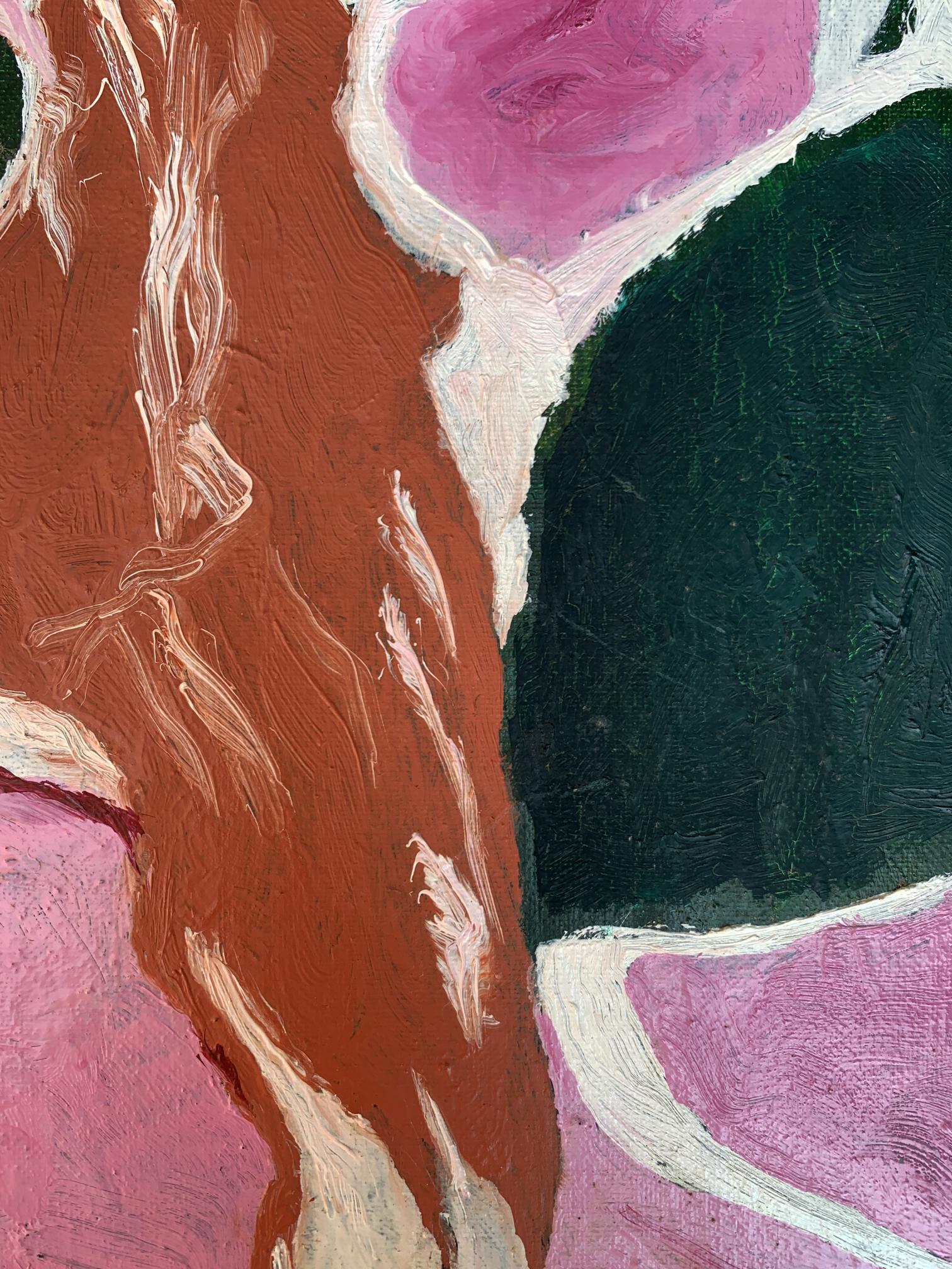 The painting titled "Disappearing Thoughts", created with oil on canvas, explores the ephemeral and intangible nature of human thoughts and emotions. The composition is abstract yet evocative, with its interplay of bold colors and organic shapes forming a visual metaphor for the fleeting nature of mental processes.At the center of the artwork is a subtle silhouette of a human profile, rendered in earthy brown tones. The profile appears to emerge from, or perhaps dissolve into, the surrounding vibrant pink and deep green forms. This central figure is not sharply defined, symbolizing the transient and fluid nature of thoughts and memories as they come and go, often without clear boundaries or permanence.The dominant pink hues evoke a sense of warmth and vulnerability, while the contrasting dark green adds depth and introspection to the piece. The interplay between these two colors creates a sense of tension and balance, representing the duality of clarity and chaos within the human mind. The use of white lines and spaces between the shapes further emphasizes the fragmentation and disconnection that often characterize fleeting thoughts.The brushstrokes are expressive and textured, giving the painting a dynamic and almost tactile quality. The layering of colors and the subtle blending of shades suggest movement and change, reinforcing the theme of thoughts dissipating or transforming over time.Through "Disappearing Thoughts," the artist conveys a profound exploration of the subconscious mind. The painting invites viewers to reflect on their own internal landscapes—the moments of clarity, the fading of memories, and the elusive nature of ideas. It captures the beauty and fragility of human cognition, reminding us that while thoughts may vanish, the emotions and impressions they leave behind are often enduring. This artwork serves as both a meditation on the impermanence of mental experiences and a celebration of the creativity that arises from the mind’s fluidity.