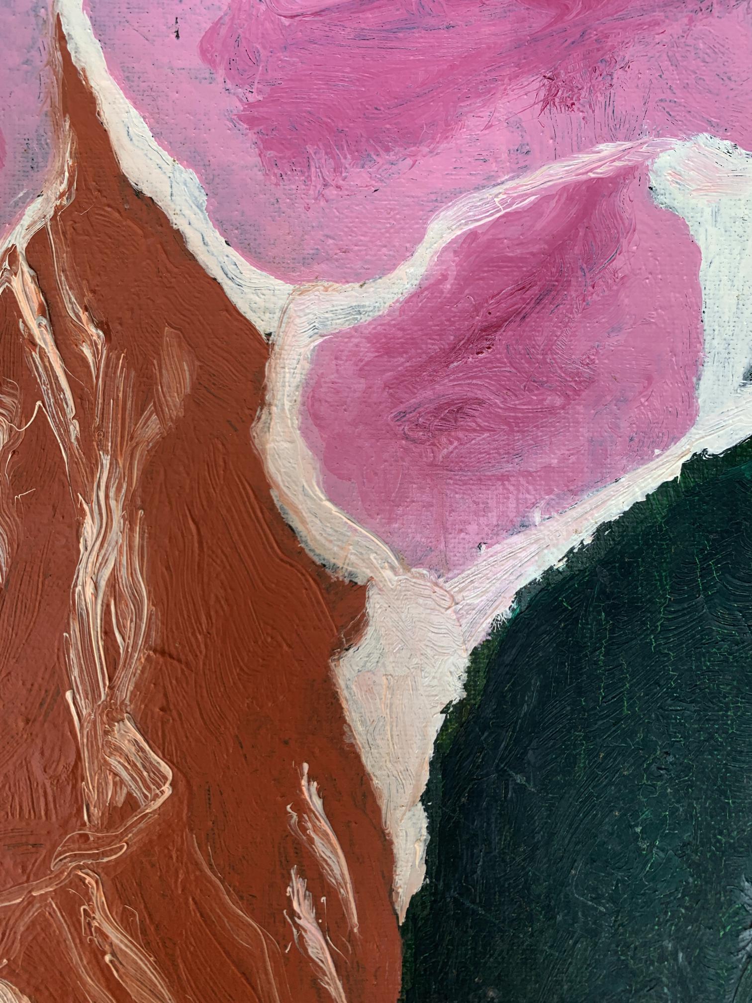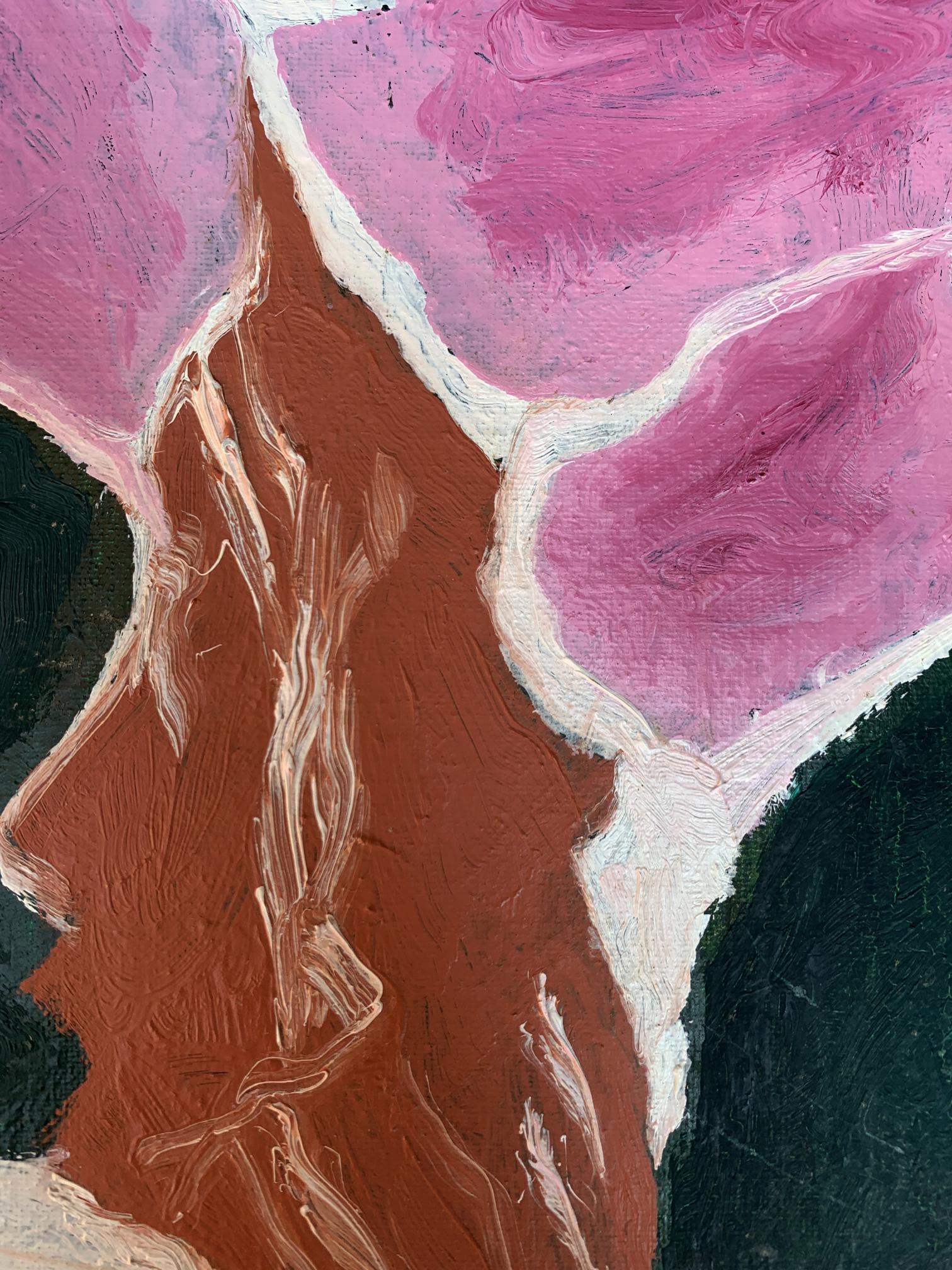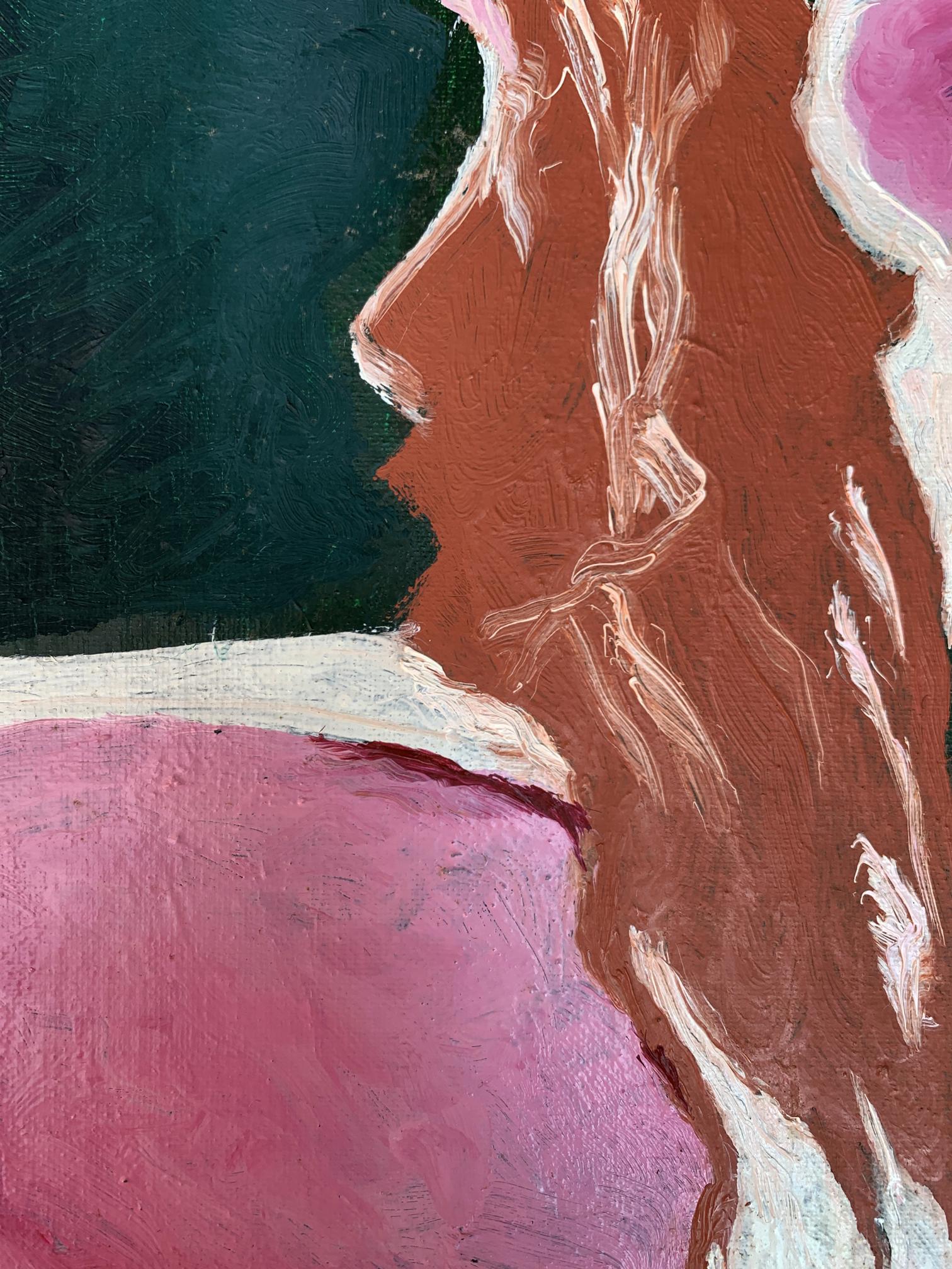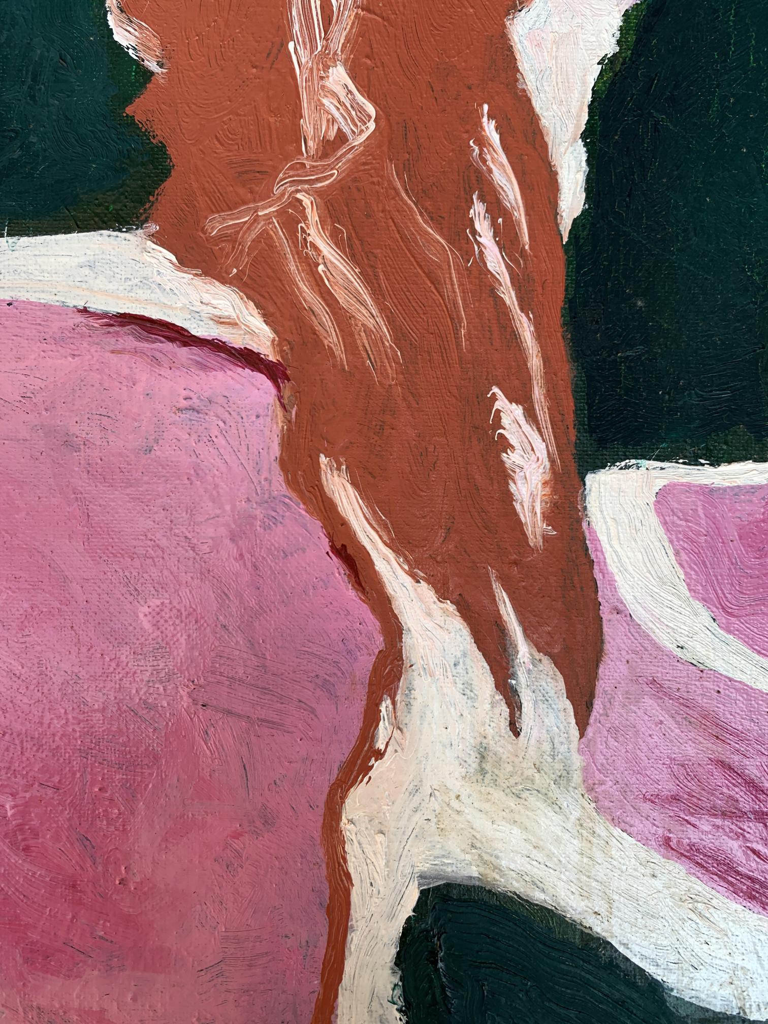 The painting titled "Disappearing Thoughts", created with oil on canvas, explores the ephemeral and intangible nature of human thoughts and emotions. The composition is abstract yet evocative, with its interplay of bold colors and organic shapes forming a visual metaphor for the fleeting nature of mental processes.At the center of the artwork is a subtle silhouette of a human profile, rendered in earthy brown tones. The profile appears to emerge from, or perhaps dissolve into, the surrounding vibrant pink and deep green forms. This central figure is not sharply defined, symbolizing the transient and fluid nature of thoughts and memories as they come and go, often without clear boundaries or permanence.The dominant pink hues evoke a sense of warmth and vulnerability, while the contrasting dark green adds depth and introspection to the piece. The interplay between these two colors creates a sense of tension and balance, representing the duality of clarity and chaos within the human mind. The use of white lines and spaces between the shapes further emphasizes the fragmentation and disconnection that often characterize fleeting thoughts.The brushstrokes are expressive and textured, giving the painting a dynamic and almost tactile quality. The layering of colors and the subtle blending of shades suggest movement and change, reinforcing the theme of thoughts dissipating or transforming over time.Through "Disappearing Thoughts," the artist conveys a profound exploration of the subconscious mind. The painting invites viewers to reflect on their own internal landscapes—the moments of clarity, the fading of memories, and the elusive nature of ideas. It captures the beauty and fragility of human cognition, reminding us that while thoughts may vanish, the emotions and impressions they leave behind are often enduring. This artwork serves as both a meditation on the impermanence of mental experiences and a celebration of the creativity that arises from the mind’s fluidity.