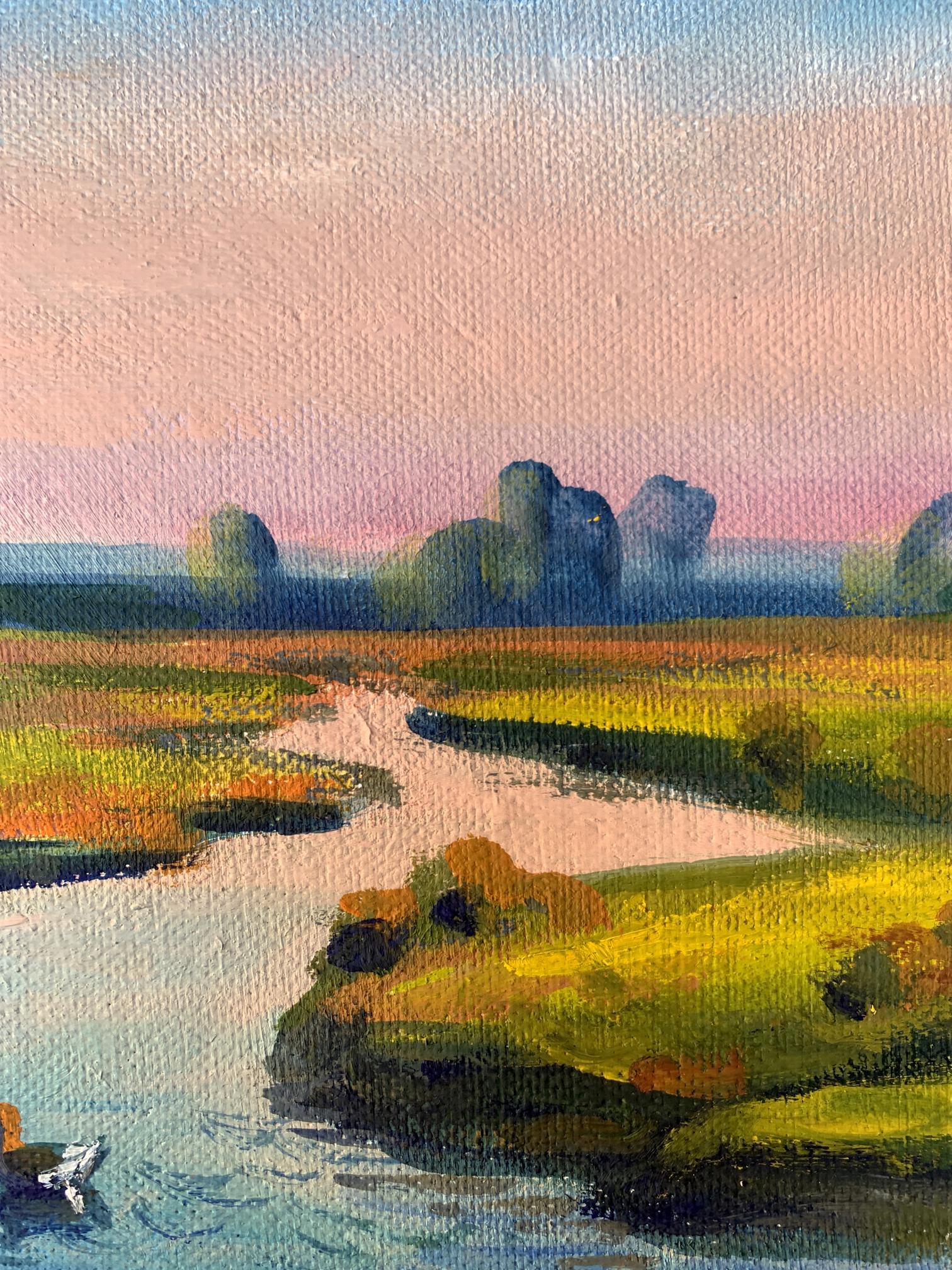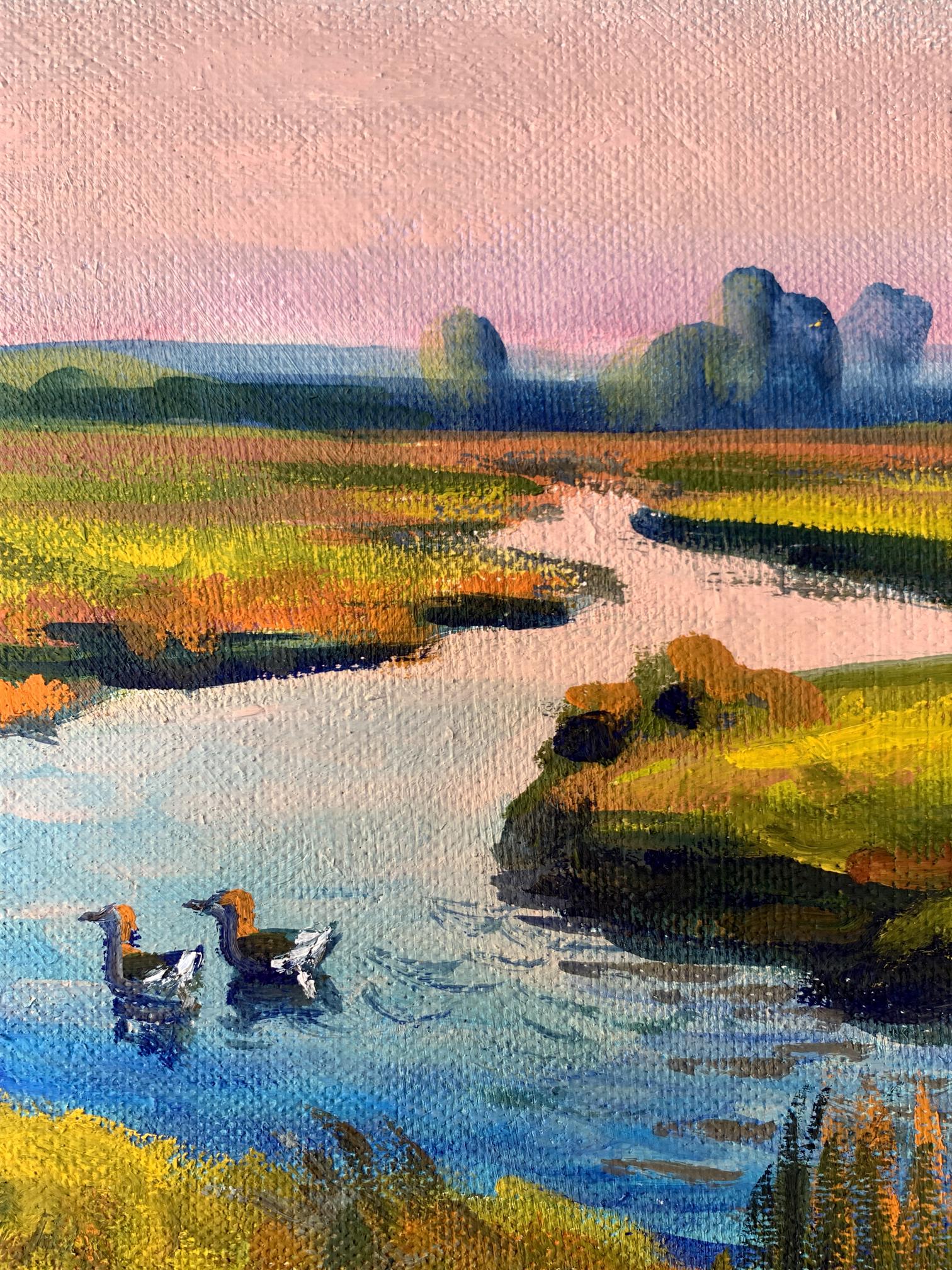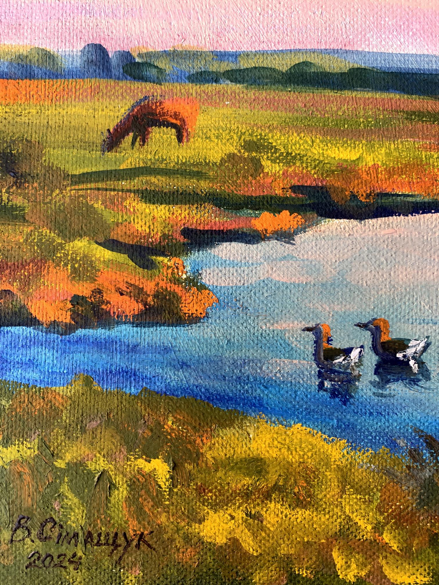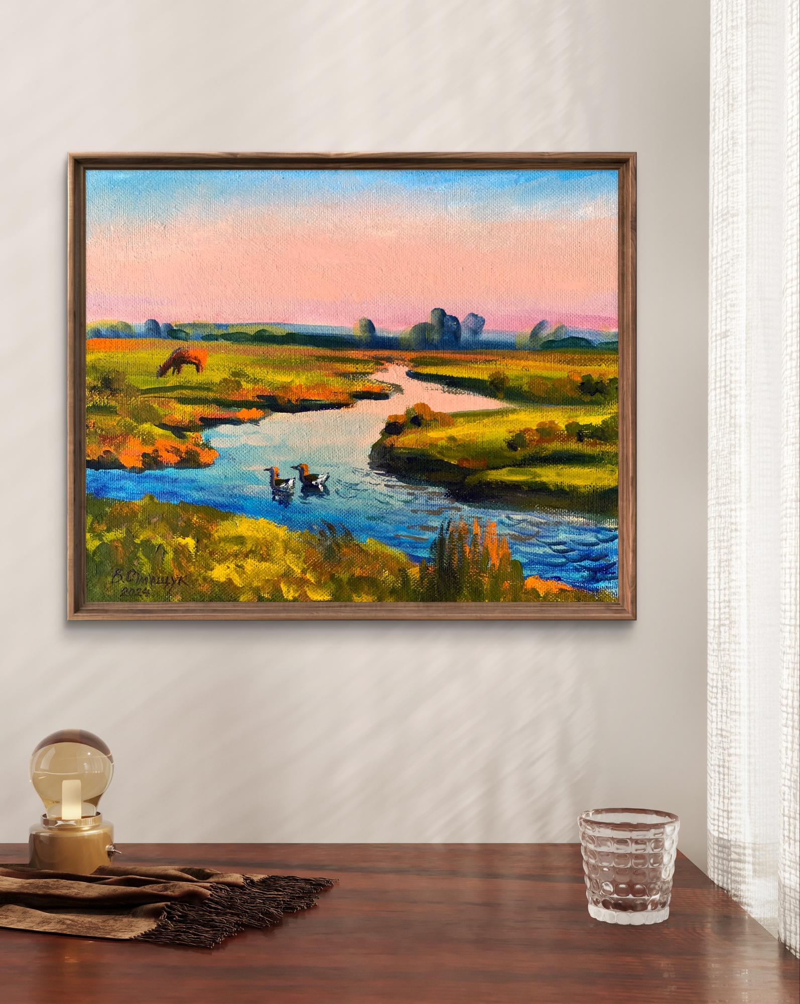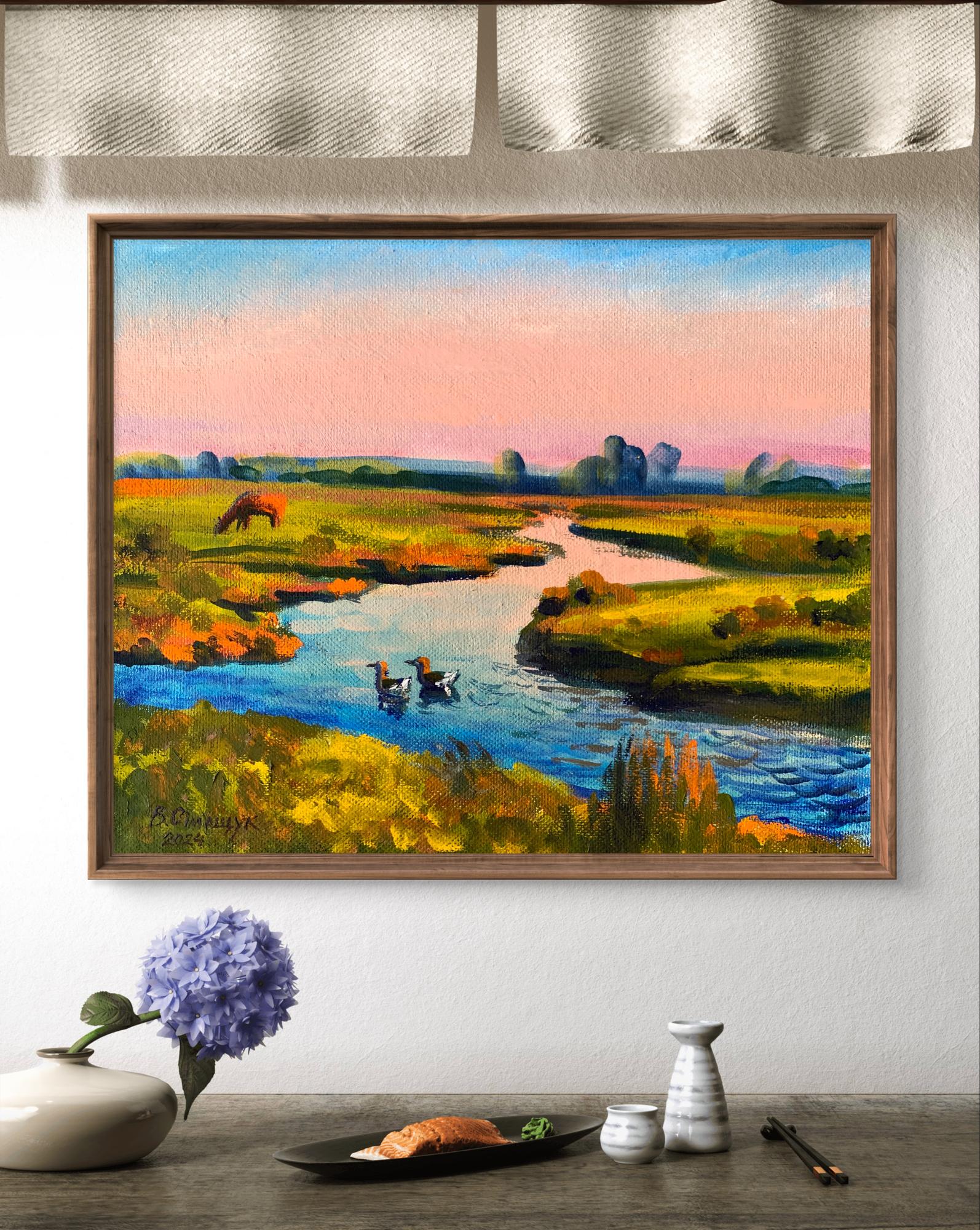 The painting "Ducks in the River", created with oil on cardboard, is a serene portrayal of a picturesque rural landscape, brimming with life and tranquility. The composition centers around a meandering river, its waters shimmering in hues of blue and reflecting the warm tones of the surrounding environment. Two ducks glide effortlessly across the surface, their gentle movements bringing a sense of peaceful activity to the scene.The river cuts through lush green fields, dotted with warm orange and yellow accents, indicating the seasonal transition into late summer or early autumn. In the distance, a lone horse grazes calmly, adding to the idyllic rural charm. The horizon features soft silhouettes of trees, their forms merging with the hazy pink and blue sky above. The sky itself is a masterpiece of gradation, transitioning from the golden warmth of a setting sun to the cool blues of approaching twilight.The artist has skillfully captured the harmonious coexistence of nature's elements—water, land, sky, and living creatures. The vibrant yet balanced color palette evokes a sense of warmth, comfort, and nostalgia. The interplay between the stillness of the fields and the gentle flow of the river emphasizes the beauty of rural life, unhurried and deeply connected to nature.Through "Ducks in the River," the artist invites the viewer to appreciate the simplicity and serenity of a pastoral setting. The painting conveys a message of contentment and harmony, urging us to find peace in the quiet beauty of nature. It is a celebration of life’s gentle rhythms, where even the smallest details—a duck gliding, a horse grazing—carry profound meaning and charm.