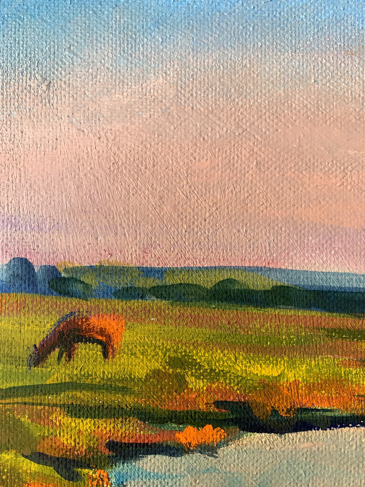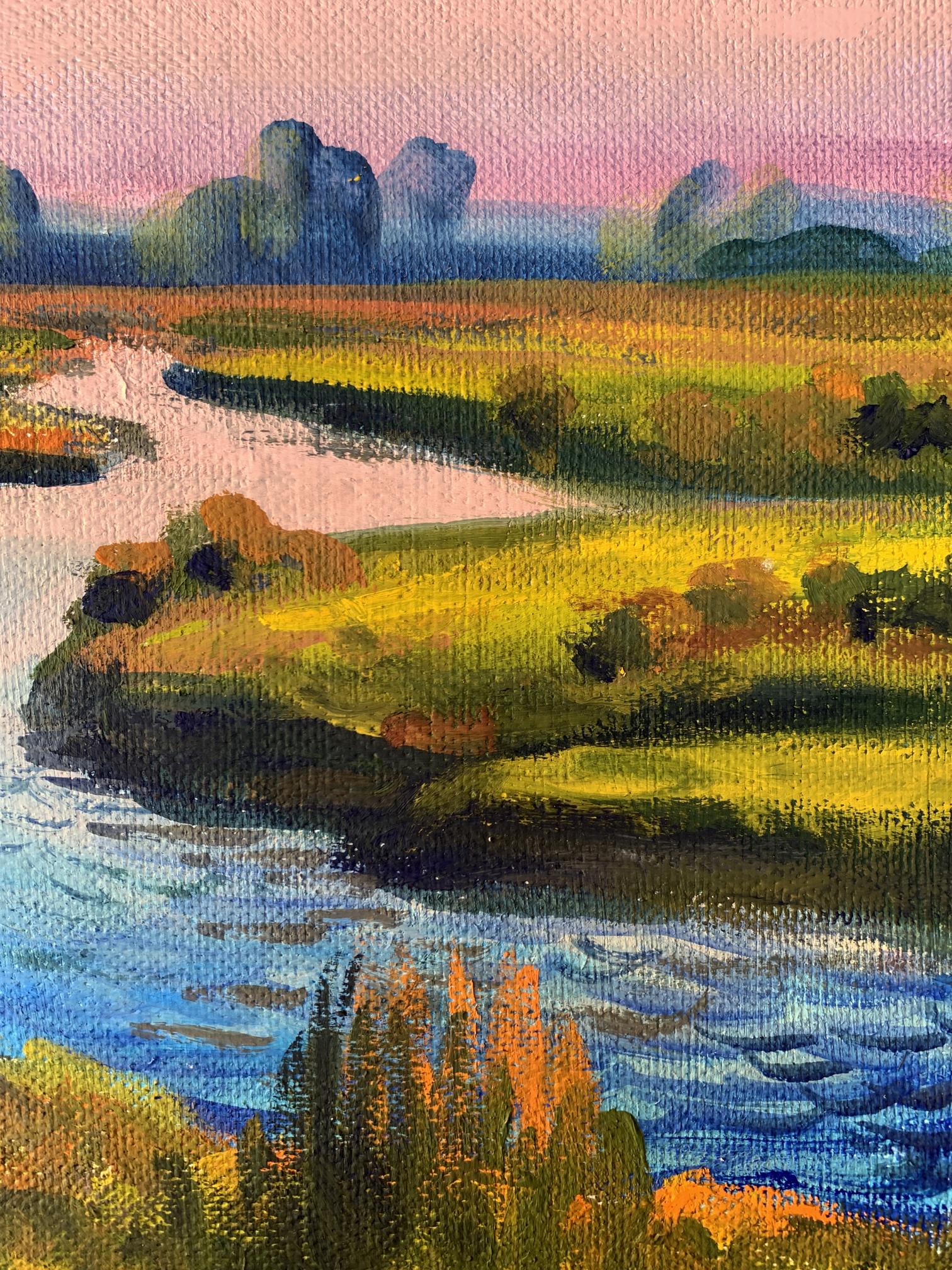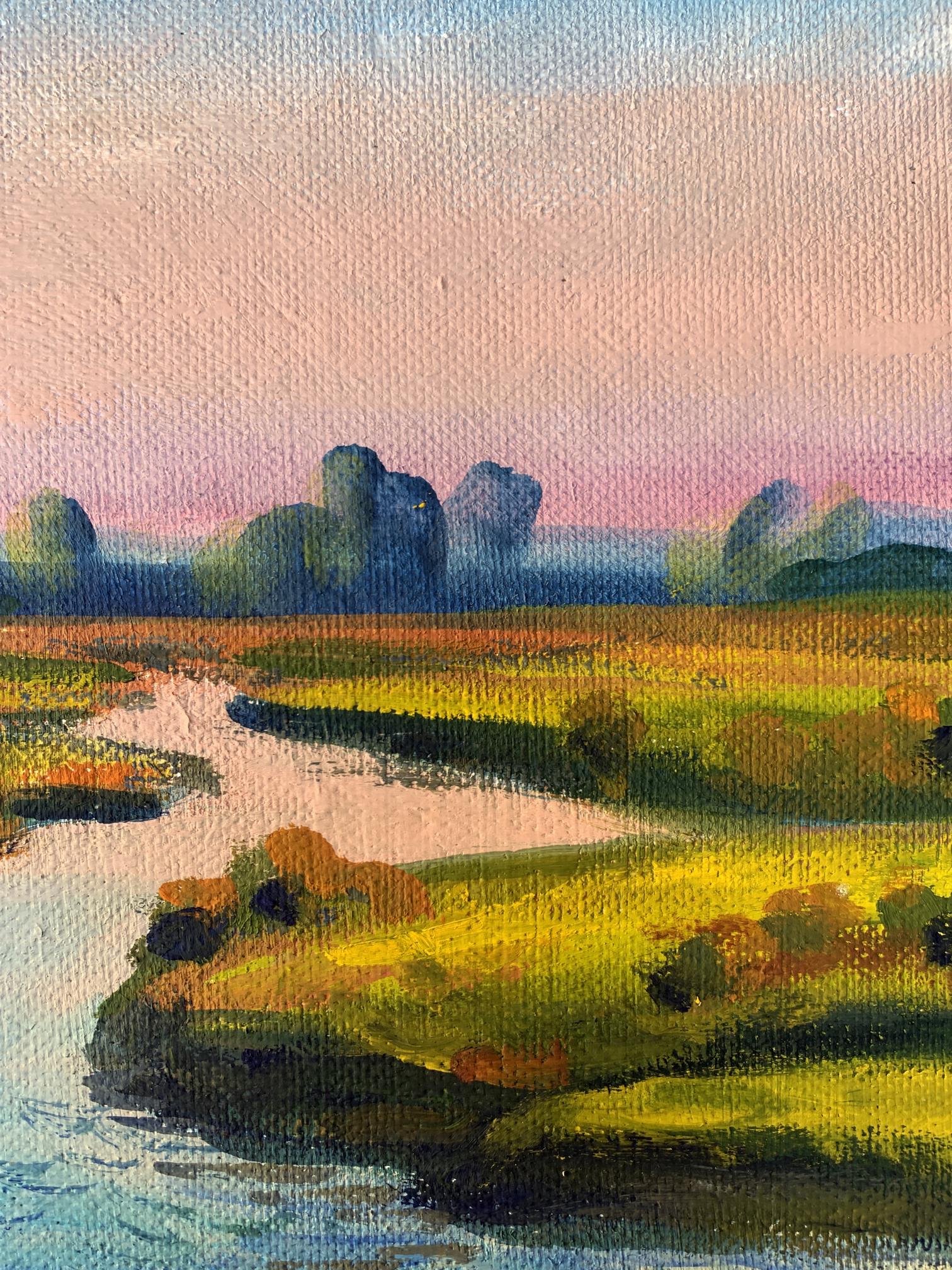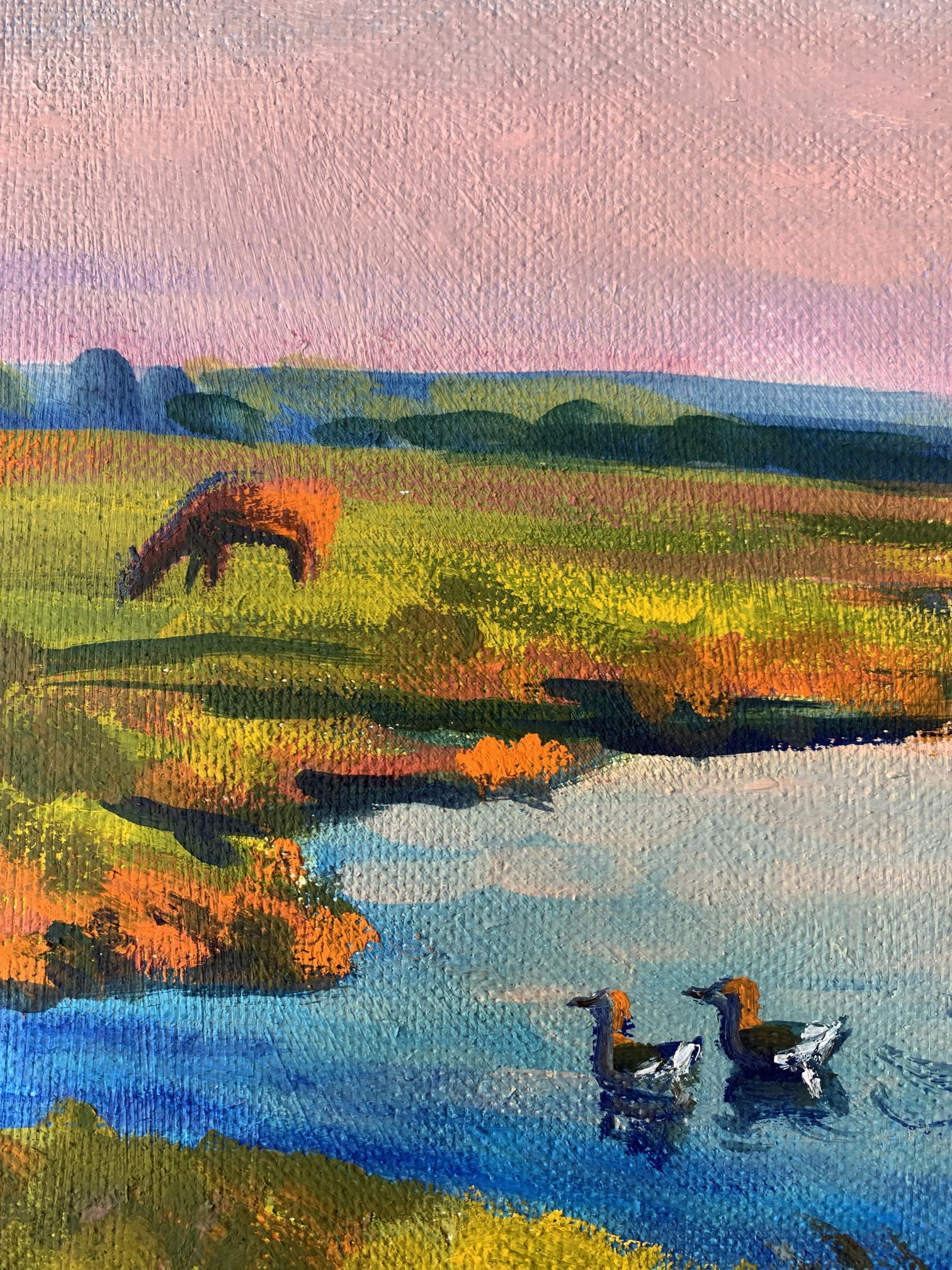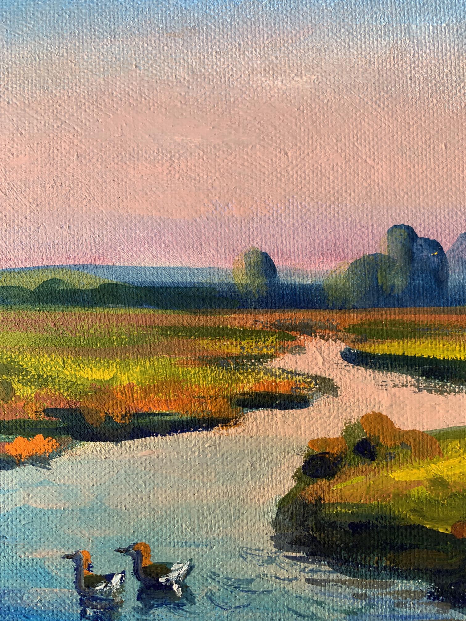 The painting "Ducks in the River", created with oil on cardboard, is a serene portrayal of a picturesque rural landscape, brimming with life and tranquility. The composition centers around a meandering river, its waters shimmering in hues of blue and reflecting the warm tones of the surrounding environment. Two ducks glide effortlessly across the surface, their gentle movements bringing a sense of peaceful activity to the scene.The river cuts through lush green fields, dotted with warm orange and yellow accents, indicating the seasonal transition into late summer or early autumn. In the distance, a lone horse grazes calmly, adding to the idyllic rural charm. The horizon features soft silhouettes of trees, their forms merging with the hazy pink and blue sky above. The sky itself is a masterpiece of gradation, transitioning from the golden warmth of a setting sun to the cool blues of approaching twilight.The artist has skillfully captured the harmonious coexistence of nature's elements—water, land, sky, and living creatures. The vibrant yet balanced color palette evokes a sense of warmth, comfort, and nostalgia. The interplay between the stillness of the fields and the gentle flow of the river emphasizes the beauty of rural life, unhurried and deeply connected to nature.Through "Ducks in the River," the artist invites the viewer to appreciate the simplicity and serenity of a pastoral setting. The painting conveys a message of contentment and harmony, urging us to find peace in the quiet beauty of nature. It is a celebration of life’s gentle rhythms, where even the smallest details—a duck gliding, a horse grazing—carry profound meaning and charm.