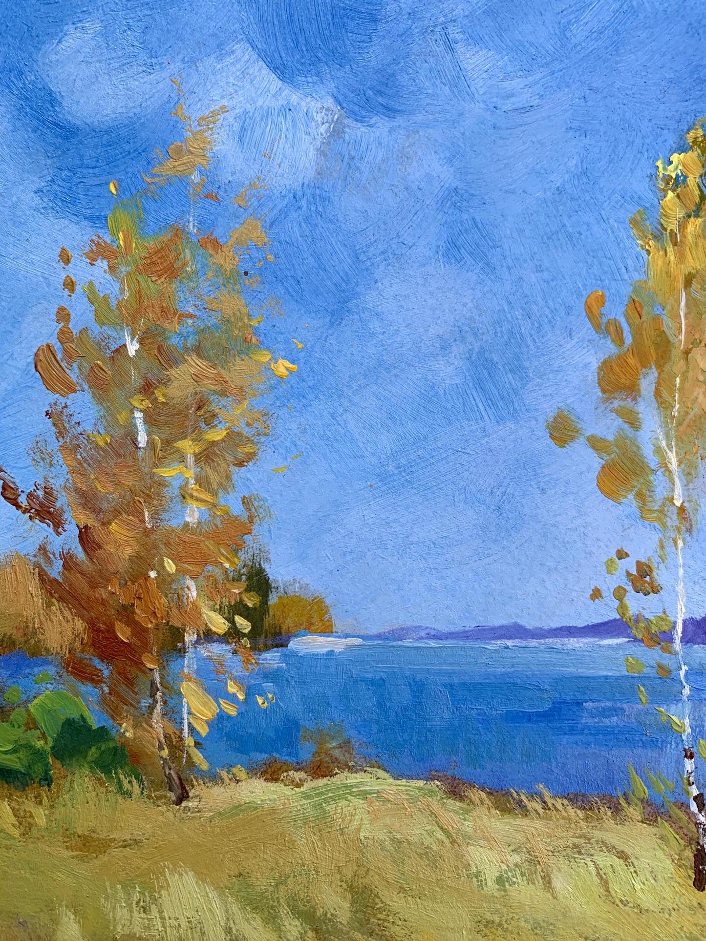 The painting "Early Autumn Morning" captures the serene beauty and gentle transformation of nature as summer transitions to autumn. Executed in oil on cardboard, this artwork portrays a tranquil lakeside scene bathed in soft morning light, where the vibrant hues of early fall leaves are mirrored by the calm blue waters of a lake. The composition evokes a sense of peace, renewal, and appreciation for nature’s cycles.In the foreground, a grassy meadow stretches across the bottom of the painting. The artist has rendered the grass with loose, expressive brushstrokes, combining shades of green and yellow to suggest the slight browning of vegetation as autumn takes hold. This grassy expanse provides a natural base for the vibrant trees and lake in the middle ground.The central focus of the painting is a stand of trees along the lakeshore, their leaves glowing with the brilliant colors of early fall. Shades of golden yellow, fiery orange, and crimson red dominate the foliage, while some green leaves remain, signaling the gradual transition of the season. The trees are painted with textured, dynamic brushstrokes that convey the movement of leaves in the morning breeze. The white trunks of birch trees stand out against the colorful foliage, adding contrast and rhythm to the composition.Beyond the trees lies the lake, painted in a rich, vivid blue that reflects the clear morning sky above. The water’s surface is calm and mirror-like, capturing the crispness of the air and the tranquility of the moment. The horizon line is softly defined, blending the distant shore with the sky to create a sense of openness and depth.The sky itself is expansive and luminous, painted in shades of azure blue with soft, wispy clouds drifting across it. The bright sky provides a perfect backdrop for the warm colors of the trees, enhancing the overall vibrancy of the composition. The interplay of light and shadow across the scene suggests the early morning sunlight, casting a gentle glow over the landscape.Through "Early Autumn Morning," the artist conveys the fleeting beauty and quiet magic of this transitional season. The painting celebrates the harmony of natural elements—earth, water, and sky—and invites the viewer to pause and appreciate the simplicity and elegance of an autumn morning. The vibrant colors and peaceful atmosphere evoke feelings of nostalgia, warmth, and a connection to the natural world.This work captures a moment of serenity and renewal, reminding the viewer of the cyclical beauty of nature. With its harmonious palette, textured brushwork, and thoughtful composition, the painting serves as a celebration of life’s subtle transformations and the timeless charm of an early autumn morning by the lake.