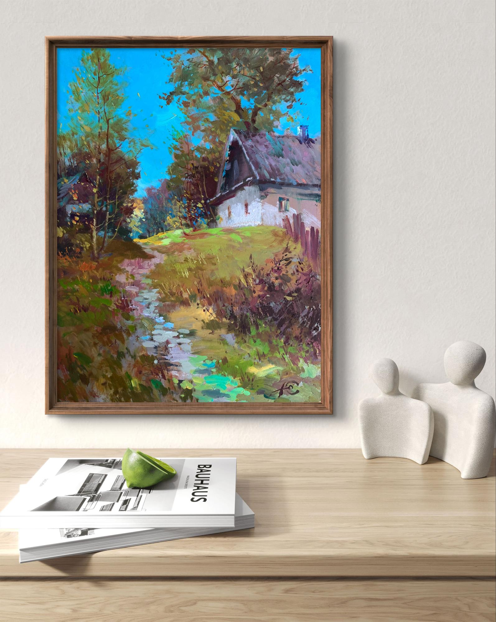 The painting "Early Morning in the Village" captures the serene and idyllic charm of rural life, as seen during the quiet hours of dawn. This oil-on-cardboard artwork immerses the viewer in a peaceful countryside scene, where nature and human habitation blend harmoniously. The composition leads the eye along a narrow, winding dirt path, softened by patches of grass and flanked by wild vegetation. The path meanders gently toward a rustic house on the right, its weathered walls and sloping thatched roof exuding a sense of history and simplicity.The light of early morning bathes the scene in soft, golden hues, illuminating the dewy grass and casting long, subtle shadows. The house, partially hidden by lush foliage, is painted in delicate tones of white and brown, its earthy colors blending seamlessly with the surrounding landscape. A wooden fence, slightly tilted and aged, adds texture and depth to the foreground, drawing attention to the intricate details of rural life.The background features tall trees with vibrant green and golden leaves, hinting at the changing seasons, perhaps late summer or early autumn. The bright, clear blue sky overhead provides a stunning contrast to the warm tones of the land, enhancing the freshness and vitality of the morning. The interplay of colors—bright greens, warm browns, and vivid blues—creates a harmonious palette that evokes tranquility and nostalgia.The artist populates the scene with subtle details, such as the play of sunlight filtering through the trees and the textures of the grass and roof, capturing the essence of rural living. The absence of human figures allows the viewer to imagine the stillness and solitude of the early hours, when the village is just beginning to wake.Through "Early Morning in the Village," the artist conveys the beauty of simplicity and the restorative power of nature. The painting invites the viewer to pause and appreciate the quiet moments often overlooked in daily life. It celebrates the timeless allure of the countryside, where the rhythms of nature provide a soothing counterbalance to the busyness of modern existence.This work resonates as a gentle reminder of the importance of connection—with the land, with history, and with oneself. The artist’s use of vibrant yet calming colors and thoughtful composition captures the serenity and warmth of village life, evoking feelings of peace, nostalgia, and contentment.