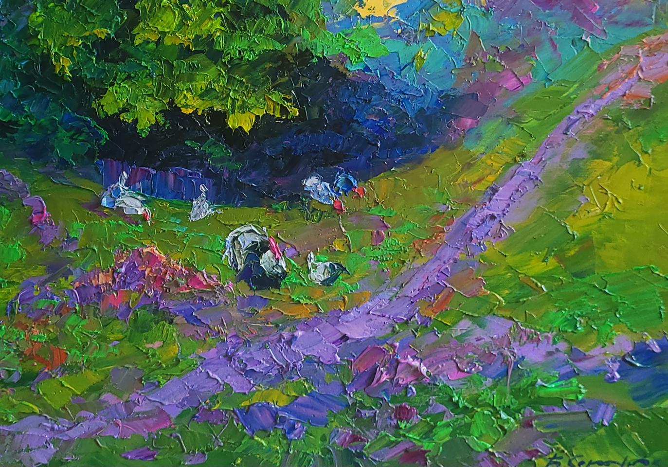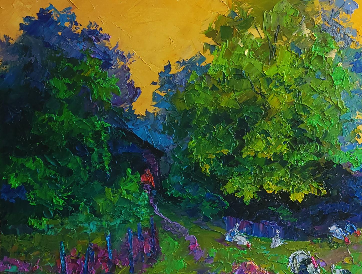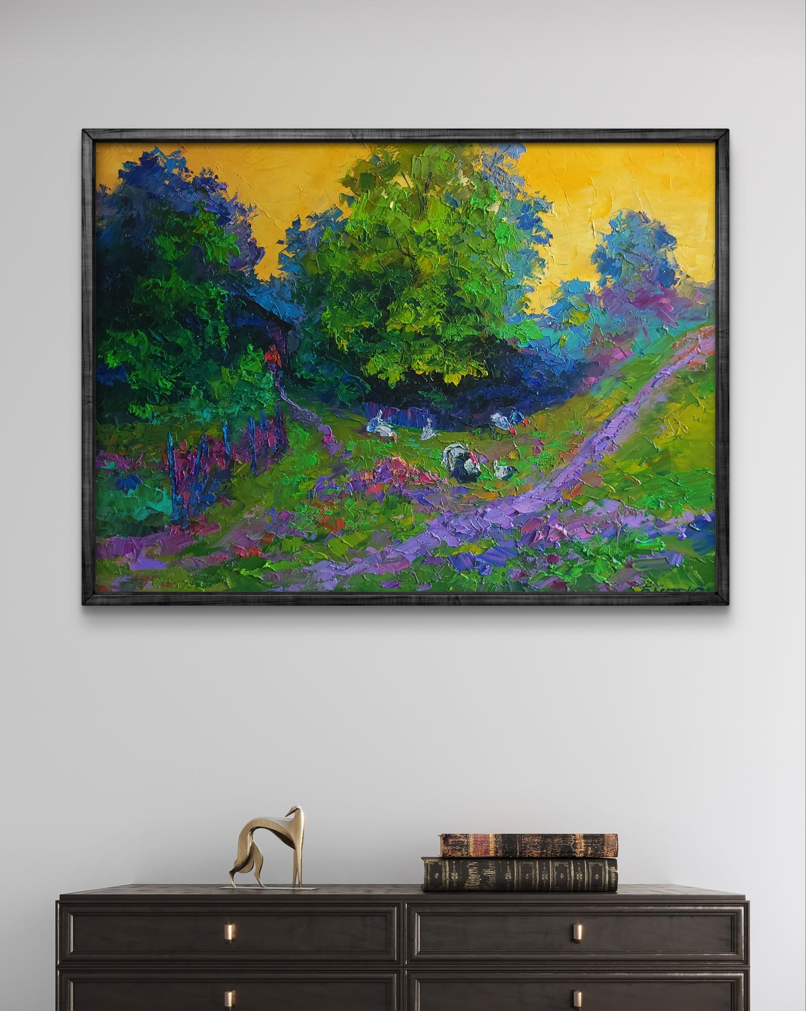 The oil painting titled "Evening and Yellow Sunset" portrays a peaceful rural scene illuminated by the warm glow of the setting sun. The painting captures a quiet corner of the countryside, where a group of geese and a turkey roam freely near a cozy house, blending harmoniously into the vibrant landscape. The rich colors of the greenery, combined with the golden hues of the sky, create a striking contrast that draws the viewer into the serene atmosphere of the countryside at dusk.The lush vegetation is depicted in various shades of green, with touches of blue and violet, adding depth and liveliness to the composition. The thick, textured brushstrokes used by the artist convey the vibrancy of nature and the dynamic play of light and shadow. The pathway, painted in soft purple tones, winds gently through the scene, guiding the viewer’s eye toward the house nestled behind the trees. The movement of the geese and the prominent figure of the turkey add a sense of life and activity to the otherwise tranquil setting.The sky, painted in bright yellow and orange hues, suggests the moment just before nightfall, when the sun casts its final golden rays over the landscape. The warm tones of the sunset contrast with the cooler greens and purples of the foreground, symbolizing the transition from day to night. This contrast creates a feeling of balance and harmony, emphasizing the natural rhythm of life in the countryside.Through "Evening and Yellow Sunset," the artist seeks to convey a message of peace, simplicity, and the beauty of rural life. The geese and turkey, symbols of traditional farming life, reflect the close relationship between humans and nature in these quiet, pastoral settings. The painting invites viewers to appreciate the calming influence of nature and the fleeting beauty of twilight, a time of day that marks both an ending and a new beginning.The artwork celebrates the serenity of country life and reminds viewers to find joy in life’s simple moments, such as watching the sunset or observing animals in their natural habitat. The artist’s use of bold colors and expressive brushstrokes creates a vibrant, lively scene that leaves a lasting impression of warmth, harmony, and connection to nature.
