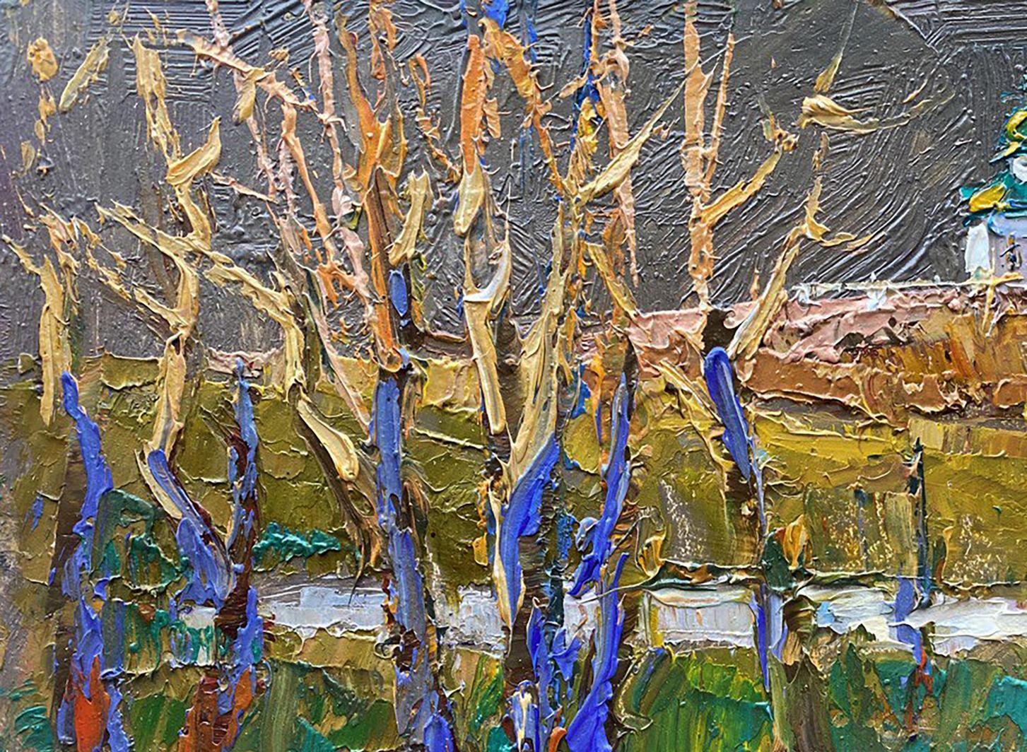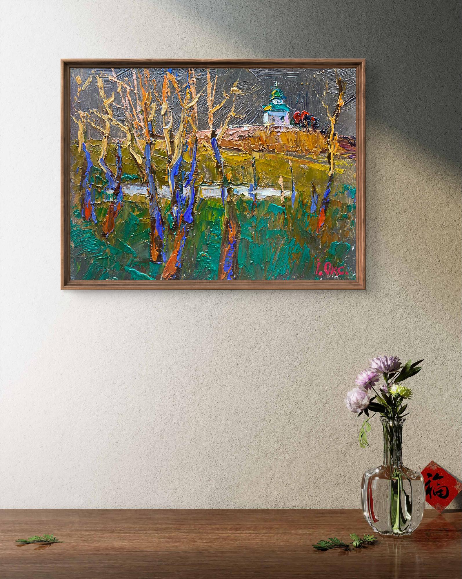 The painting titled "Evening Bell" captures a tranquil rural scene at dusk, where a distant church bell tower stands prominently on a hill, framed by bare trees and soft evening light. The artist uses bold, expressive brushstrokes and a rich color palette to create a textured, immersive composition. The scene evokes a sense of peace, solitude, and spiritual reflection, emphasizing the quiet beauty of the countryside as night begins to fall. The foreground is filled with bare trees with slender, twisting trunks painted in earthy brown and deep blue hues. The thick, impasto brushstrokes add texture and dimension to the tree bark, suggesting the rawness of nature as it transitions into the cooler months. The trees stretch upwards, their branches reaching out like silhouettes against the soft, fading light of the sky. The ground beneath the trees is painted in vibrant shades of green, blue, and brown, creating a lush yet untamed landscape. The layered texture of the paint gives the impression of uneven terrain, possibly a path leading up to the hill. The interplay of warm and cool tones in the grass suggests the changing light of evening, with shadows growing longer as the sun sets. In the middle ground, a small white fence runs horizontally across the composition, providing a sense of structure and human presence in the otherwise natural setting. The fence contrasts with the vibrant colors of the trees and ground, drawing the viewer’s eye toward the distant church tower. Beyond the fence, the landscape rises gently to form a hill, painted in shades of warm yellow, ochre, and earthy brown. The hill appears bathed in the golden light of sunset, adding warmth to the composition and highlighting the natural contours of the land. The background features the focal point of the painting — a white church or bell tower with a green domed roof, perched on top of the hill. The bell tower symbolizes faith, tradition, and spiritual grounding, serving as a beacon of light and hope in the rural landscape. The tower is painted with clean, crisp strokes, standing out against the darker tones of the surrounding landscape. Behind the church, a soft, grayish sky stretches across the top of the painting. The sky is painted in muted tones of gray, beige, and light blue, suggesting the fading light of twilight. The swirling brushstrokes in the sky convey a sense of movement, hinting at a gentle evening breeze. "Evening Bell" is a beautifully textured landscape painting that captures the essence of a quiet village at dusk. Through the use of bold colors, thick brushstrokes, and dynamic contrasts, the artist conveys a scene filled with peace, warmth, and spiritual significance. The painting invites viewers to experience the tranquility of nature, appreciate the traditions of rural life, and reflect on the simple beauty of an evening bell ringing in the distance.