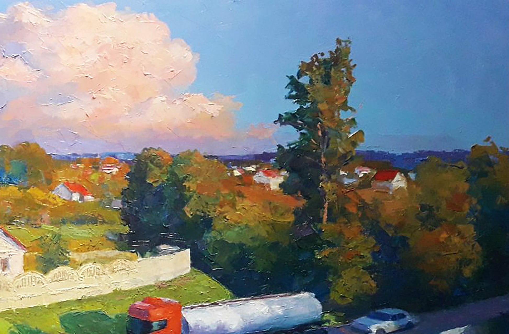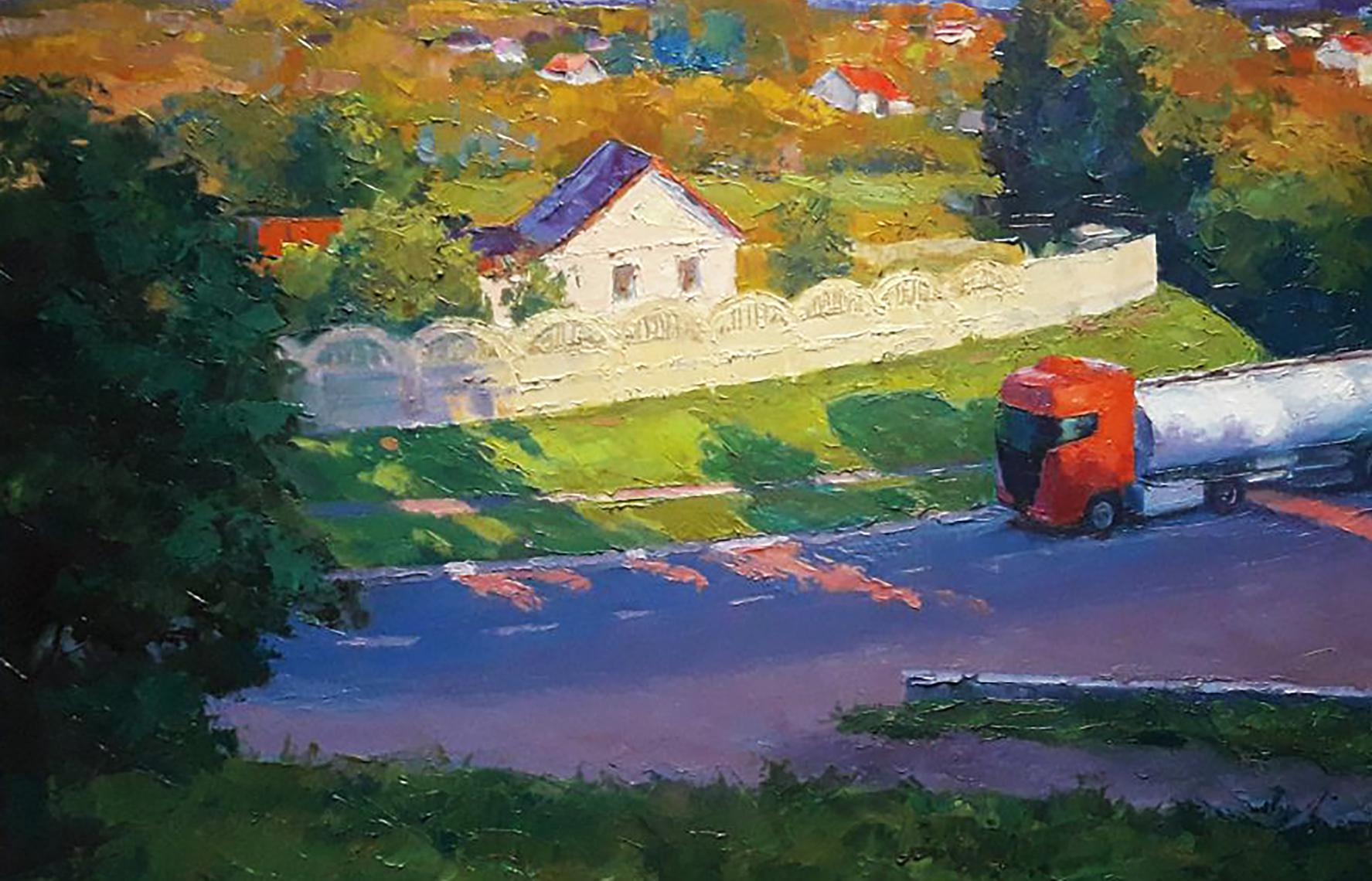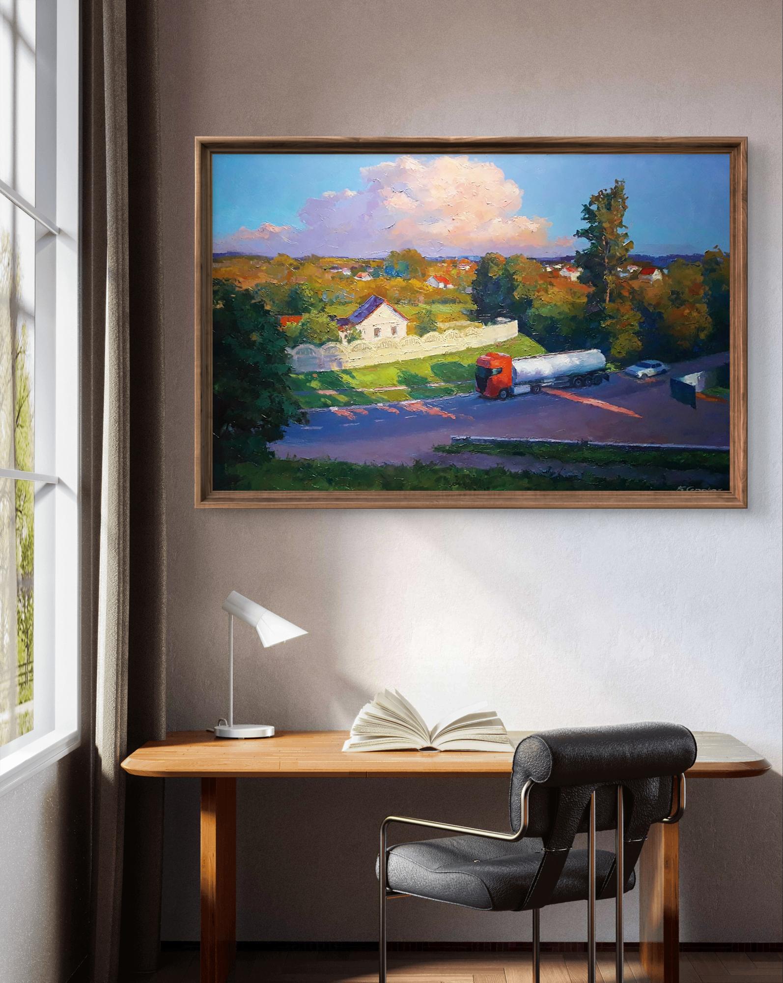 The painting titled "Evening City" depicts a peaceful and picturesque suburban landscape as evening approaches, capturing the warmth and tranquility of a small town. The scene is bathed in the soft, golden light of the setting sun, casting long shadows across the road and illuminating the houses and greenery with a warm glow. The artist masterfully uses light and color to create a sense of calm and harmony, highlighting the beauty of everyday life in a quiet community.In the foreground, a large red truck with a white tank trailer is parked on the road, suggesting a brief pause in its journey. The truck is painted with bold colors, standing out against the softer tones of the surrounding landscape. Its presence adds a dynamic, modern element to the scene, representing the connection between rural life and modern infrastructure.To the left of the truck, a charming white house with a red roof is nestled behind a decorative fence. The house appears well-kept and inviting, symbolizing the warmth and comfort of home. The shadows cast by the fence and trees create a sense of depth and movement, enhancing the realism of the painting.In the background, lush greenery and scattered houses stretch out toward the horizon, giving the impression of a peaceful, close-knit community. The artist paints the trees and bushes with a variety of green tones, adding richness and texture to the landscape. The distant houses are painted in soft reds, whites, and blues, blending harmoniously with the natural surroundings.Above the scene, a large, fluffy cloud dominates the sky, painted in shades of cream, pink, and light orange. The cloud reflects the warm light of the setting sun, creating a dramatic and captivating sky that contrasts with the calmness of the landscape below. The sky’s vibrant colors evoke a sense of serenity and beauty, reminding viewers of the peacefulness that comes with the end of the day.Through "Evening City," the artist aims to convey a message about the quiet beauty of everyday life and the connection between nature, community, and modern progress. The painting captures a moment of stillness and reflection, inviting viewers to appreciate the simple pleasures of rural living. The presence of the truck on the road suggests movement and transition, symbolizing the constant flow of life and the journeys we all take.The artist’s use of light and shadow, combined with vibrant colors and expressive brushstrokes, creates a sense of warmth and comfort. "Evening City" celebrates the balance between tradition and modernity, encouraging viewers to pause and reflect on the beauty of their surroundings. The painting evokes feelings of peace, nostalgia, and a deep appreciation for the quiet moments that make life meaningful.