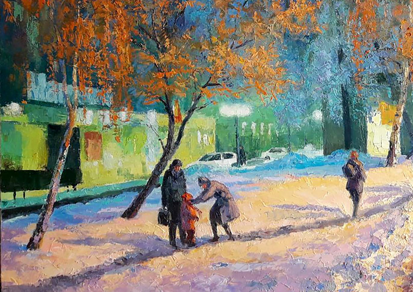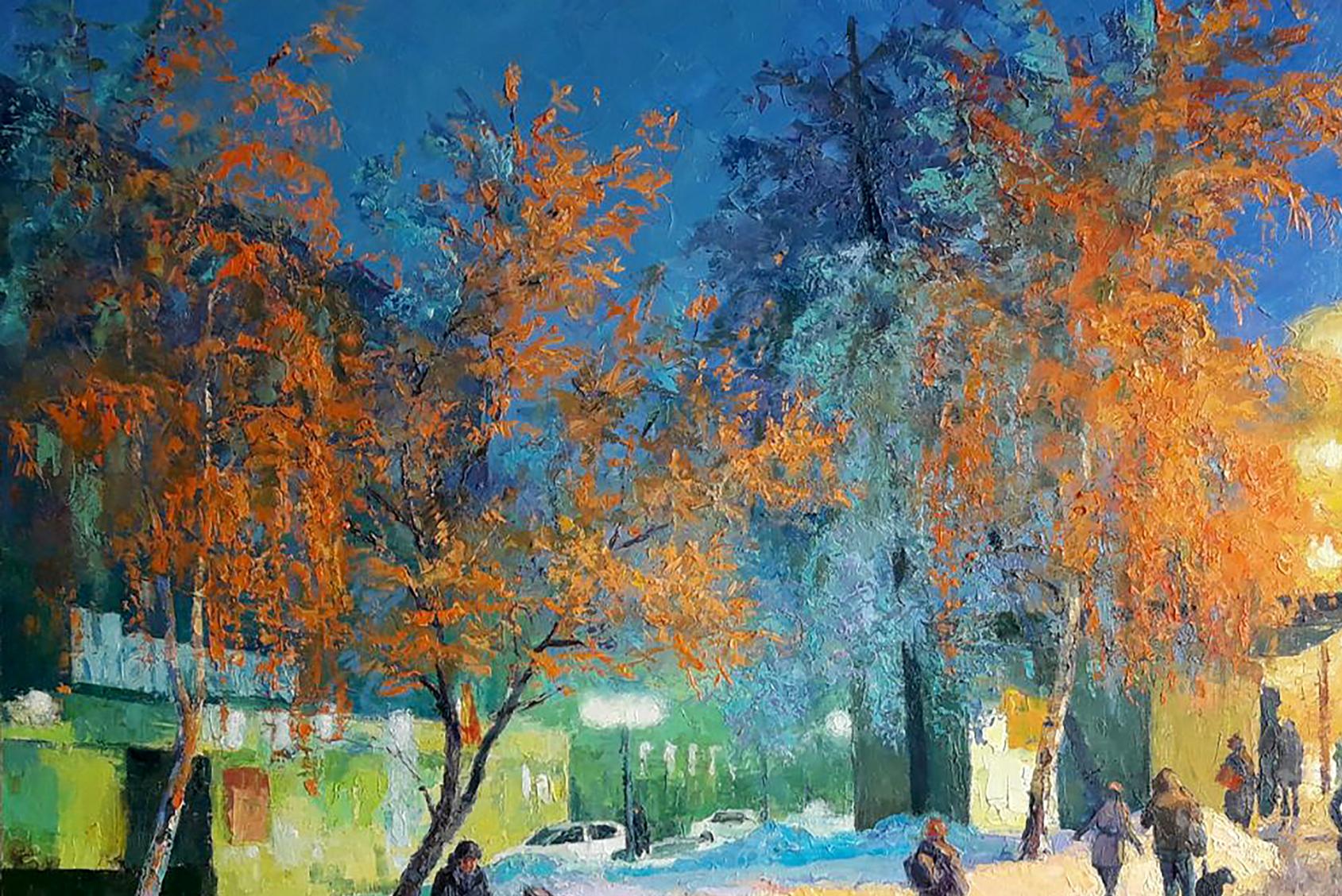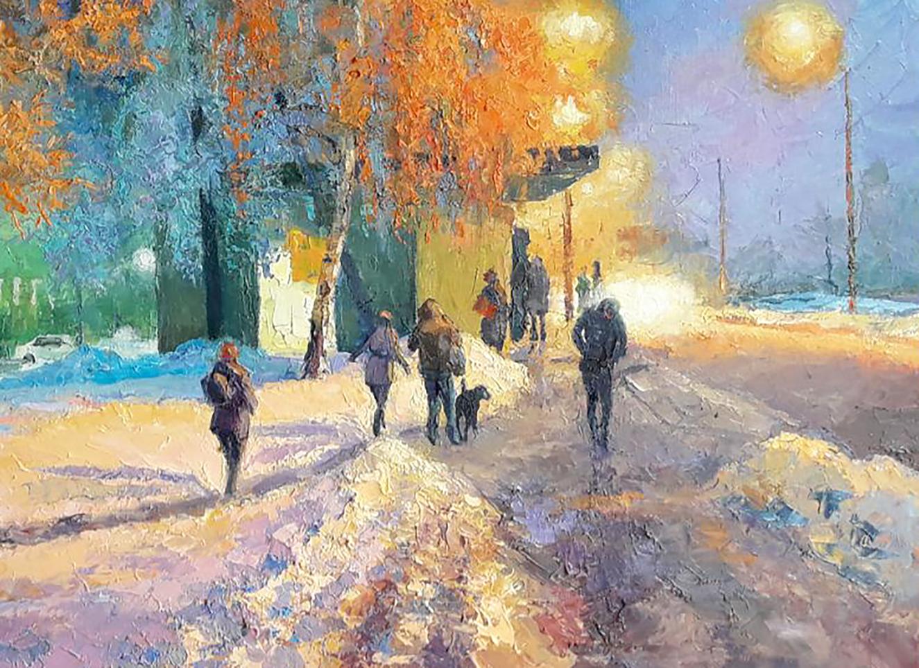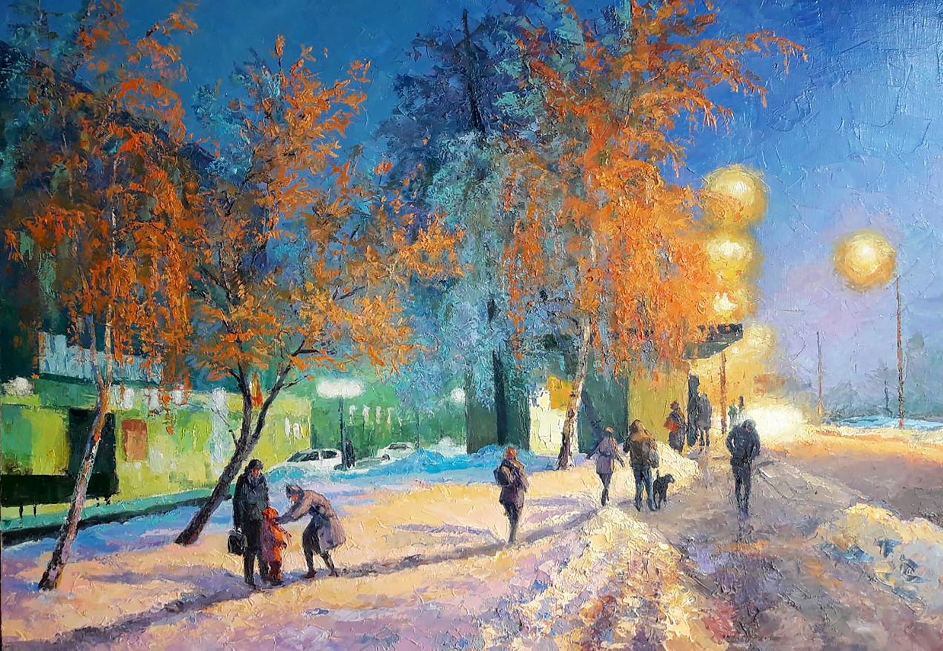 The oil painting captures the essence of a city evening in winter with stunning accuracy. The artist has masterfully painted the snow-covered streets, highlighting the various textures and shades of white, from the fresh snow on the rooftops to the well-trodden paths on the road. The scene is set in a bustling city, as evidenced by the many people walking down the street, bundled up in winter clothing. The city's buildings tower above them, and in the background, the orange foliage of the trees adds a warm and inviting touch to the otherwise cold and wintry scene. The lanterns lining the street illuminate the scene, casting a warm, amber glow across the snowy landscape. The light creates beautiful contrasts and shadows that add depth and character to the painting. The people in the painting appear to be going about their daily lives, some carrying shopping bags, others huddled together for warmth, and a few simply walking their dogs. The movement and activity of the people add a sense of life and energy to the painting. Overall, this oil painting is a beautiful and detailed depiction of city life in the evening. The use of light, texture, and color creates a sense of warmth and vibrancy despite the cold winter setting.