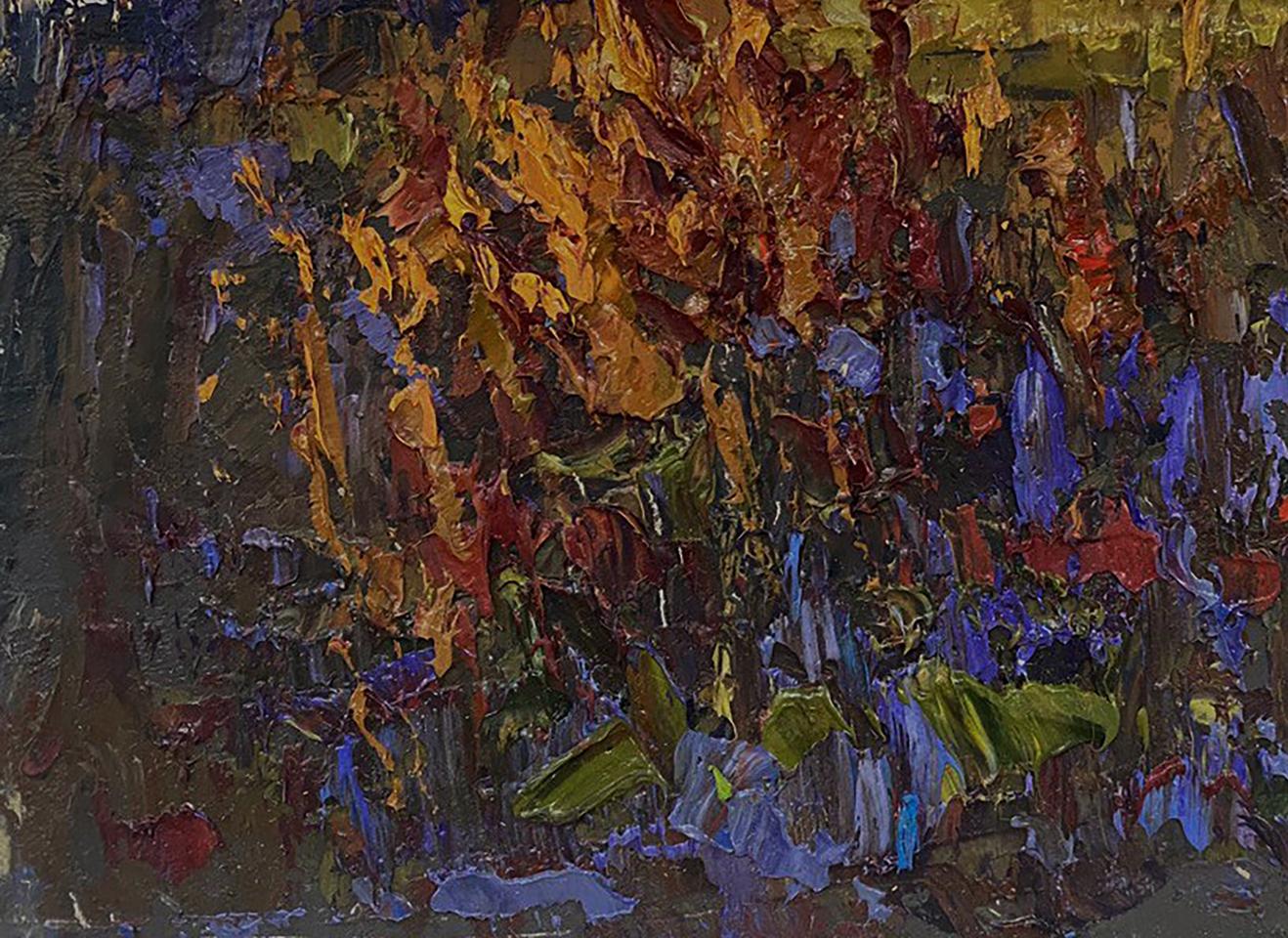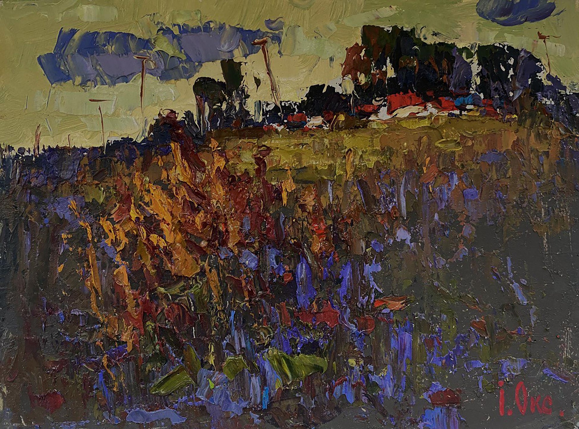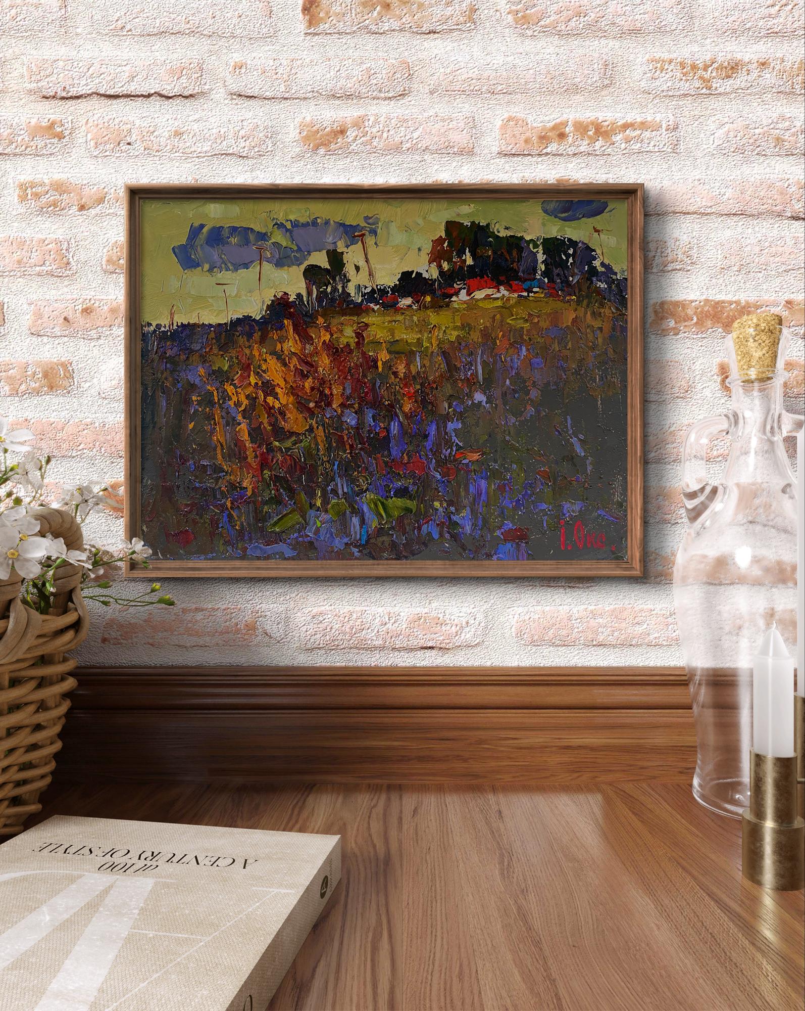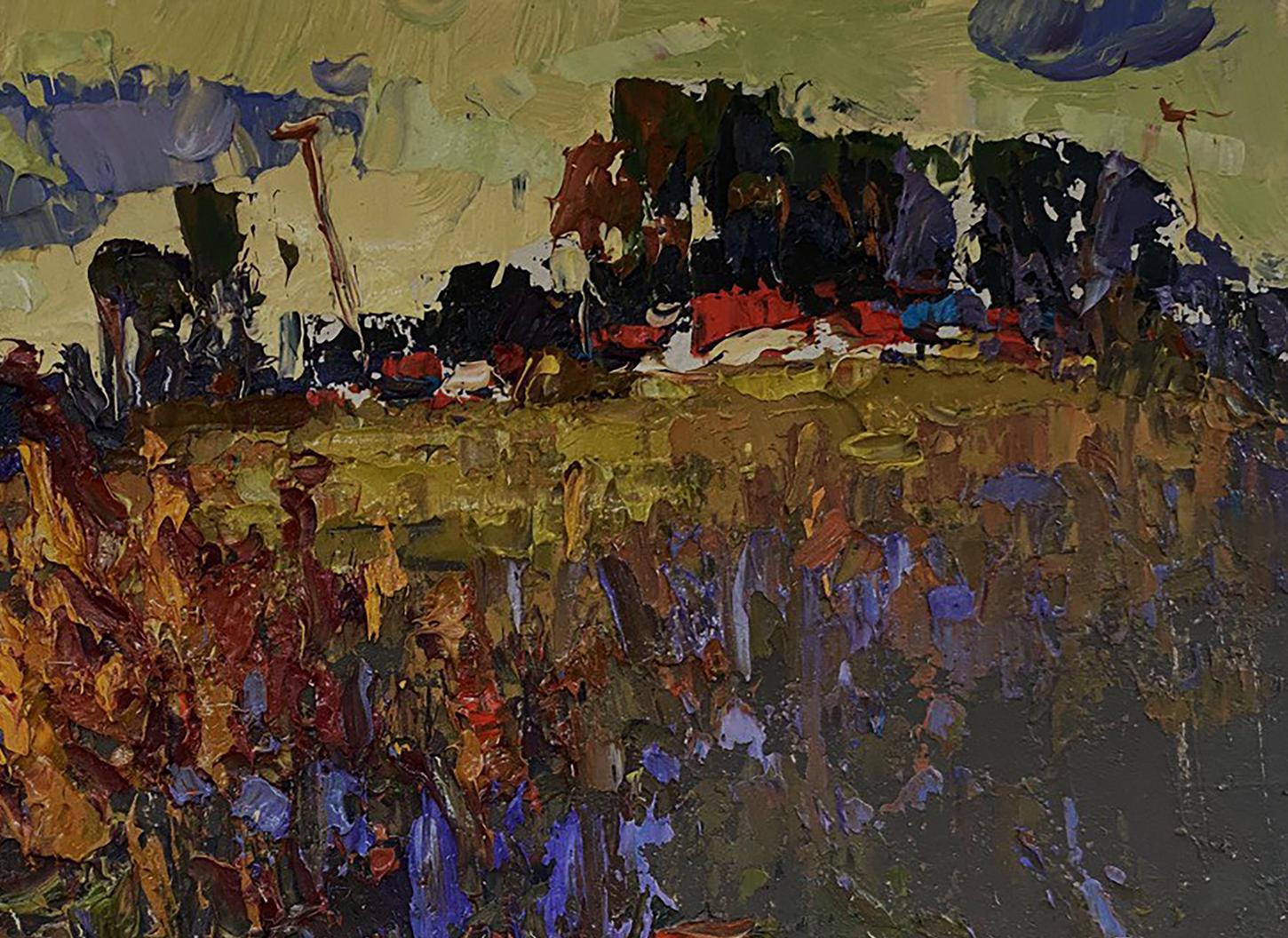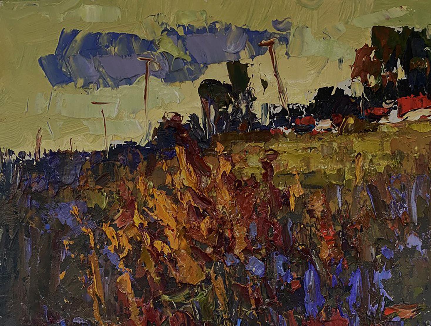 The painting titled "Evening Landscape" captures the quiet, atmospheric beauty of a countryside scene at dusk. The artist uses rich, earthy tones and textured brushstrokes to evoke the serene yet mysterious mood of twilight, when the fading light transforms the landscape into a blend of deep shadows and muted colors. The composition is balanced between wild vegetation in the foreground and hints of a distant village, suggesting a sense of solitude and connection to nature. The foreground is filled with a dense tangle of wild grass and flowers, painted with thick, layered brushstrokes in shades of dark purple, brown, and burnt orange. The warm, fiery colors of the plants suggest that they are catching the last rays of the setting sun, while the cool blues and purples hint at the encroaching darkness. The brushstrokes are bold and expressive, creating a sense of movement and texture, as if the plants are gently swaying in the evening breeze. The wild vegetation feels untamed and natural, emphasizing the raw beauty of the countryside. In the middle ground, a golden field stretches across the painting, providing a soft, glowing contrast to the darker tones of the foreground. This field acts as a transition space, leading the viewer’s eye toward the distant village and forest. The field is painted with muted yellows and greens, suggesting that the sunlight is gradually fading as night approaches. The texture of the field is rough and uneven, adding to the natural, organic feel of the landscape. The background features a distant tree line and village houses, painted in dark green, brown, and black tones. The hints of red and blue rooftops suggest human presence, though the village is distant and partially obscured by the surrounding trees, adding a sense of mystery and isolation. Above the village, the sky is painted in muted yellow-green and grayish-blue hues, representing the soft light of the evening sky as it transitions into night. Dark clouds gather in the sky, adding to the moody atmosphere of the painting. "Evening Landscape" is a beautifully textured and evocative painting that captures the tranquil beauty of a countryside scene at dusk. Through its use of rich colors, bold brushstrokes, and a balanced composition, the artwork conveys a sense of peace, reflection, and the quiet passage of time. The painting invites viewers to immerse themselves in the beauty of nature and appreciate the subtle transitions between light and shadow as day turns to night.