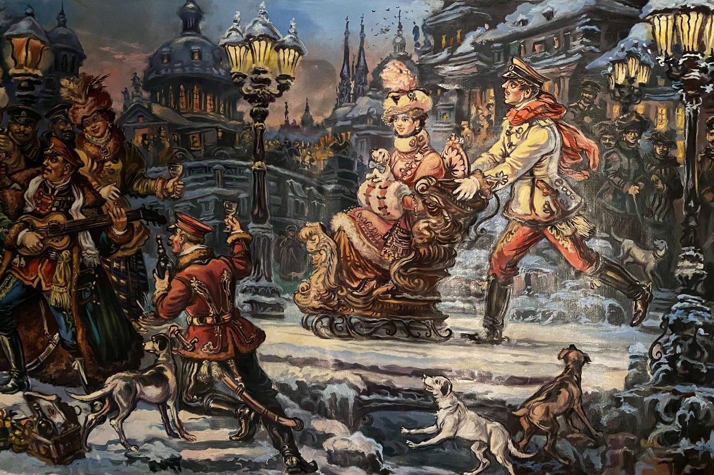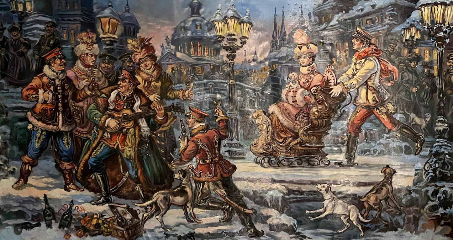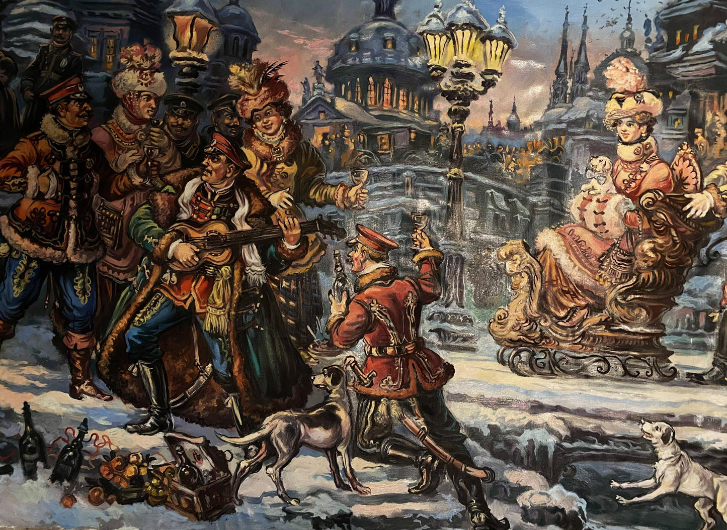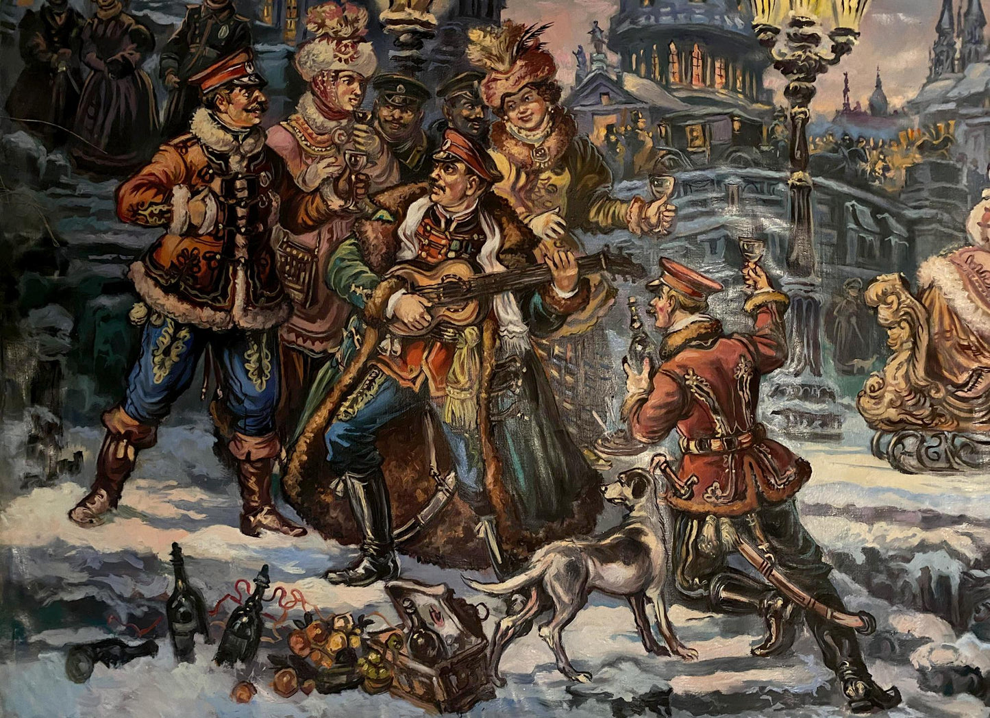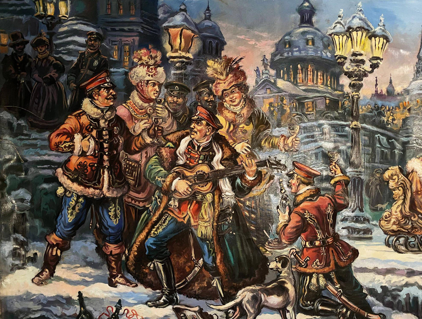 Titled "Evening with the Hussars," this oil painting by Alexander Arkadievich Litvinov is a vibrant depiction of the lively and spirited gatherings of hussar officers. Measuring 105x52.5 cm (41.33x20.66 inches) and created with oil on canvas, the artwork immerses viewers in the camaraderie and revelry that characterized the social life of these cavalrymen. Oil genre painting "Evening with the Hussars" by Alexander Arkadievich Litvinov emerges as an exceptional piece within our collection, illustrating the artist's exceptional talent for capturing the essence of historical moments and the rich cultural nuances of military life. Through Litvinov’s expressive brushwork and meticulous attention to detail, the painting evokes the pomp, circumstance, and underlying human emotions of an era gone by, offering a window into the convivial world of the hussars with authenticity and artistic flair. Let's delve into the artistry of this captivating piece and the creative journey of its creator. There are other genres of painting in our catalog.