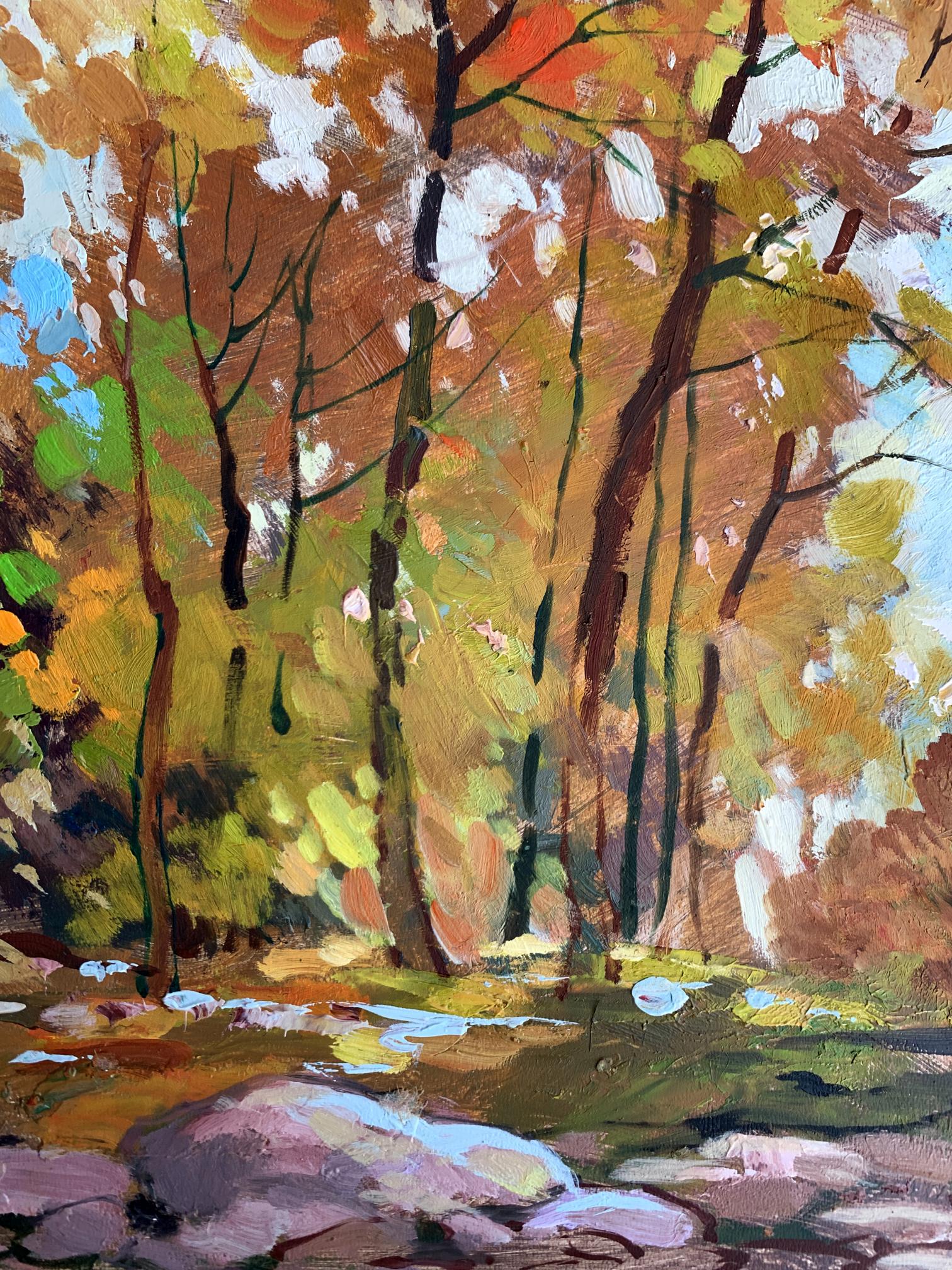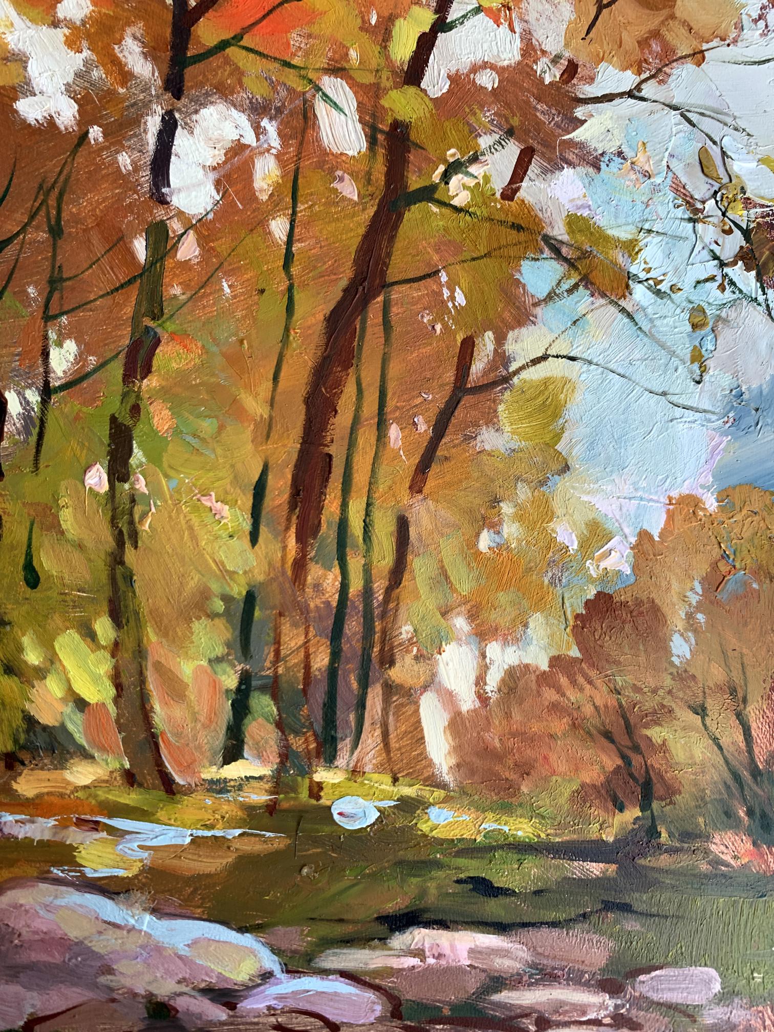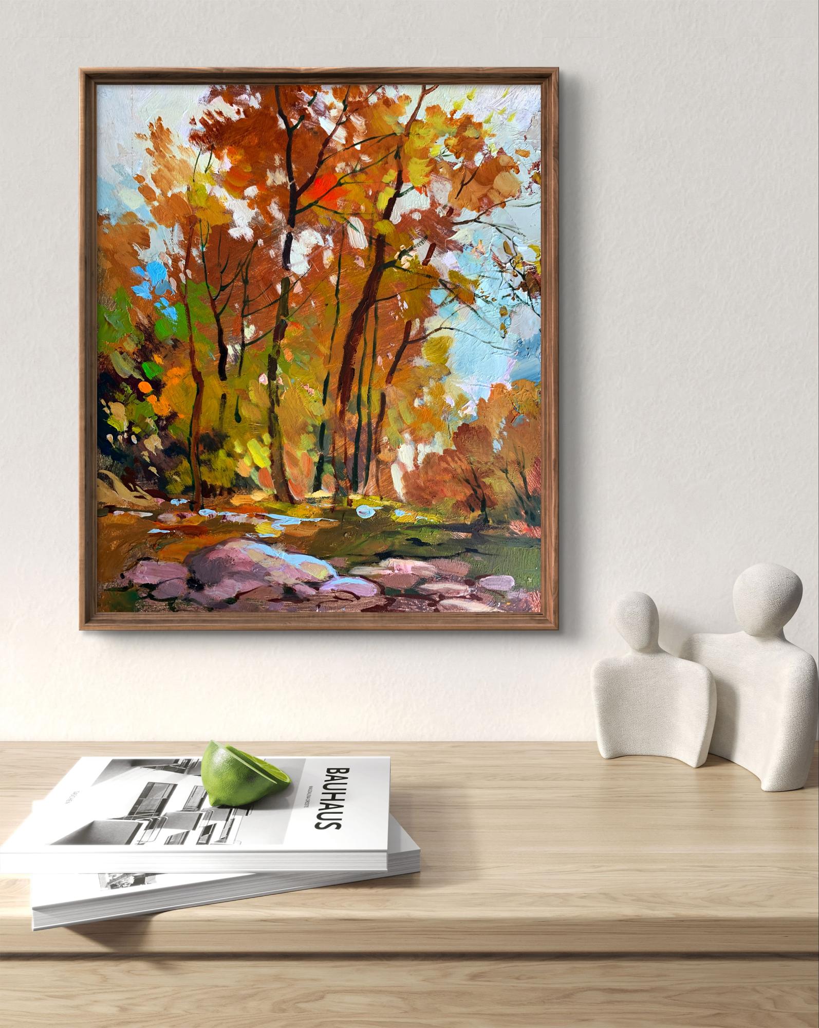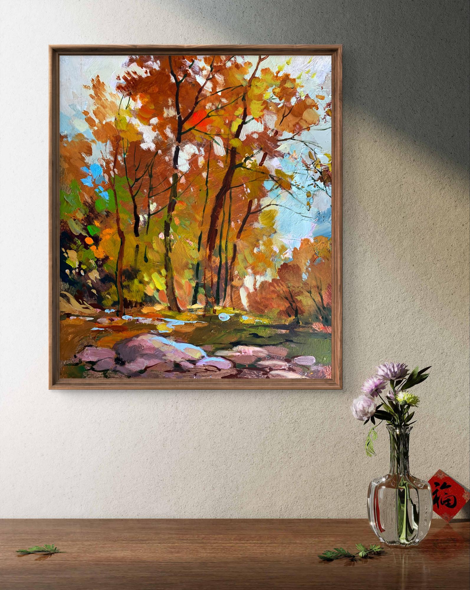 The painting titled "Fallen Leaves" vividly captures the serene beauty of an autumn forest in its full splendor. The artwork is alive with warm hues of orange, red, yellow, and brown, which dominate the composition, representing the natural transition of the seasons. The tall trees, with their slender trunks, stand gracefully against a softly glowing sky, while the vibrant foliage fills the scene with movement and texture.The ground is scattered with fallen leaves, their colors mirroring those still clinging to the branches above. The leaves create a soft, natural carpet, bringing the focus downward and reminding the viewer of the cyclical nature of life. A winding path or small stream weaves gently through the composition, drawing the eye deeper into the forest and suggesting an invitation to explore or reflect.The interplay of light and shadow in the painting is masterful. The sunlight filters through the canopy, casting dappled patterns on the forest floor. This use of light evokes a sense of warmth and tranquility, contrasting beautifully with the cool patches of blue and green that peek through the foliage, hinting at the changing weather and the approach of winter.The painting's style is expressive yet controlled, with bold brushstrokes and vibrant splashes of color that convey the artist's emotional connection to the scene. The composition feels alive, as if the viewer is standing amidst the trees, breathing in the crisp autumn air and listening to the rustling leaves.Through this work, the artist seeks to capture not just the visual beauty of the season but also its emotional resonance. "Fallen Leaves" is a meditation on the passage of time, the fleeting beauty of nature, and the quiet moments of reflection that come with autumn. It reminds us to appreciate the simple yet profound cycles of life, to find beauty in impermanence, and to pause amidst the hustle of daily life to reconnect with the natural world. This piece speaks to the heart, evoking nostalgia and a sense of peace.