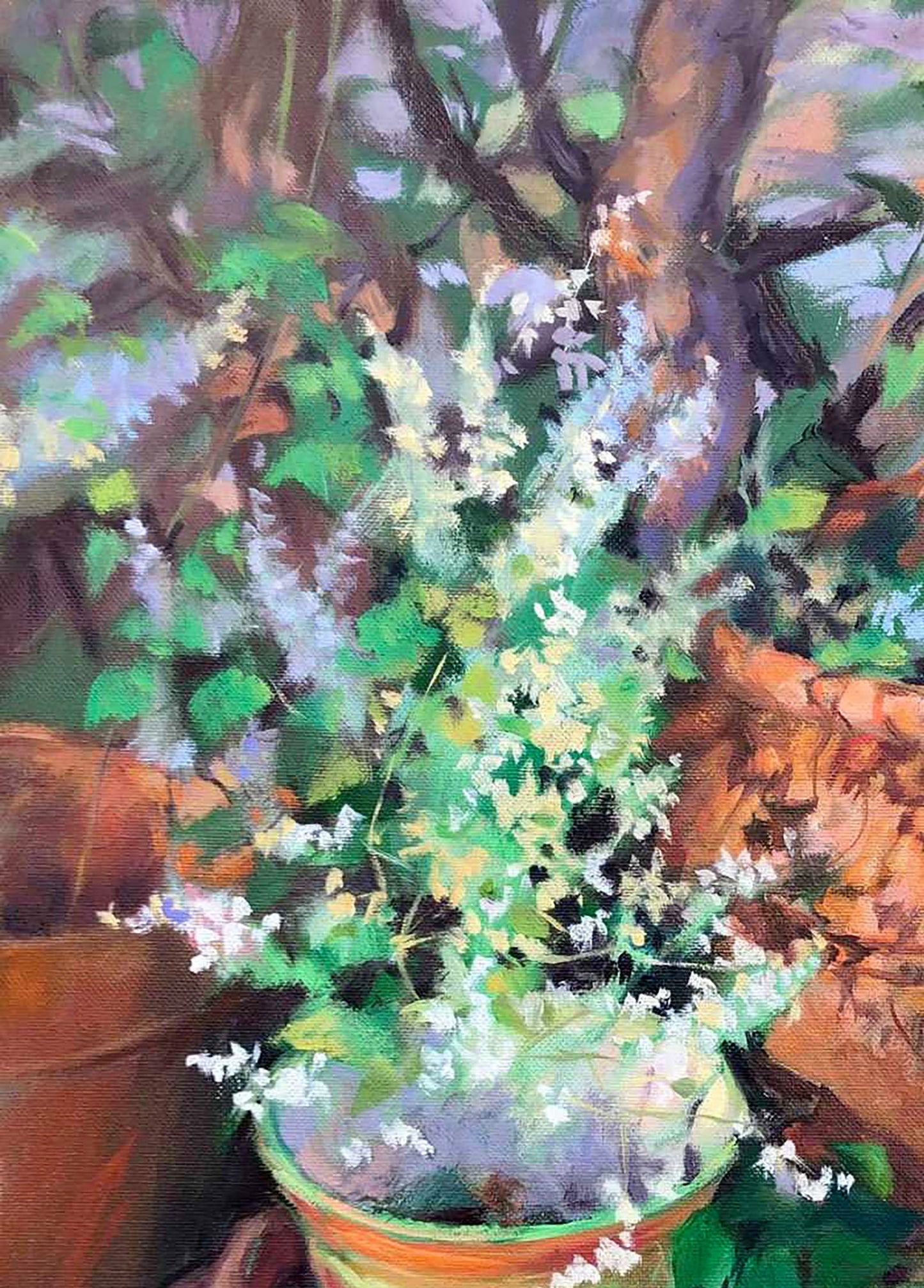 "Fallopia" is a celebration of tranquility and the quiet beauty that nature offers. The delicate blossoms and lush greenery symbolize harmony and peace, while the intimate composition conveys a sense of comfort and connection with the natural world. The painting invites viewers to pause and reflect on the small, serene moments that bring calm to everyday life.