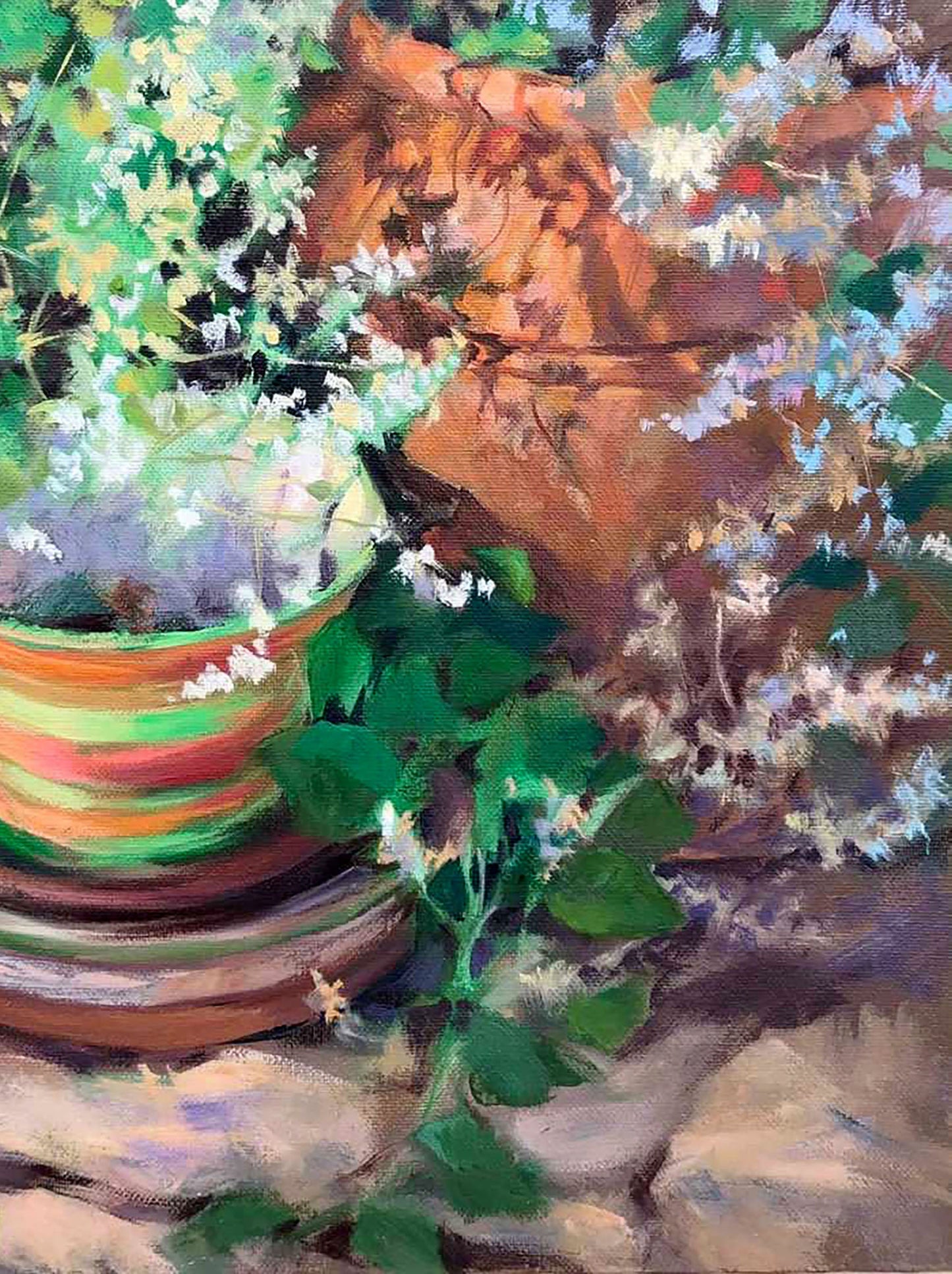 "Fallopia" by Ukrainian artist Osnach Olesia is a tranquil and intimate portrayal of nature’s quiet beauty. The painting features a potted Fallopia vine, with its delicate white blossoms gently cascading over the edge of a striped pot. The soft, warm tones of light and shadow create a serene atmosphere, while the surrounding lush greenery and earthy hues evoke the peacefulness of a calm garden setting. The detailed brushwork and harmonious composition invite viewers to take a moment of reflection, appreciating the often-overlooked beauty in simple, everyday scenes.