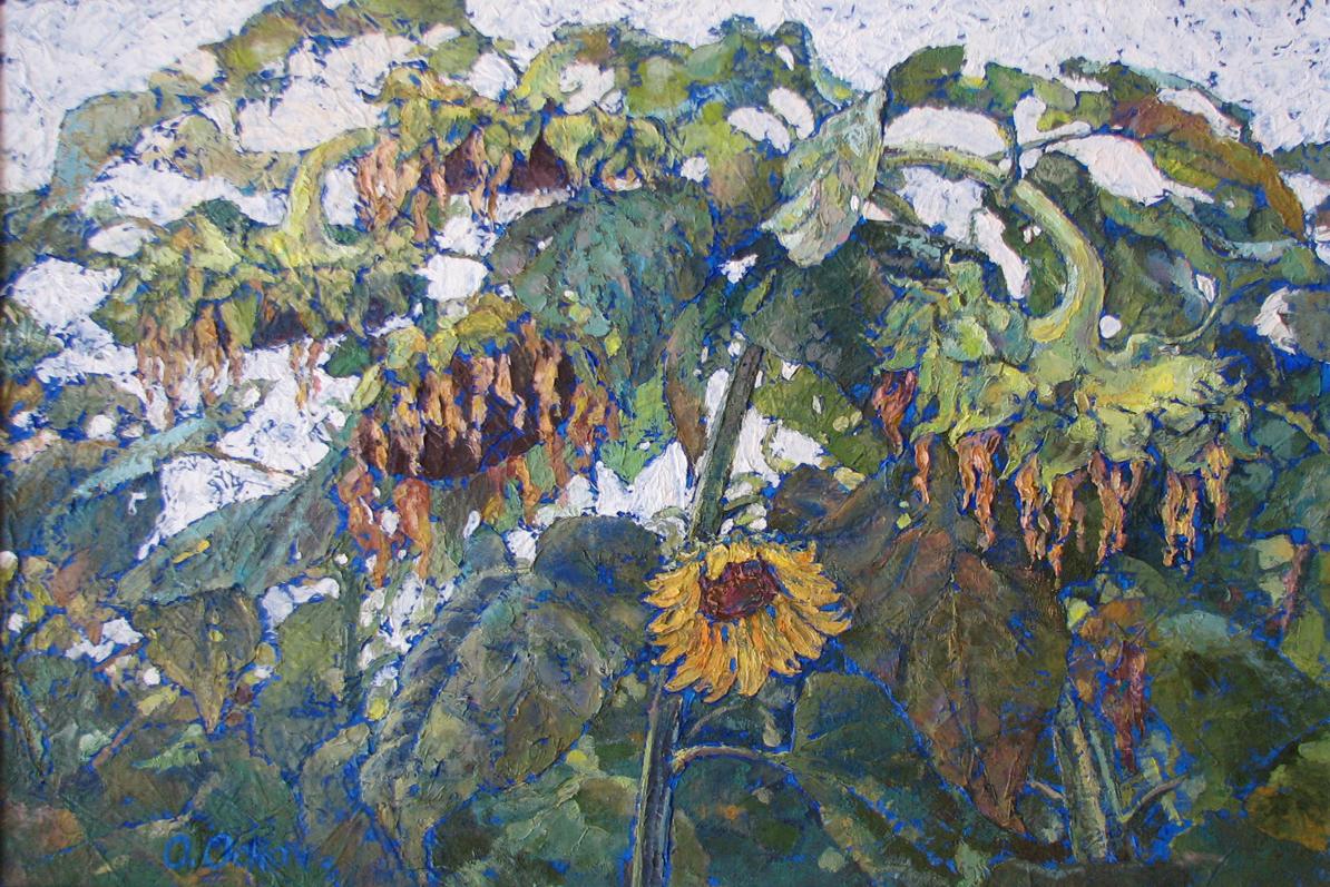 The painting "Family" by the celebrated Ukrainian artist Osnach Olesia presents a stunning portrayal of sunflowers at various stages of life. Each sunflower, with its bent heads and textured, weathered petals, tells a story of growth, maturity, and decline. The vibrant, full blooms contrast with those in the later stages of life, creating a rich and intricate composition. The interplay of light and shadow adds depth and dimension, highlighting the complex, organic connection between the flowers—symbolic of the diversity and unity found within a family.