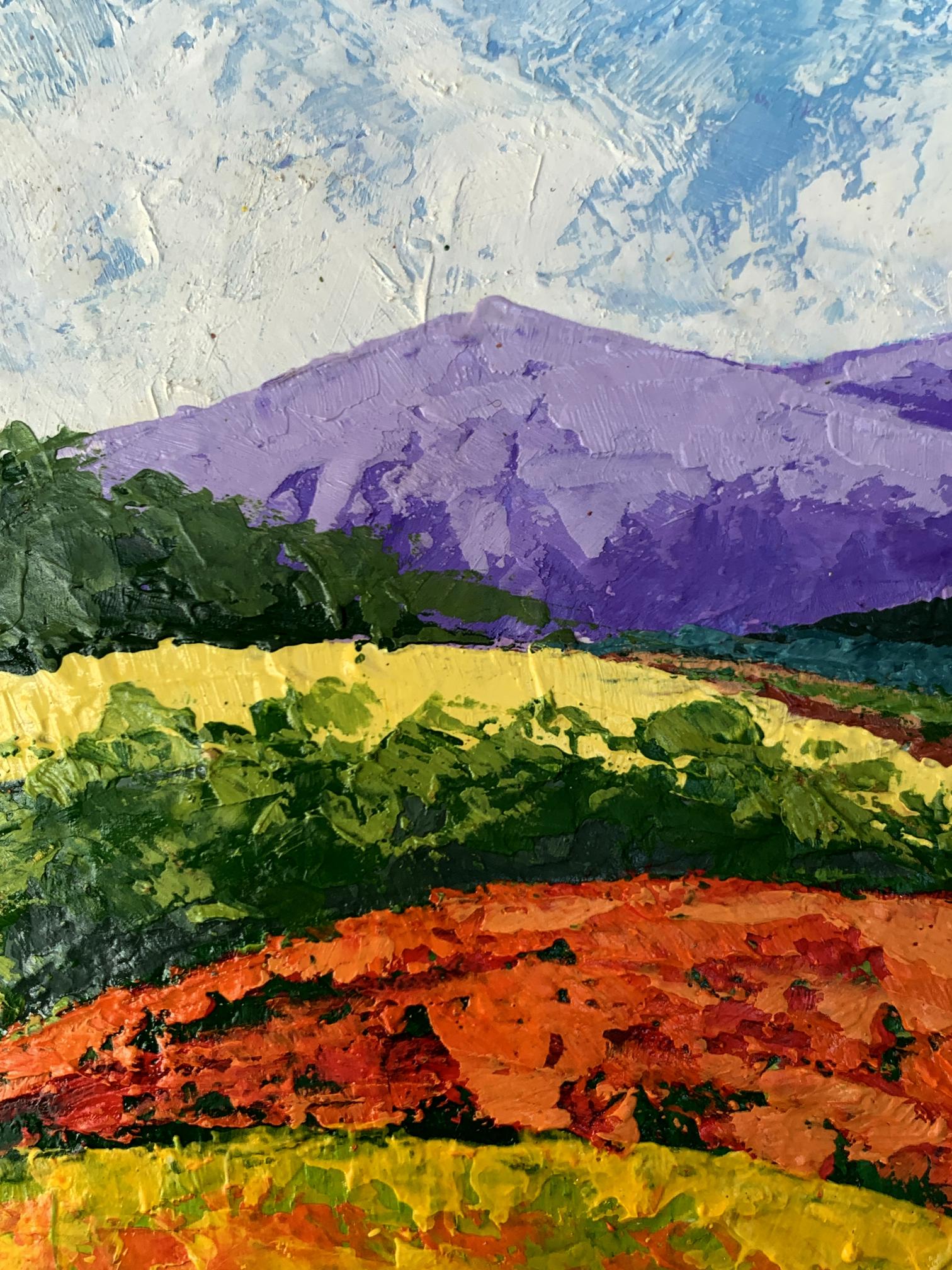 The painting "Far Away in the Mountains", created with oil on cardboard, portrays a vibrant and serene landscape that invites the viewer on a journey through nature's beauty. The composition is a harmonious interplay of colors, textures, and forms, reflecting the essence of a picturesque countryside nestled near majestic mountains.The foreground bursts with warmth and energy, dominated by bold shades of orange, yellow, and green. The artist uses textured brushstrokes to depict a lush field, creating a tactile sensation that draws the viewer into the scene. This vibrant palette evokes feelings of vitality and abundance, symbolizing the richness of the land.The middle ground transitions into rolling hills, painted in deeper greens and framed by a path that winds gently toward the horizon. This pathway acts as a visual guide, leading the eye naturally to the backdrop of majestic mountains. The mountains are rendered in soft purple tones, creating a calming contrast against the vivid foreground. Their presence conveys a sense of tranquility and timelessness, embodying the quiet strength of nature.On the right side of the composition, a cluster of trees stands tall, their rich green hues complementing the natural palette of the landscape. These trees add depth and balance to the painting, anchoring the scene and symbolizing resilience and life amidst the vast expanse.Above, the sky is a delicate mix of soft blues and whites, with hints of light clouds scattered across the canvas. The artist’s choice of a bright, clear sky enhances the overall sense of openness and freedom, emphasizing the grandeur of the mountains and the land that stretches toward them.Through "Far Away in the Mountains", the artist seeks to capture the serene beauty of nature and its power to inspire a sense of wonder and peace. The painting encourages the viewer to pause and appreciate the intricate details of the world around them, reminding us of the profound connection between humanity and the natural world. It is a celebration of distance, both literal and metaphorical, inviting us to dream of the untouched beauty that lies far beyond the immediate horizon.