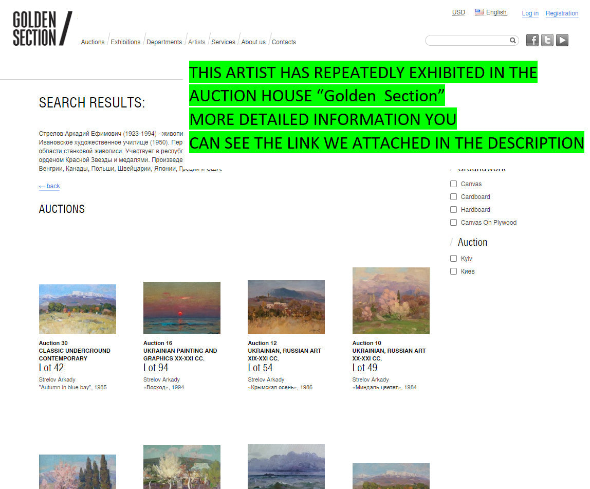 About the artists: Strelov Arkady Efimovich (1923-1994) - painter, landscape painter. Born in the village of Shukhra, Ivanovo region, Russia. Graduated from the Ivanovo Art School (1950). Moved to Yalta (1950). Member of the USSR Union of Artists (since 1961). Participant of the Second World War. Works in the field of easel painting. Participates in republican, all-union and international exhibitions (since 1957). He was awarded the Order of the Red Star and medals. The artist's works are kept in museums in Ukraine and private collections in Hungary, Canada, Poland, Switzerland, Japan, Greece and the USA.