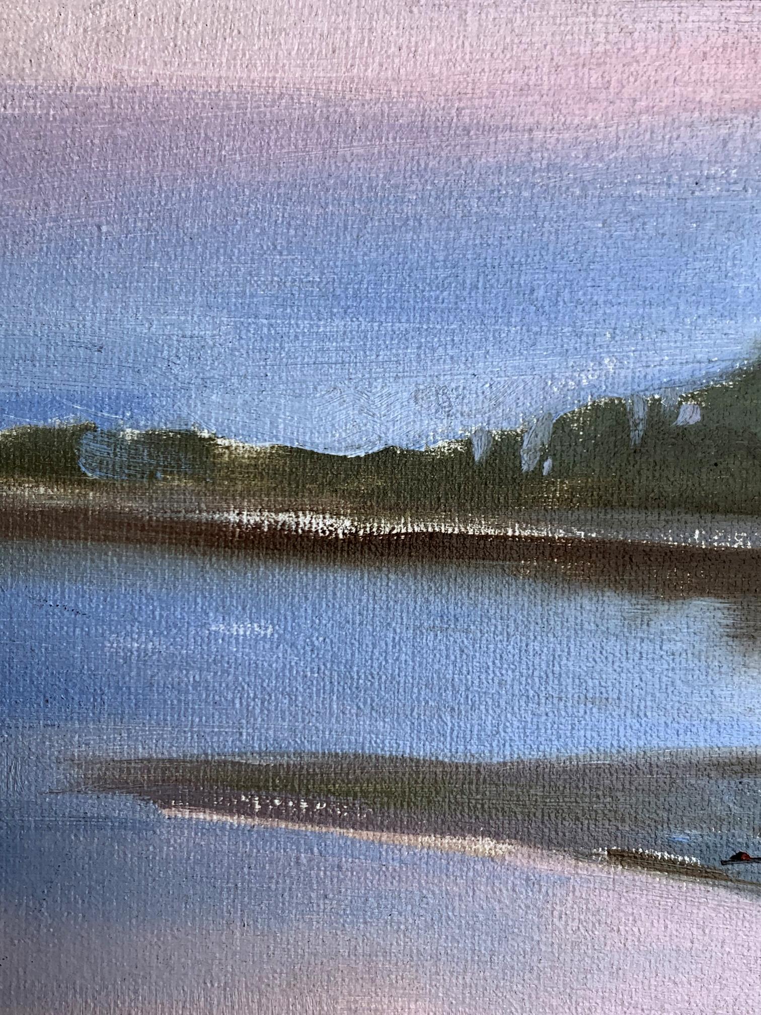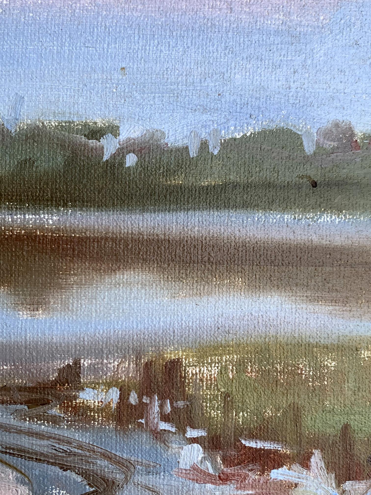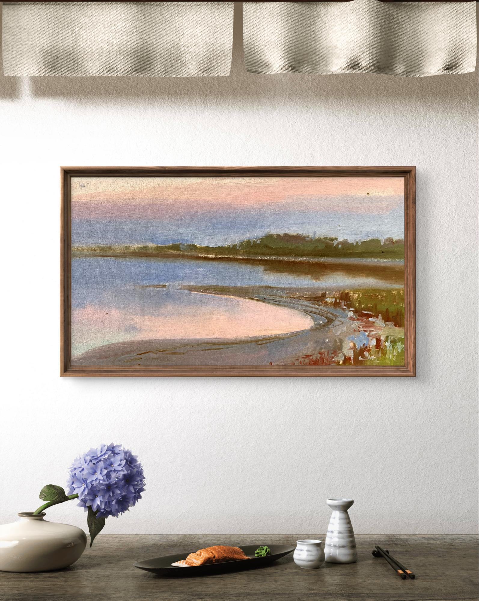 "Flooded River Bank" is an evocative oil painting that captures the serene and tranquil atmosphere of a riverbank submerged in water. The artist has masterfully used soft, muted tones to convey the quiet beauty of this natural scene, drawing the viewer into a moment of stillness and reflection. The artist employs a delicate palette of pastel colors, dominated by soft pinks, blues, and greens. These colors blend harmoniously to create a sense of calm and serenity. The use of oil paints allows for smooth transitions and subtle variations in color, enhancing the overall softness of the scene. The composition is horizontally oriented, emphasizing the expansive nature of the river and its surroundings. The river is the central element of the painting, depicted with a calm surface that reflects the sky and surrounding landscape. The water is painted with gentle, flowing brushstrokes, capturing the subtle ripples and reflections. The riverbank is submerged under water, creating an interesting interplay between land and water. The curved line of the bank adds a dynamic element to the composition, guiding the viewer's eye through the scene. In the background, a line of trees and vegetation is visible, rendered in soft greens and browns. The distant foliage is painted with a loose, impressionistic style, adding depth and a sense of distance to the scene. The sky above the river is painted with soft, pastel hues of pink and blue, suggesting either dawn or dusk. The gradient of colors creates a tranquil atmosphere, complementing the peacefulness of the flooded riverbank. The main feature of the painting, symbolizing the gentle encroachment of water over land, creating a scene of quiet beauty. The smooth, reflective surface of the water adds to the serene mood of the painting, capturing the essence of a still, peaceful moment in nature. The sky's pastel colors enhance the overall tranquility of the scene, creating a harmonious balance with the other elements of the painting. The mood of "Flooded River Bank" is one of peaceful solitude and quiet reflection. The soft colors and gentle composition evoke a sense of calm and tranquility, inviting the viewer to pause and appreciate the beauty of nature. "Flooded River Bank" can be interpreted as a celebration of nature's quiet moments and the beauty of natural landscapes. The painting captures a serene scene where water and land merge, creating a tranquil and harmonious environment. The artist's skillful use of color, light, and composition brings this moment to life, making "Flooded River Bank" a captivating and soothing piece that resonates with viewers on an emotional level.