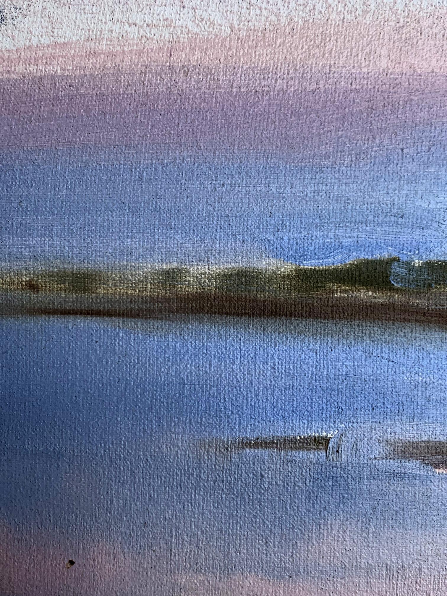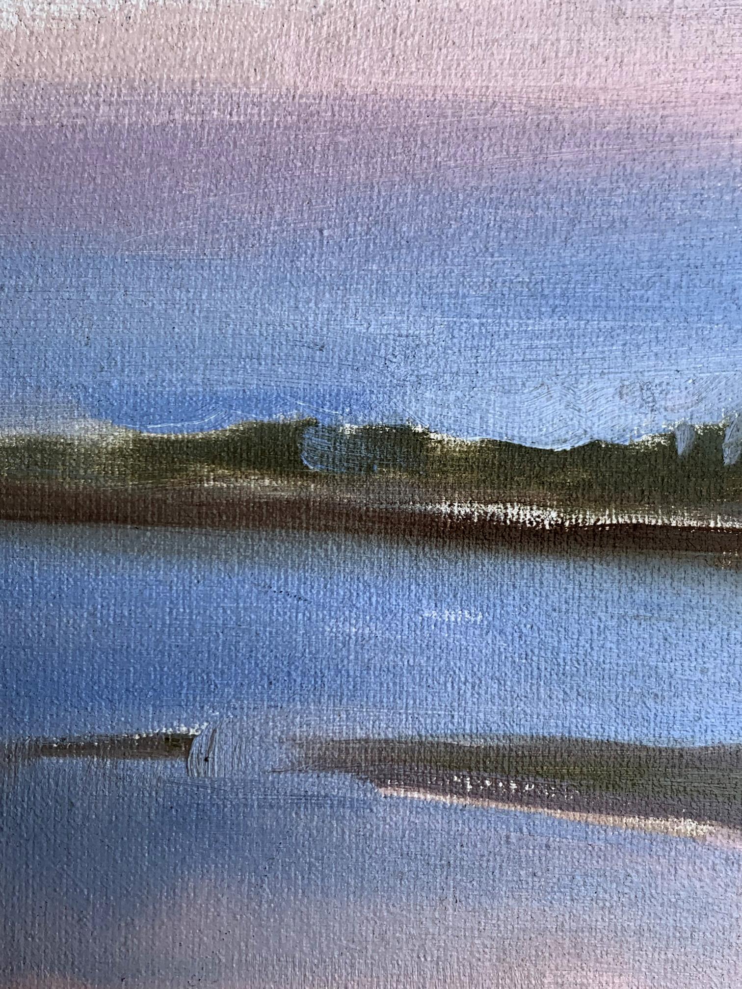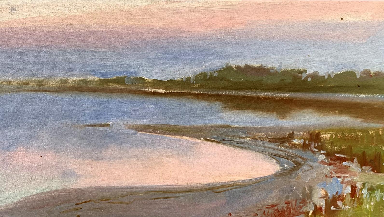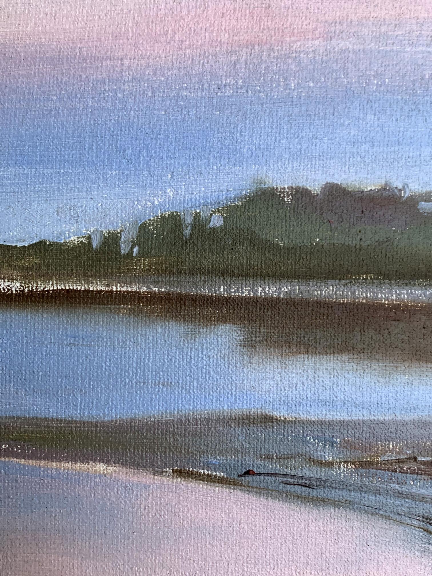 "Flooded River Bank" is an evocative oil painting that captures the serene and tranquil atmosphere of a riverbank submerged in water. The artist has masterfully used soft, muted tones to convey the quiet beauty of this natural scene, drawing the viewer into a moment of stillness and reflection. The artist employs a delicate palette of pastel colors, dominated by soft pinks, blues, and greens. These colors blend harmoniously to create a sense of calm and serenity. The use of oil paints allows for smooth transitions and subtle variations in color, enhancing the overall softness of the scene. The composition is horizontally oriented, emphasizing the expansive nature of the river and its surroundings. The river is the central element of the painting, depicted with a calm surface that reflects the sky and surrounding landscape. The water is painted with gentle, flowing brushstrokes, capturing the subtle ripples and reflections. The riverbank is submerged under water, creating an interesting interplay between land and water. The curved line of the bank adds a dynamic element to the composition, guiding the viewer's eye through the scene. In the background, a line of trees and vegetation is visible, rendered in soft greens and browns. The distant foliage is painted with a loose, impressionistic style, adding depth and a sense of distance to the scene. The sky above the river is painted with soft, pastel hues of pink and blue, suggesting either dawn or dusk. The gradient of colors creates a tranquil atmosphere, complementing the peacefulness of the flooded riverbank. The main feature of the painting, symbolizing the gentle encroachment of water over land, creating a scene of quiet beauty. The smooth, reflective surface of the water adds to the serene mood of the painting, capturing the essence of a still, peaceful moment in nature. The sky's pastel colors enhance the overall tranquility of the scene, creating a harmonious balance with the other elements of the painting. The mood of "Flooded River Bank" is one of peaceful solitude and quiet reflection. The soft colors and gentle composition evoke a sense of calm and tranquility, inviting the viewer to pause and appreciate the beauty of nature. "Flooded River Bank" can be interpreted as a celebration of nature's quiet moments and the beauty of natural landscapes. The painting captures a serene scene where water and land merge, creating a tranquil and harmonious environment. The artist's skillful use of color, light, and composition brings this moment to life, making "Flooded River Bank" a captivating and soothing piece that resonates with viewers on an emotional level.