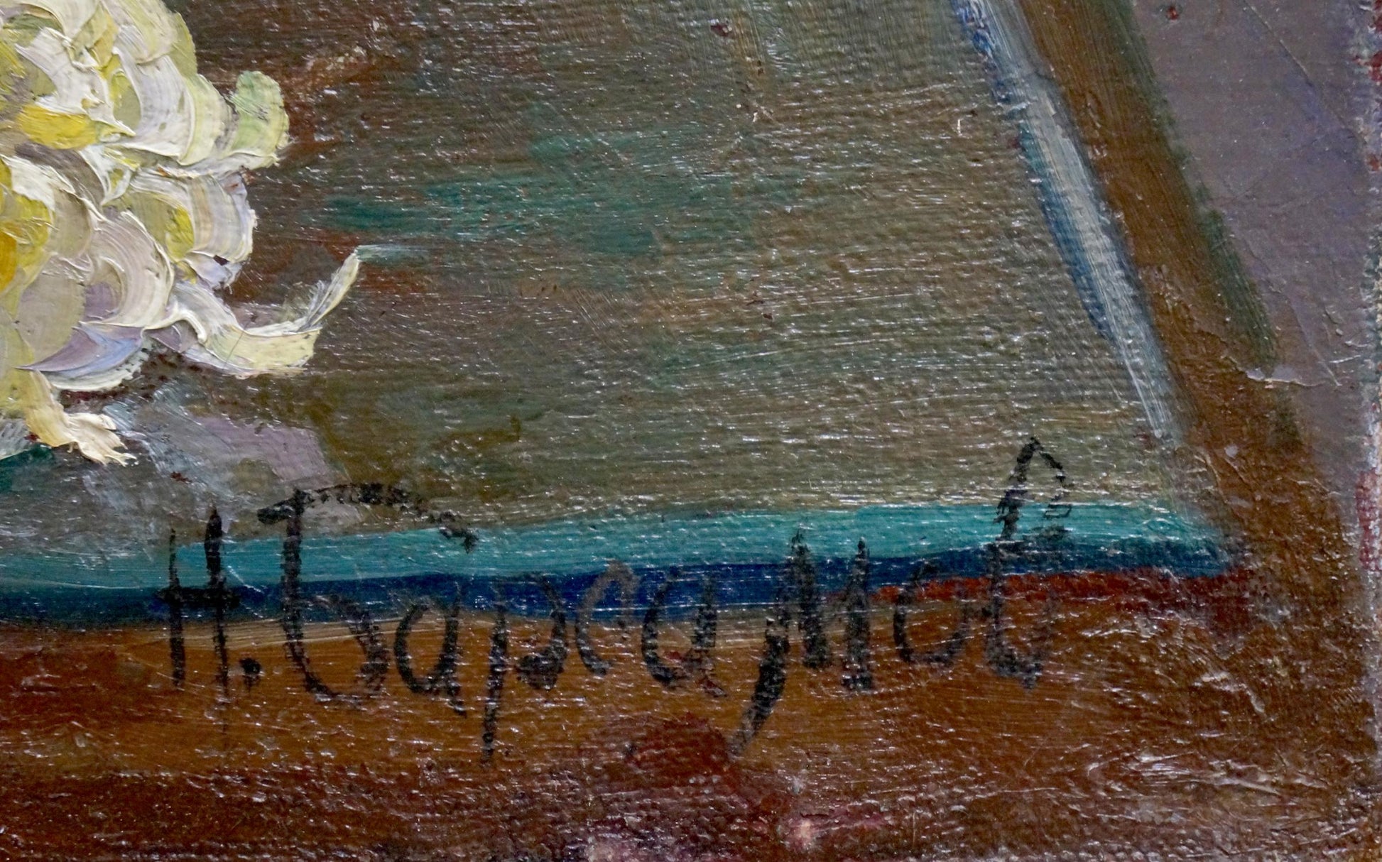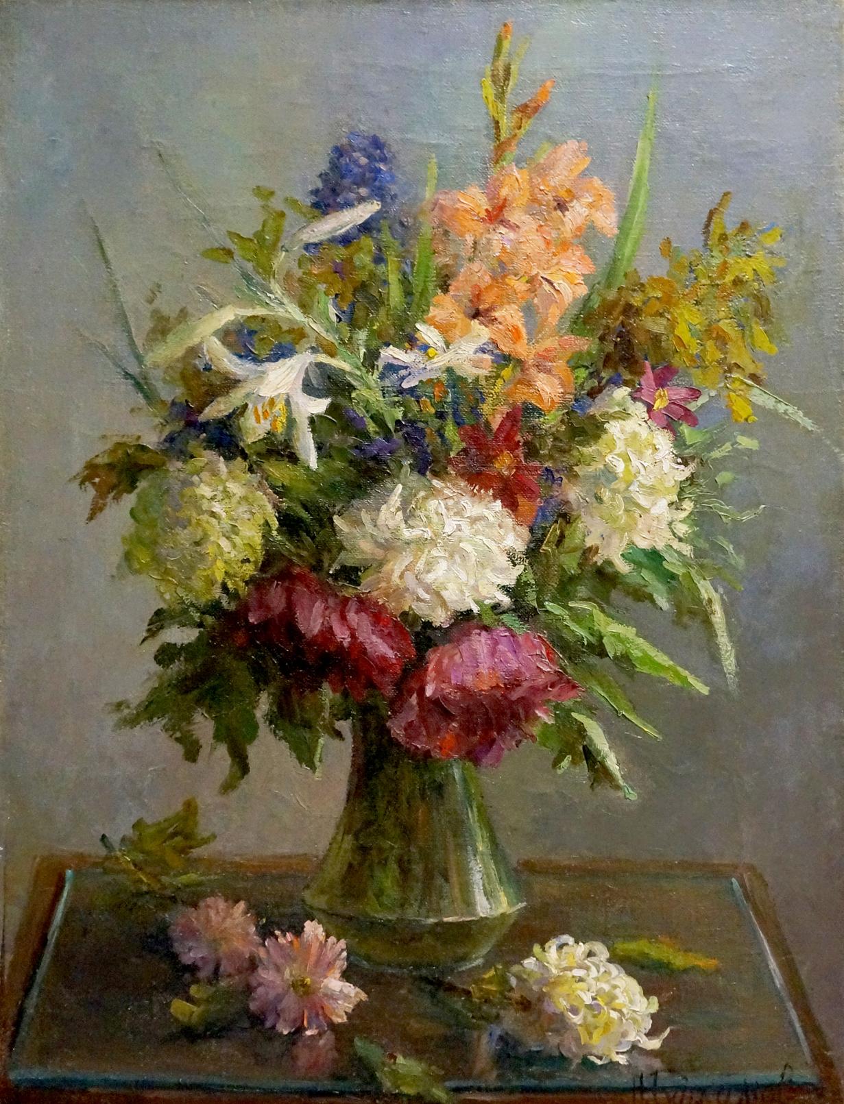 About the artist: Born on November 6, 1892 in Tiflis (now Tbilisi, Georgian SSR). He graduated from the Moscow School of Painting, Sculpture and Architecture (1918). Teachers by specialty - K. Korevoy, S. Malyutin. He worked in the industry of easel painting and art history. Main works: portrait of the honored artist of the RSFSR K. F. Bogaevsky (1940); "In the workshop of the artist" (1952); “Grapes and peaches” (1959); "Tassels of grapes" (1959); “Flowers in a White Crib” (1967); monograph "1. K. Aivazovsky ”, M., 1950, Simferopol, 1953, Budapest, 1962; "TO. F. Bogaevsky ", M., 1962 and others. He participated in exhibitions since 1927, republican from 1949, all-Union since 1938, personal - Feodosia, Simferopol, 1958; Kiev, 1959. Honored Worker of Culture of the Ukrainian SSR (1969). He was awarded the Order of the Red Banner of Labor and a medal. He died on September 11, 1976.