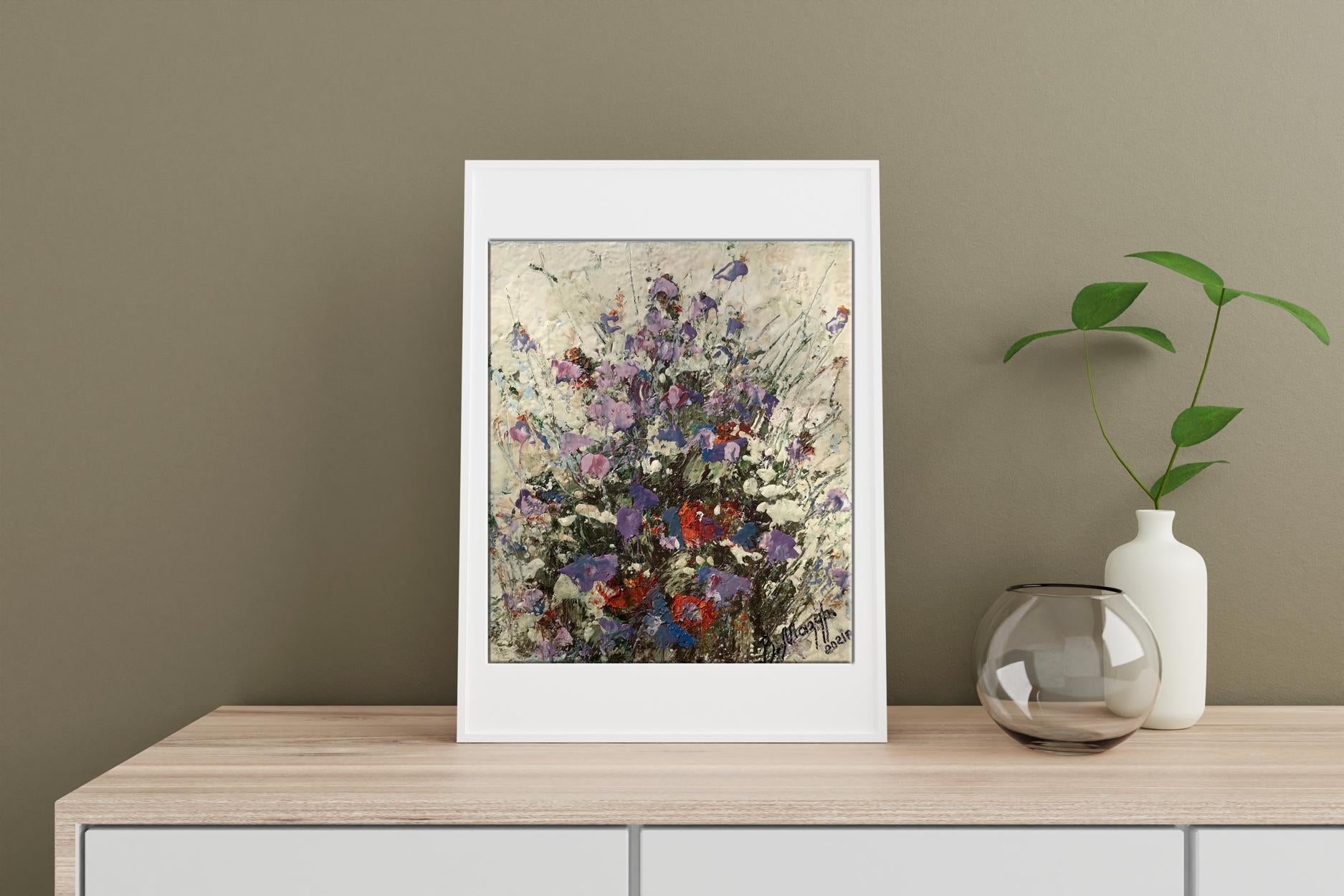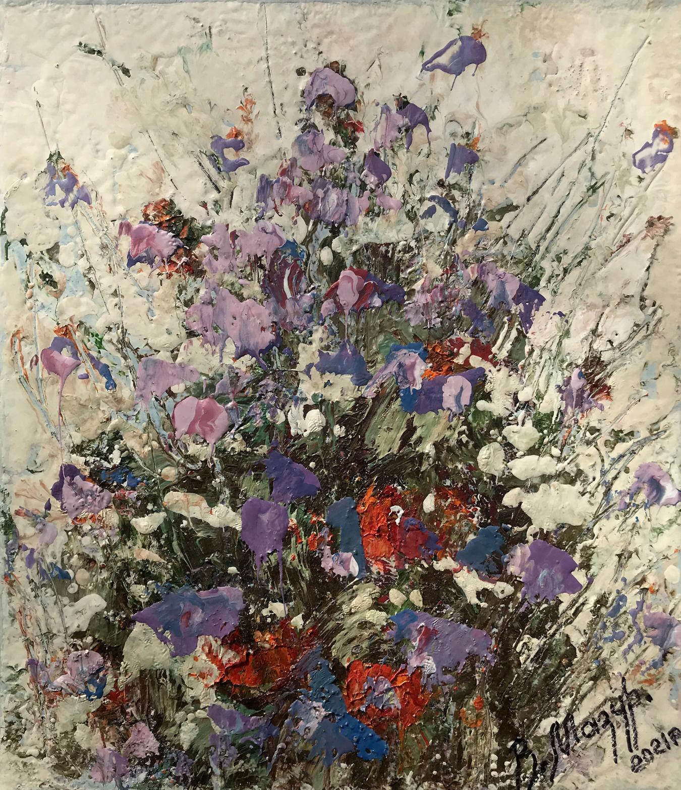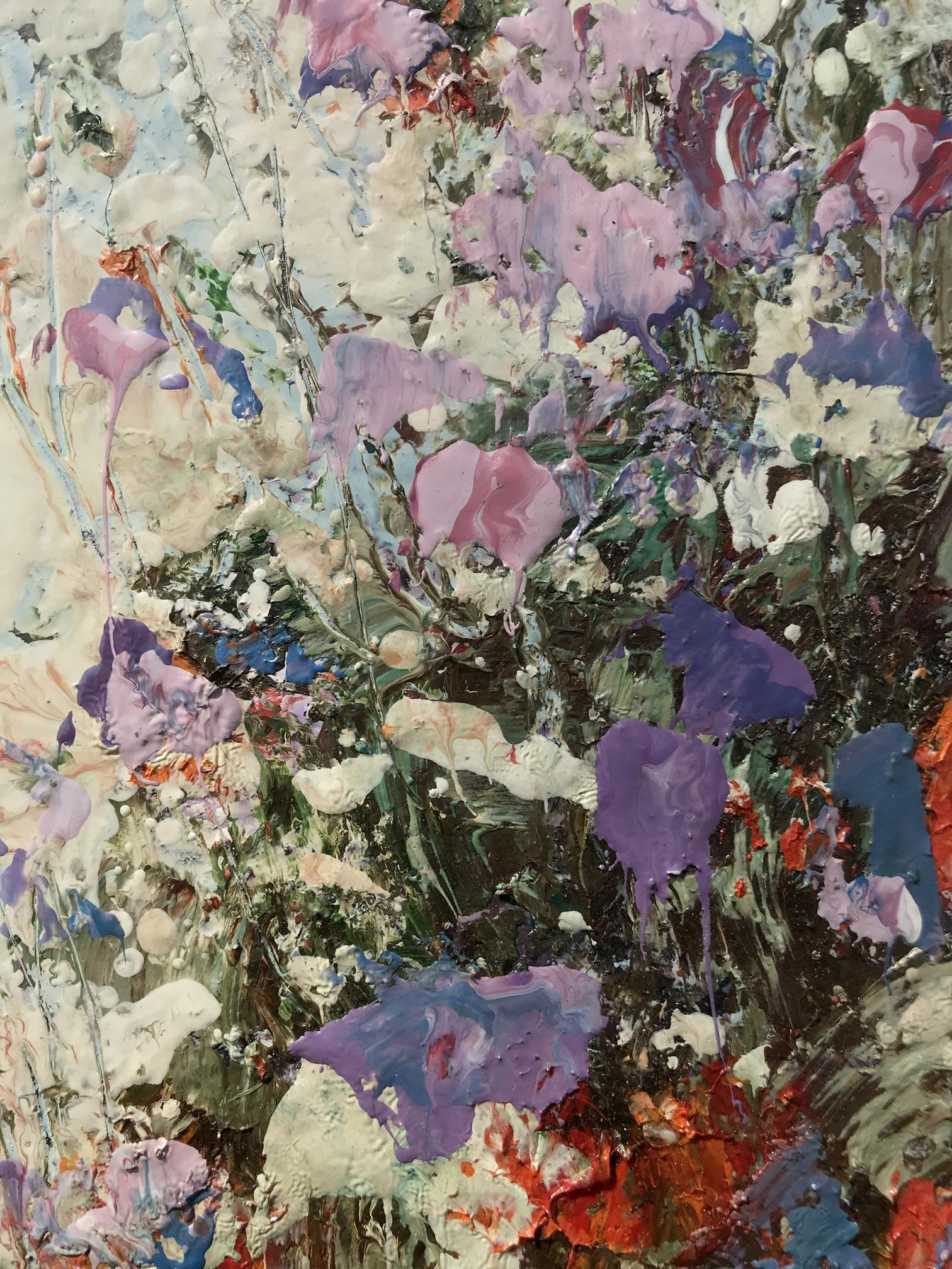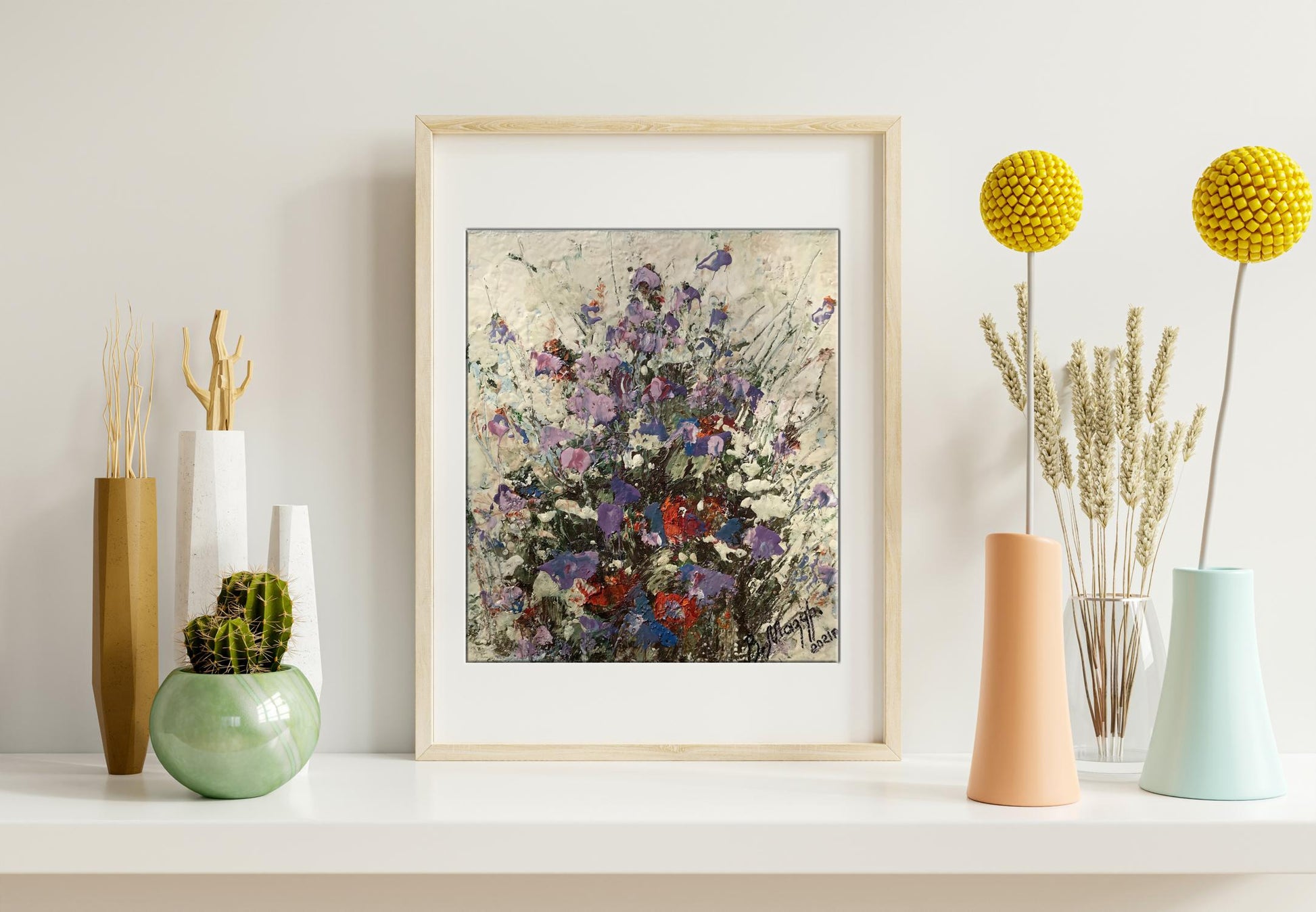 The oil painting is a vibrant depiction of abstract flowers in striking shades of red, blue, and purple. The blooms appear to be almost bursting out of the canvas, with thick layers of paint giving them a sense of depth and texture. The flowers themselves are not immediately recognizable as any particular species, but instead seem to be a wild and exuberant expression of color and form. The background of the painting is a pure, crisp white, which serves to highlight the vivid hues of the flowers all the more. The white background also creates a sense of space and openness around the flowers, as if they are suspended in a bright, airy void. The brushstrokes in the painting are bold and expressive, with the artist using thick, impasto layers of paint to create a sense of movement and energy in the composition. There is a sense of joy and exuberance in the way the flowers are rendered, as if the artist has captured the very essence of life and vitality in these colorful, abstract forms. Overall, this oil painting is a stunning tribute to the beauty and power of color, with its dynamic use of brushwork and abstract forms creating a sense of joy and energy that is sure to delight anyone who beholds it.