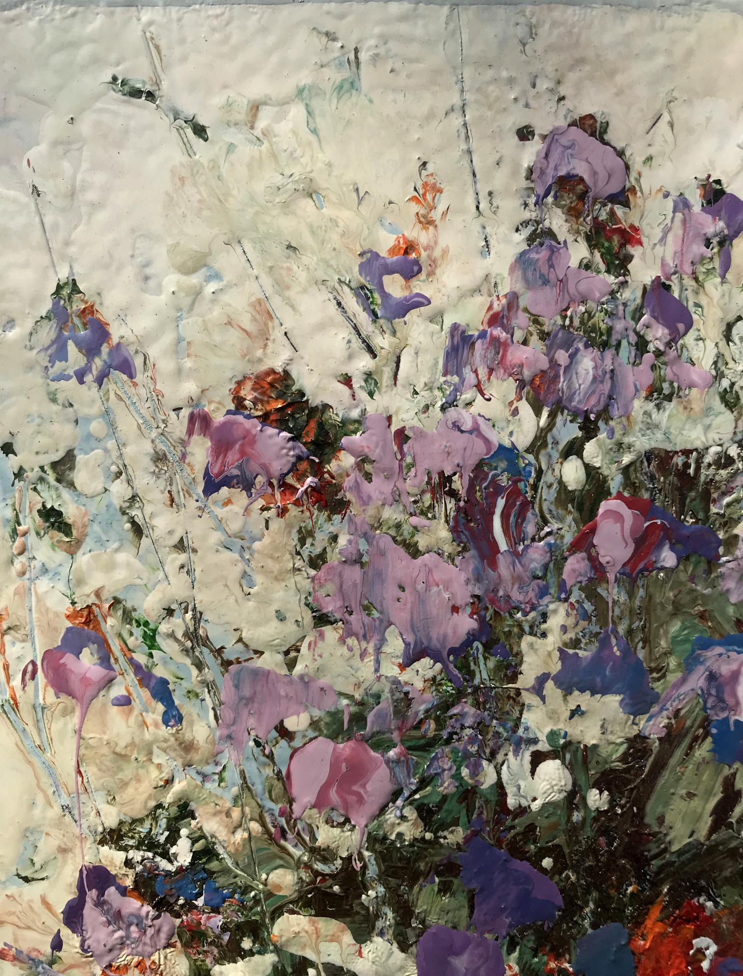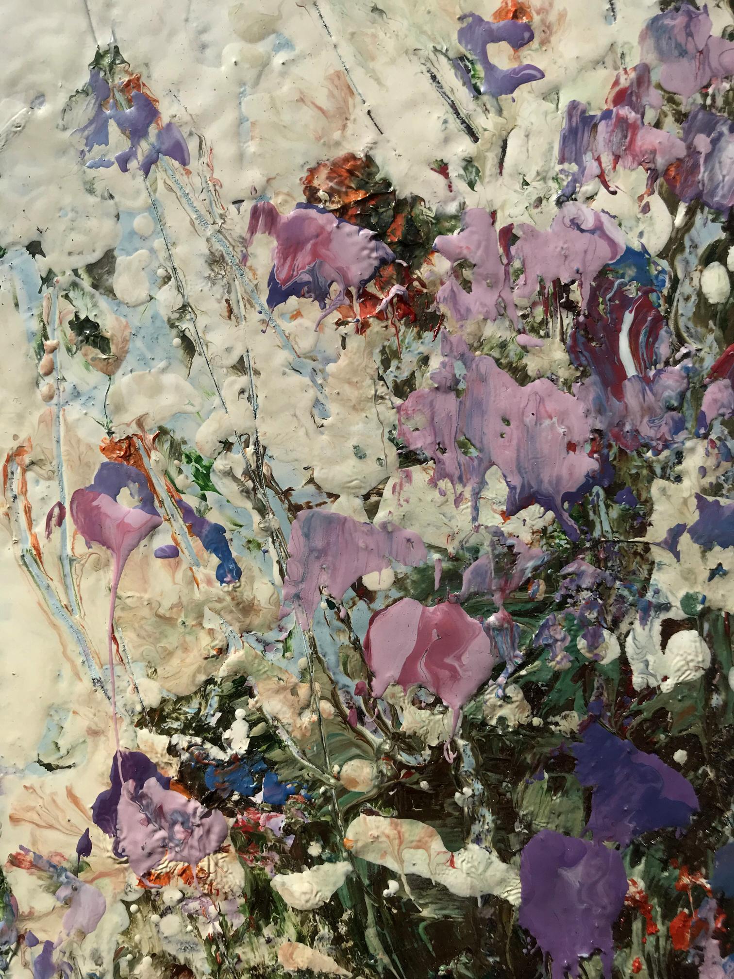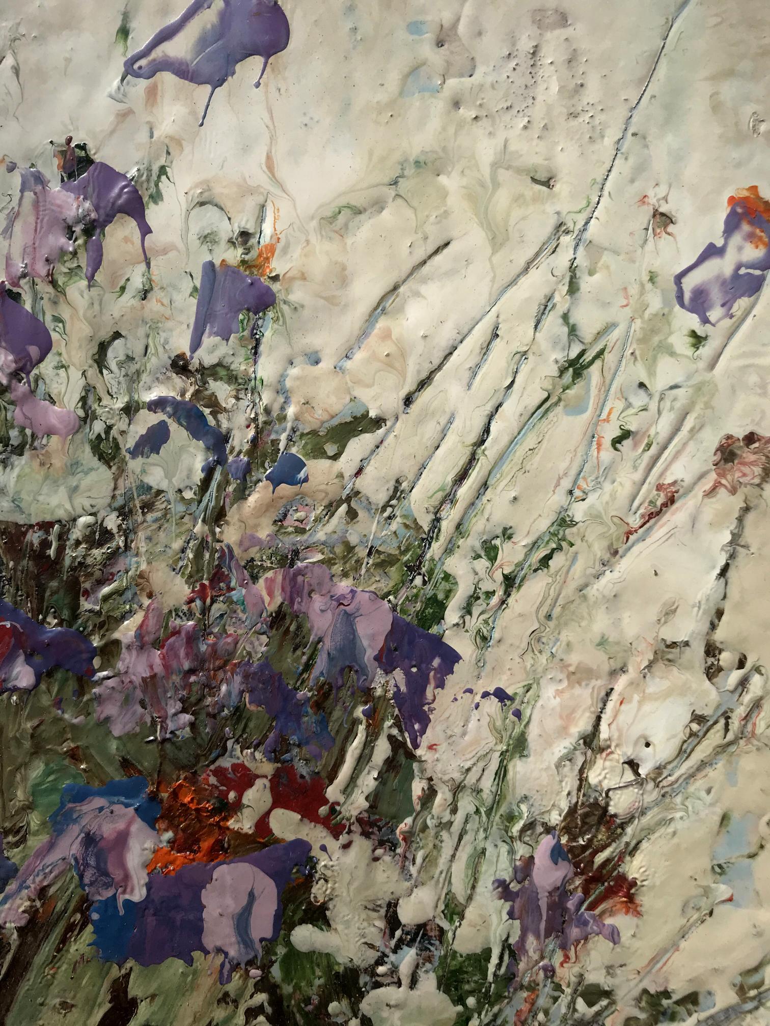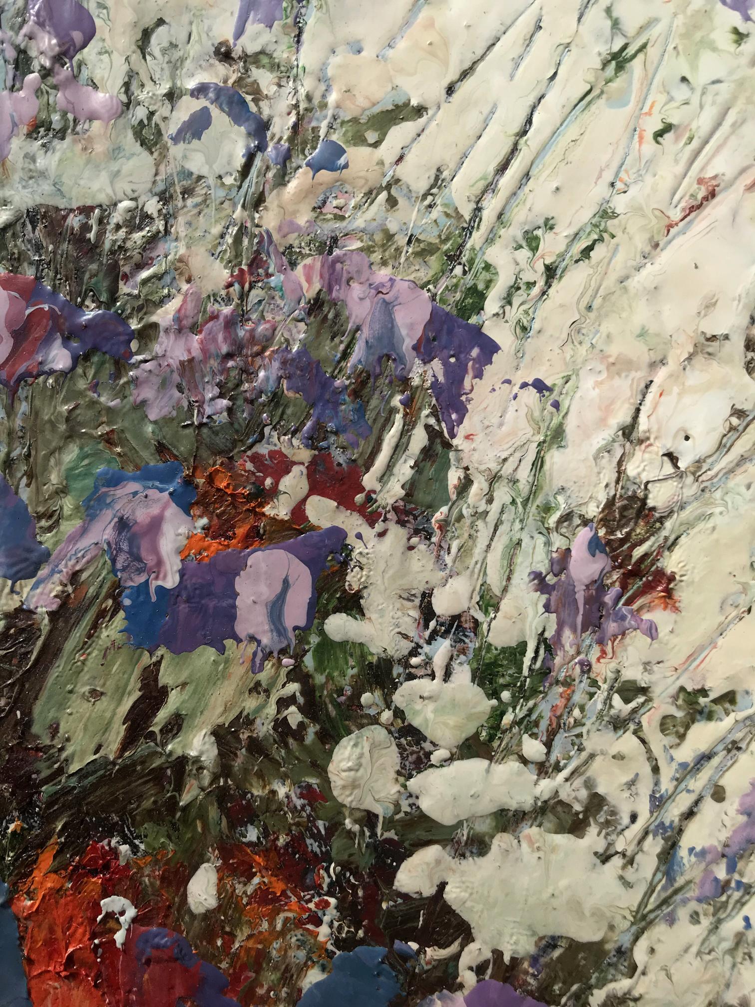 The oil painting is a vibrant depiction of abstract flowers in striking shades of red, blue, and purple. The blooms appear to be almost bursting out of the canvas, with thick layers of paint giving them a sense of depth and texture. The flowers themselves are not immediately recognizable as any particular species, but instead seem to be a wild and exuberant expression of color and form. The background of the painting is a pure, crisp white, which serves to highlight the vivid hues of the flowers all the more. The white background also creates a sense of space and openness around the flowers, as if they are suspended in a bright, airy void. The brushstrokes in the painting are bold and expressive, with the artist using thick, impasto layers of paint to create a sense of movement and energy in the composition. There is a sense of joy and exuberance in the way the flowers are rendered, as if the artist has captured the very essence of life and vitality in these colorful, abstract forms. Overall, this oil painting is a stunning tribute to the beauty and power of color, with its dynamic use of brushwork and abstract forms creating a sense of joy and energy that is sure to delight anyone who beholds it.