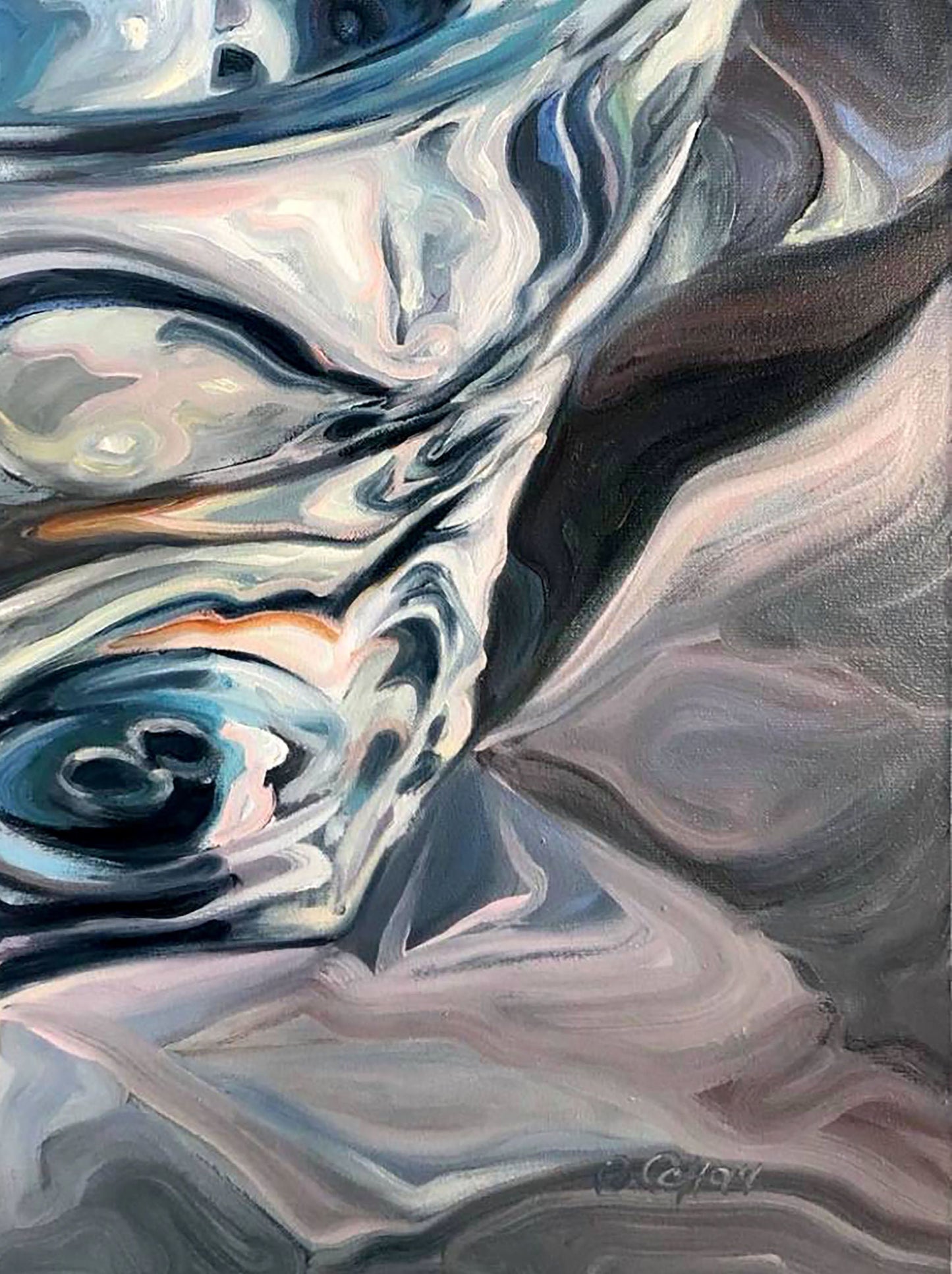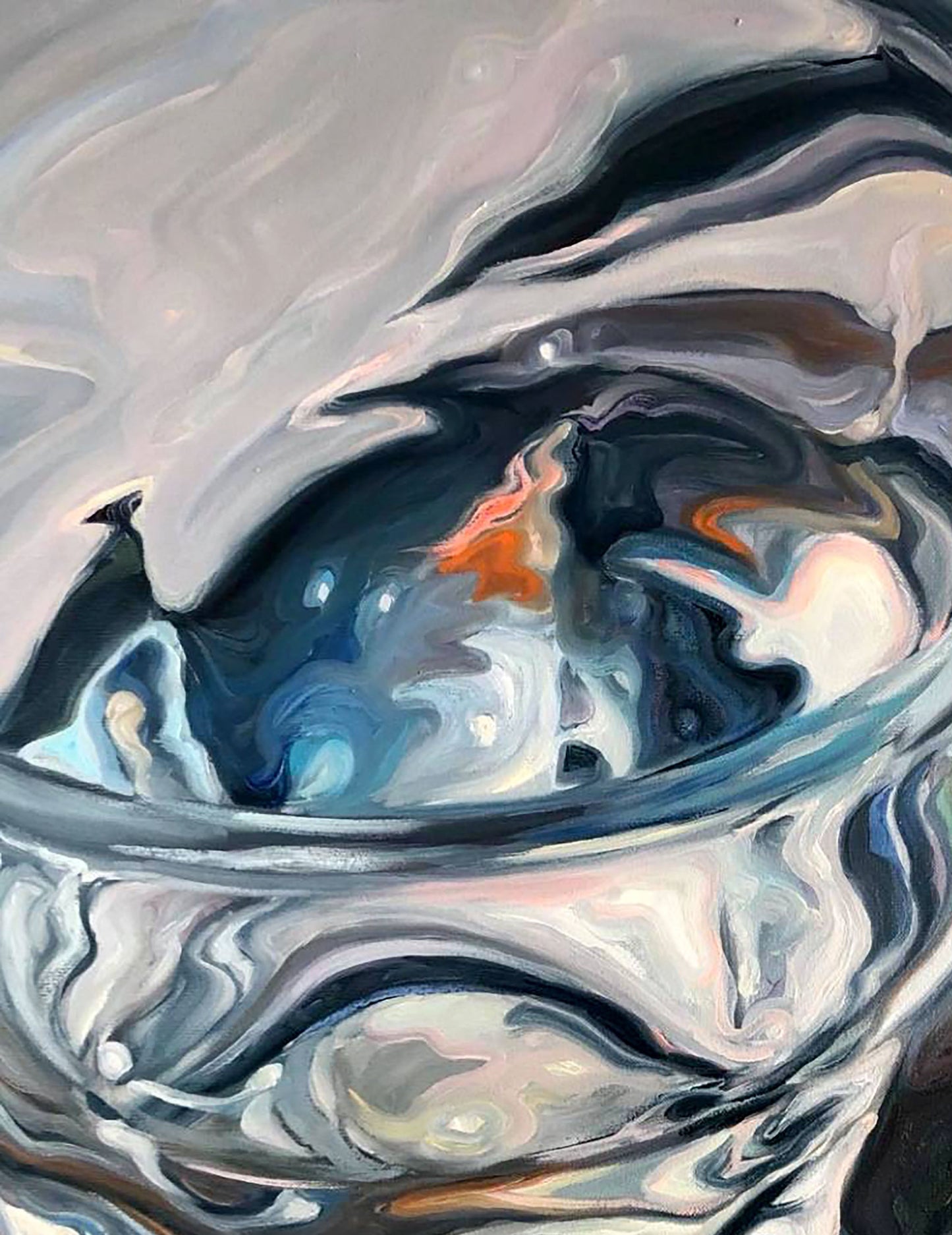 "For Coffee" by Ukrainian artist Osnach Olesia presents a unique and mesmerizing depiction of a simple glass cup. Through swirling brushstrokes and masterful use of light, Olesia transforms an everyday object into a dynamic and visually intriguing composition. The painting showcases the delicate interaction of light and glass, with cool tones of blues, grays, and whites contrasting against warm hints of orange, creating a captivating interplay of light and shadow.