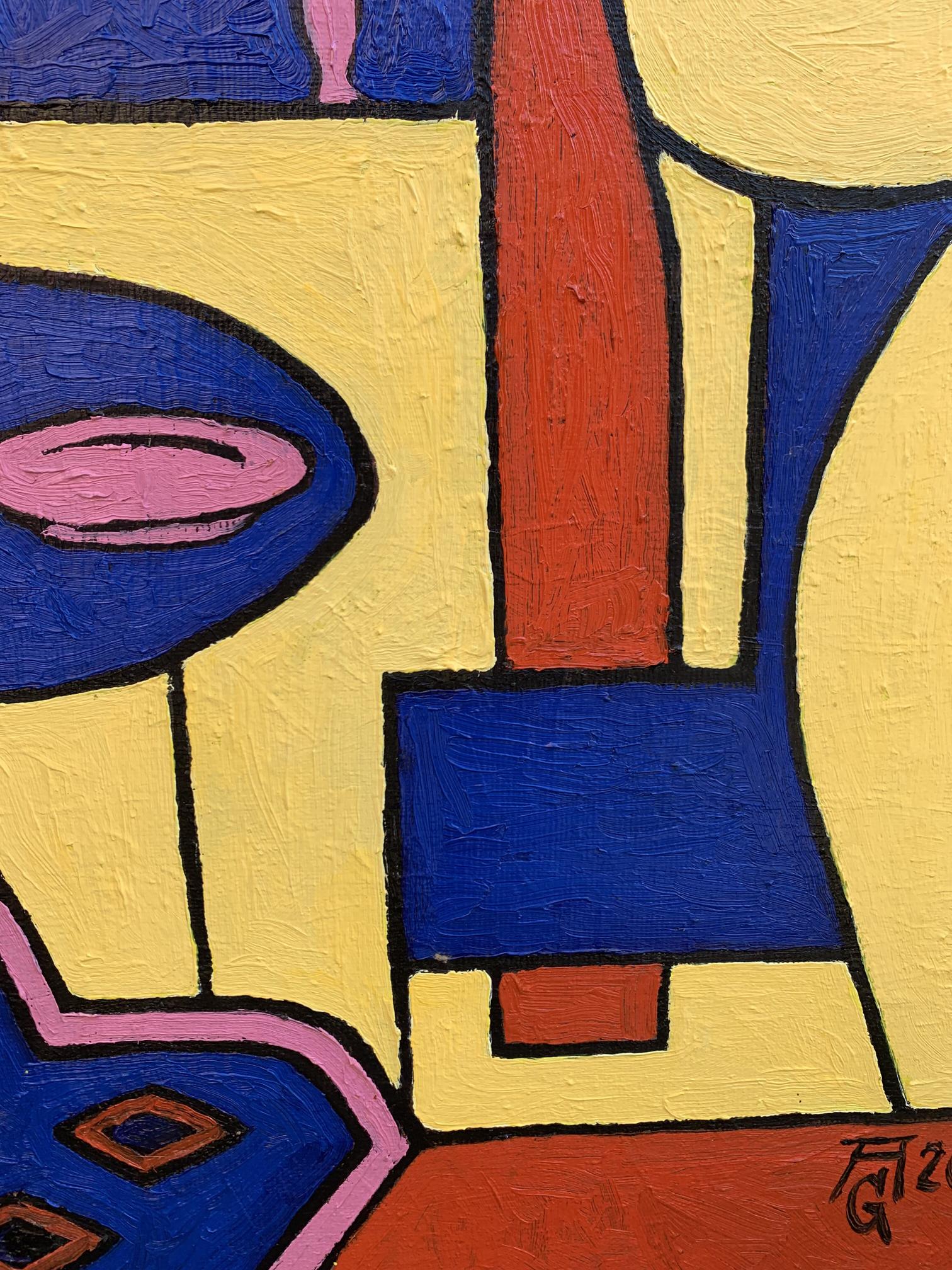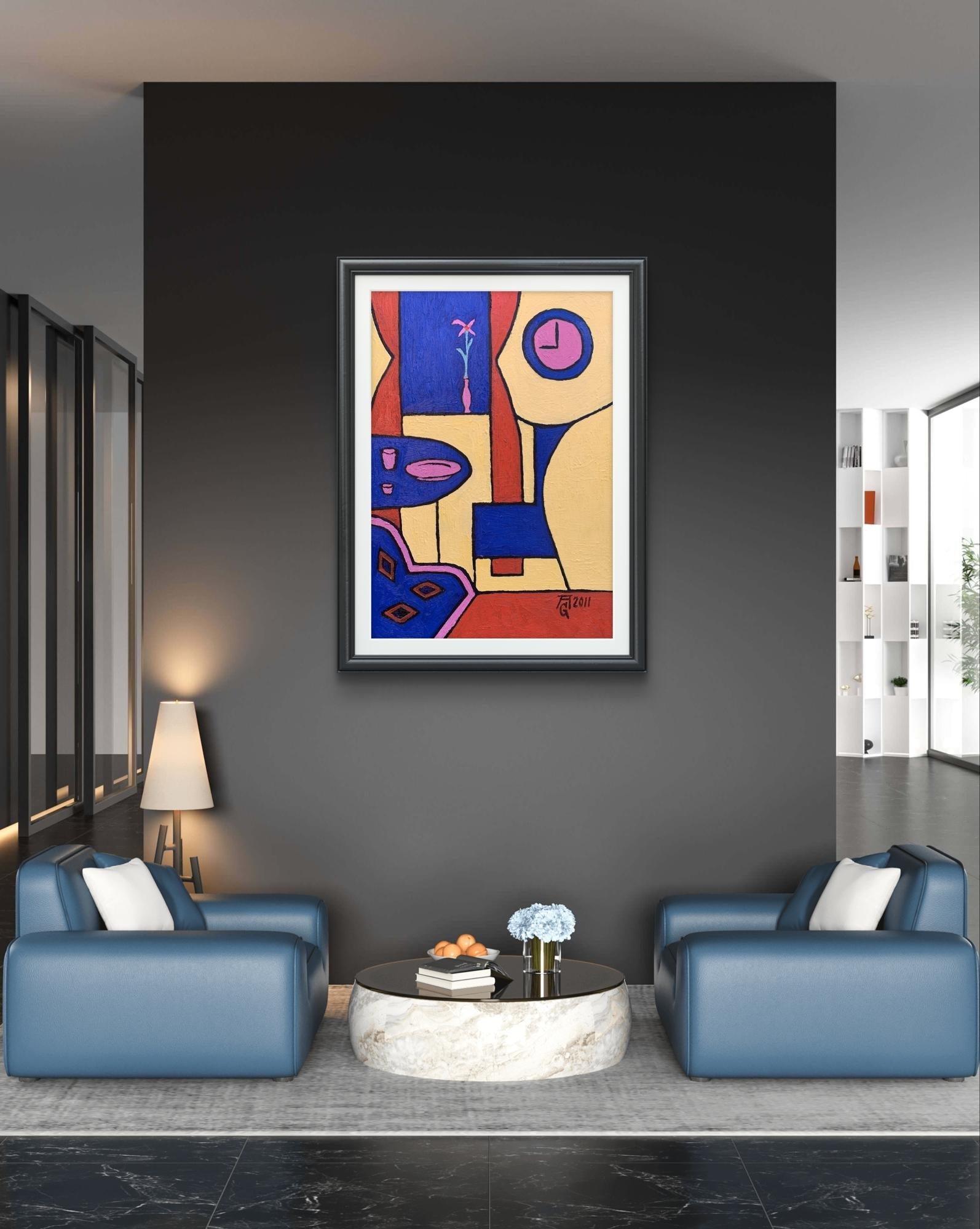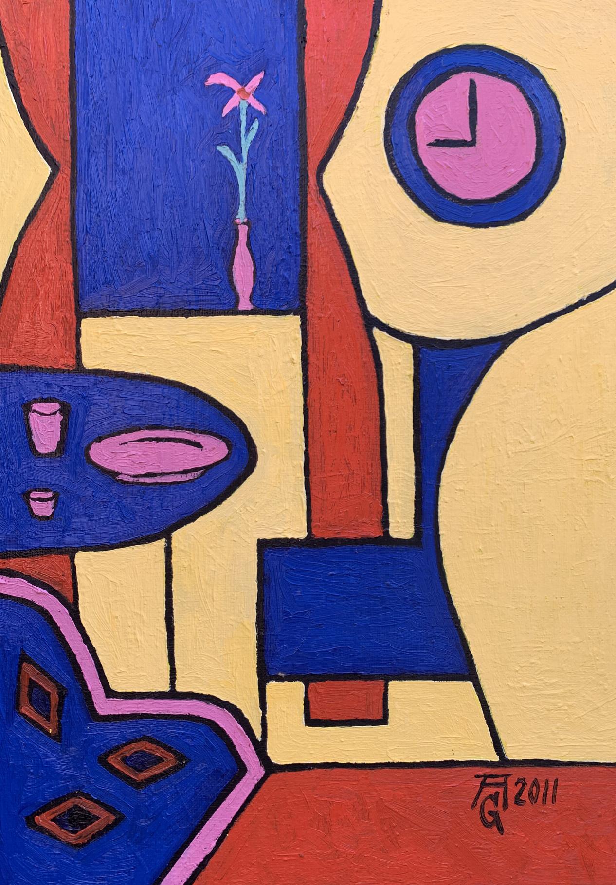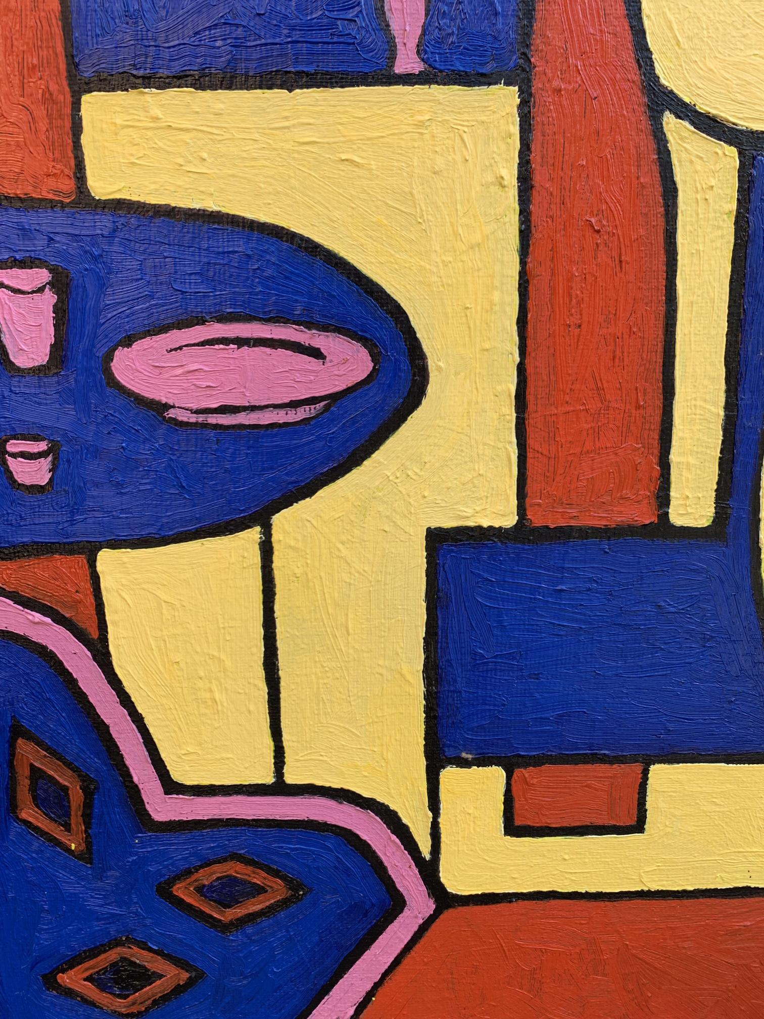 The painting "For Dinner" is a vivid and abstract oil on canvas piece that captures the essence of a dining experience through the use of geometric shapes and bold colors. The artist employs a vibrant color palette dominated by primary colors such as blue, red, and yellow, complemented by pink and black outlines. The technique features flat, even areas of color with distinct black lines separating each shape, reminiscent of stained glass or a mosaic. This method creates a strong, graphic quality to the composition, emphasizing the structured and deliberate placement of each element. The composition is an abstract interpretation of a dining scene, divided into various geometric shapes and sections. Each part of the painting represents different elements typically found in a dining setting, arranged in a non-traditional, almost cubist style. In the lower left portion of the painting, an oval-shaped table is depicted in blue, with a pink plate and a glass. The table is outlined in black and bordered with a thin line of pink, adding contrast and focus to this central element. Centrally placed within a blue rectangle is a pink vase holding a single pink flower with a green stem. This element adds a touch of delicacy and elegance to the composition, contrasting with the bold geometric shapes. In the upper right, a circular clock with a pink face and blue border is depicted. The clock is set against a yellow background, drawing attention to the passage of time during the dining experience. On either side of the vase, red shapes suggest the presence of curtains or drapes, adding a sense of interior space and framing the central elements of the painting. The background consists of flat areas of yellow and blue, which are interspersed throughout the composition. These colors help to unify the various elements, creating a cohesive and harmonious overall effect. The overall mood of the painting is lively and inviting, with the vibrant colors and dynamic composition evoking a sense of joy and celebration. The abstract nature of the piece allows viewers to interpret the scene in their own way, finding personal meaning and connections within the familiar elements of a dining setting. "For Dinner" can be seen as an exploration of the dining experience, abstracted into its essential components and reimagined through the lens of modern art. The use of bold colors and geometric shapes transforms ordinary objects into visually striking elements, encouraging viewers to appreciate the beauty in everyday scenes. This painting masterfully combines abstract and representational elements to create a vibrant and engaging depiction of a dinner setting, using color and form to evoke a sense of warmth and conviviality.