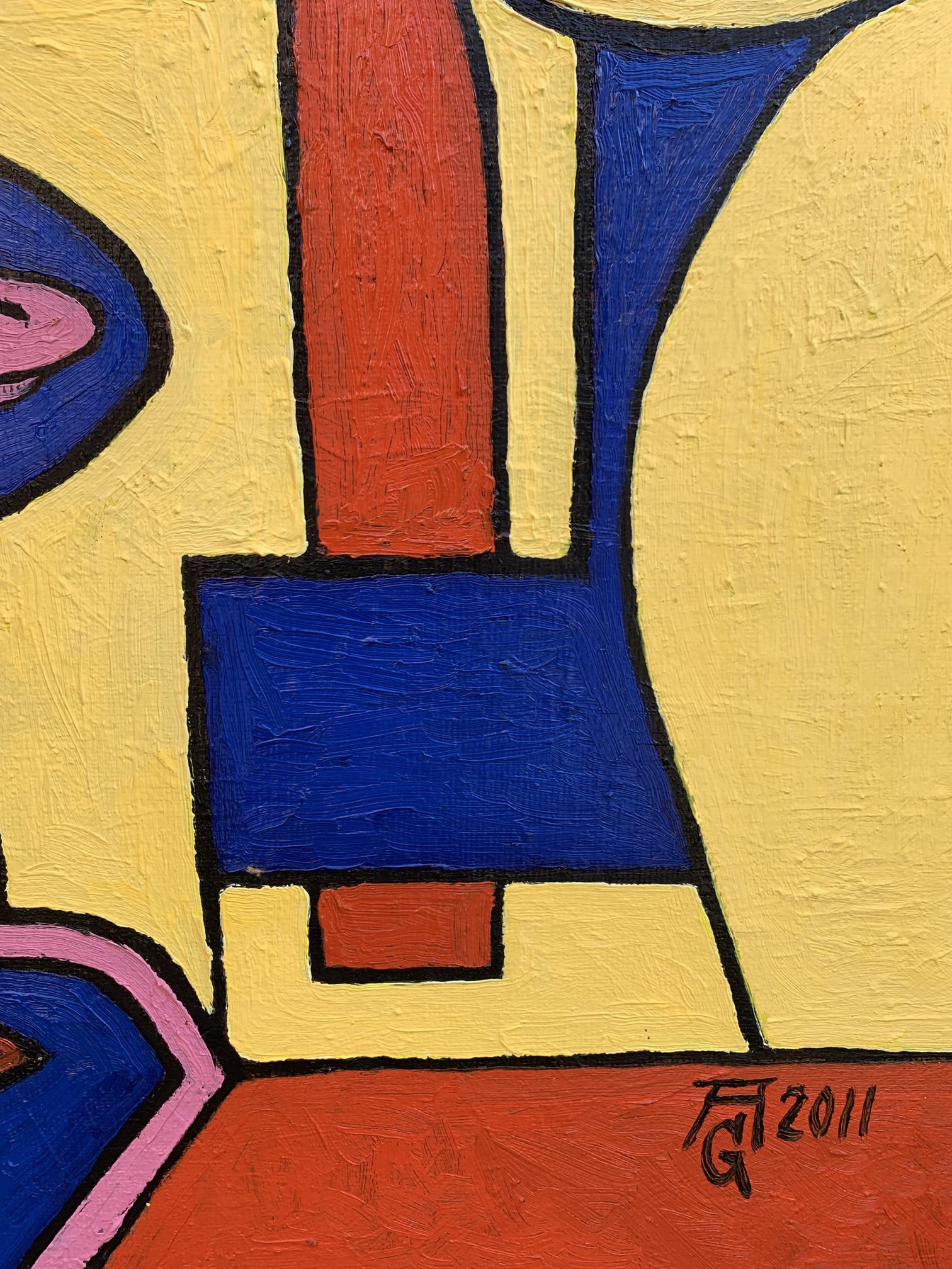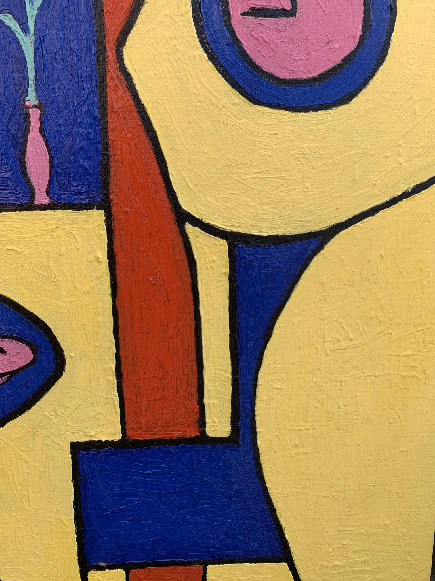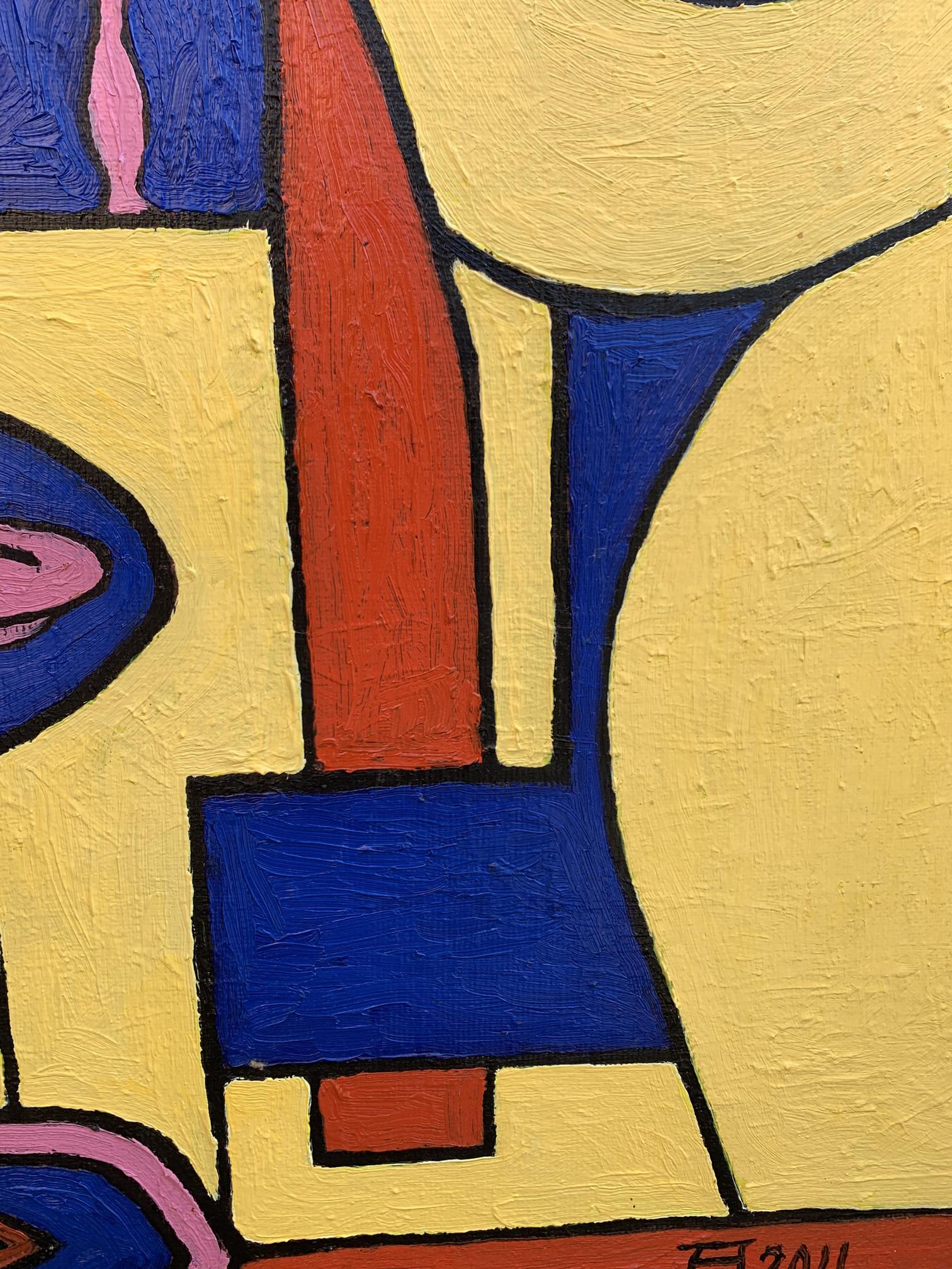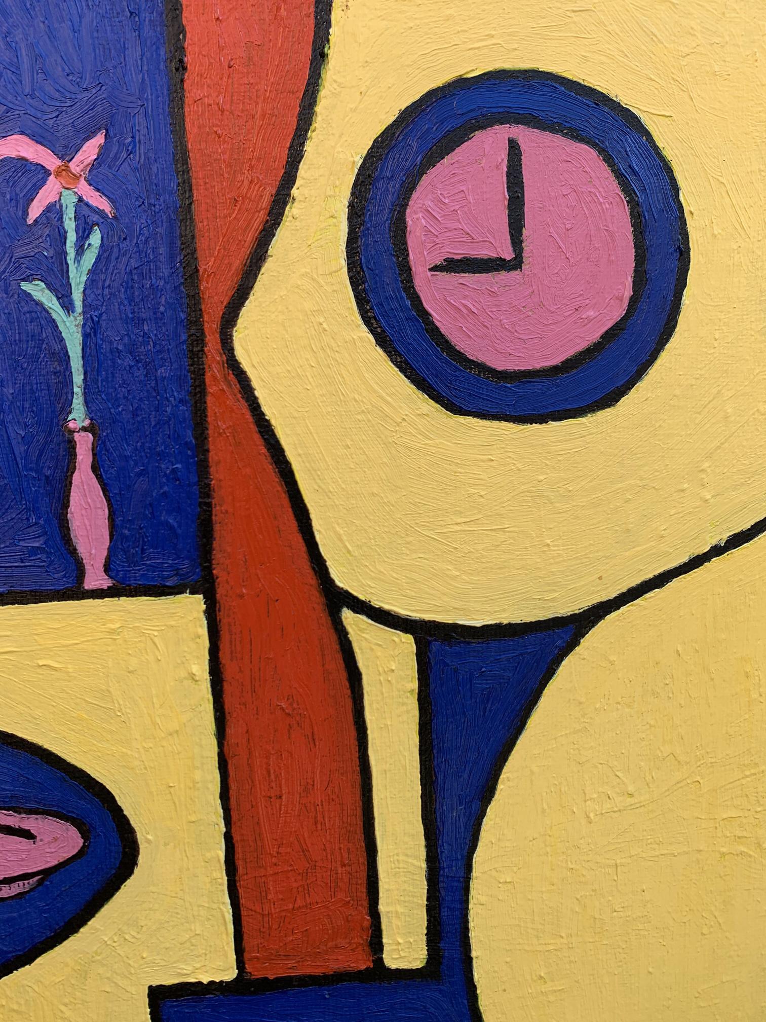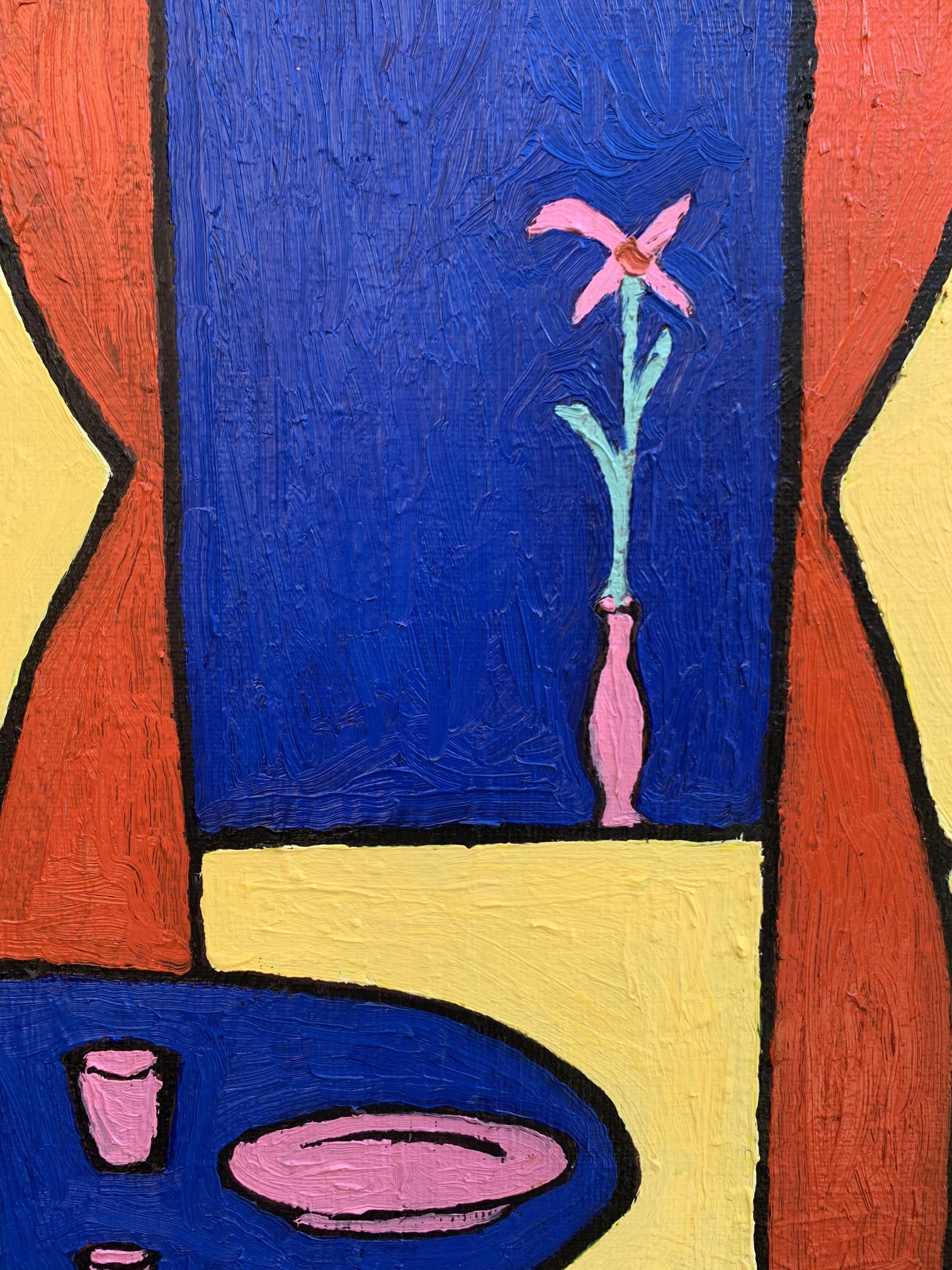 The painting "For Dinner" is a vivid and abstract oil on canvas piece that captures the essence of a dining experience through the use of geometric shapes and bold colors. The artist employs a vibrant color palette dominated by primary colors such as blue, red, and yellow, complemented by pink and black outlines. The technique features flat, even areas of color with distinct black lines separating each shape, reminiscent of stained glass or a mosaic. This method creates a strong, graphic quality to the composition, emphasizing the structured and deliberate placement of each element. The composition is an abstract interpretation of a dining scene, divided into various geometric shapes and sections. Each part of the painting represents different elements typically found in a dining setting, arranged in a non-traditional, almost cubist style. In the lower left portion of the painting, an oval-shaped table is depicted in blue, with a pink plate and a glass. The table is outlined in black and bordered with a thin line of pink, adding contrast and focus to this central element. Centrally placed within a blue rectangle is a pink vase holding a single pink flower with a green stem. This element adds a touch of delicacy and elegance to the composition, contrasting with the bold geometric shapes. In the upper right, a circular clock with a pink face and blue border is depicted. The clock is set against a yellow background, drawing attention to the passage of time during the dining experience. On either side of the vase, red shapes suggest the presence of curtains or drapes, adding a sense of interior space and framing the central elements of the painting. The background consists of flat areas of yellow and blue, which are interspersed throughout the composition. These colors help to unify the various elements, creating a cohesive and harmonious overall effect. The overall mood of the painting is lively and inviting, with the vibrant colors and dynamic composition evoking a sense of joy and celebration. The abstract nature of the piece allows viewers to interpret the scene in their own way, finding personal meaning and connections within the familiar elements of a dining setting. "For Dinner" can be seen as an exploration of the dining experience, abstracted into its essential components and reimagined through the lens of modern art. The use of bold colors and geometric shapes transforms ordinary objects into visually striking elements, encouraging viewers to appreciate the beauty in everyday scenes. This painting masterfully combines abstract and representational elements to create a vibrant and engaging depiction of a dinner setting, using color and form to evoke a sense of warmth and conviviality.