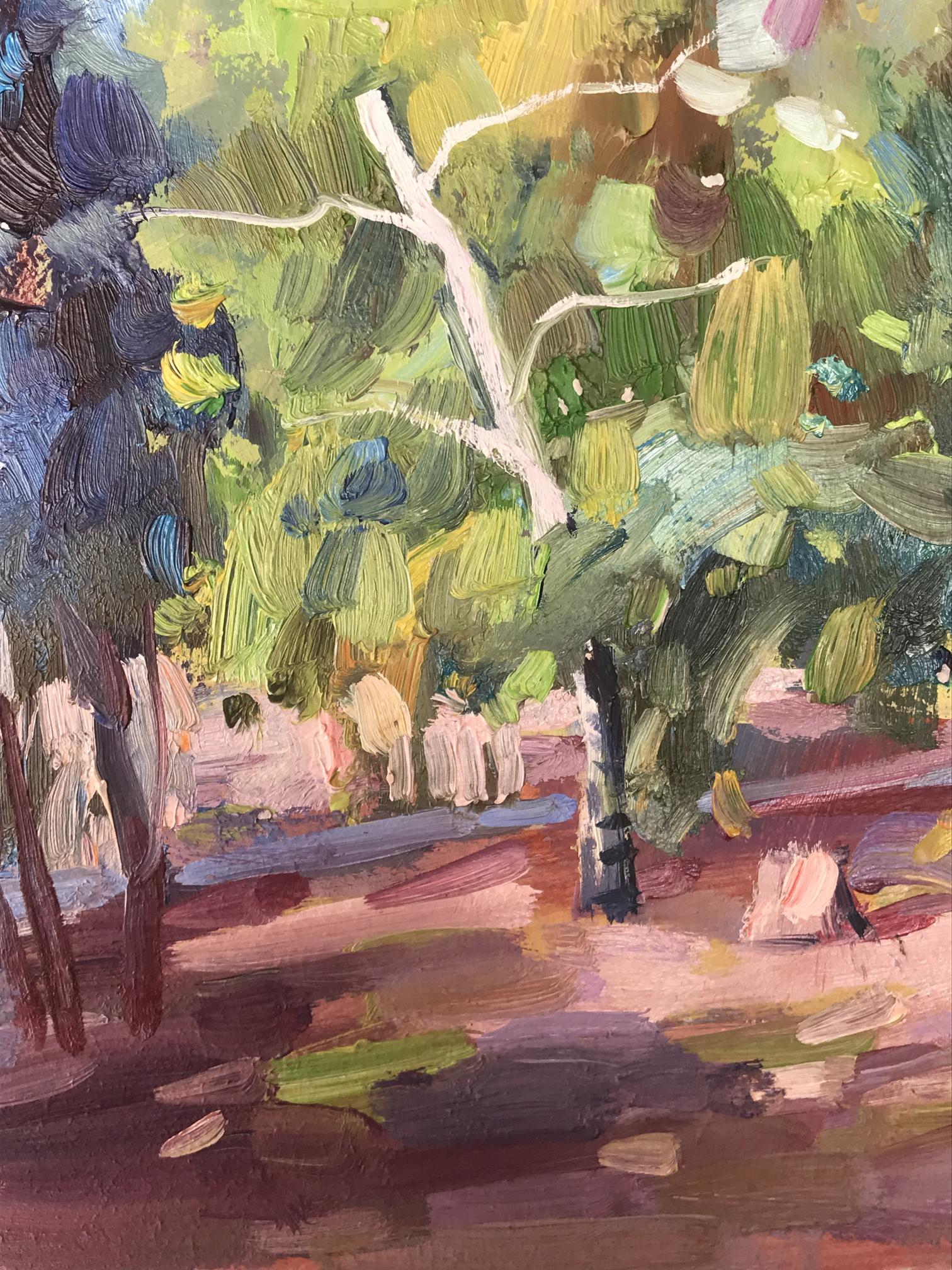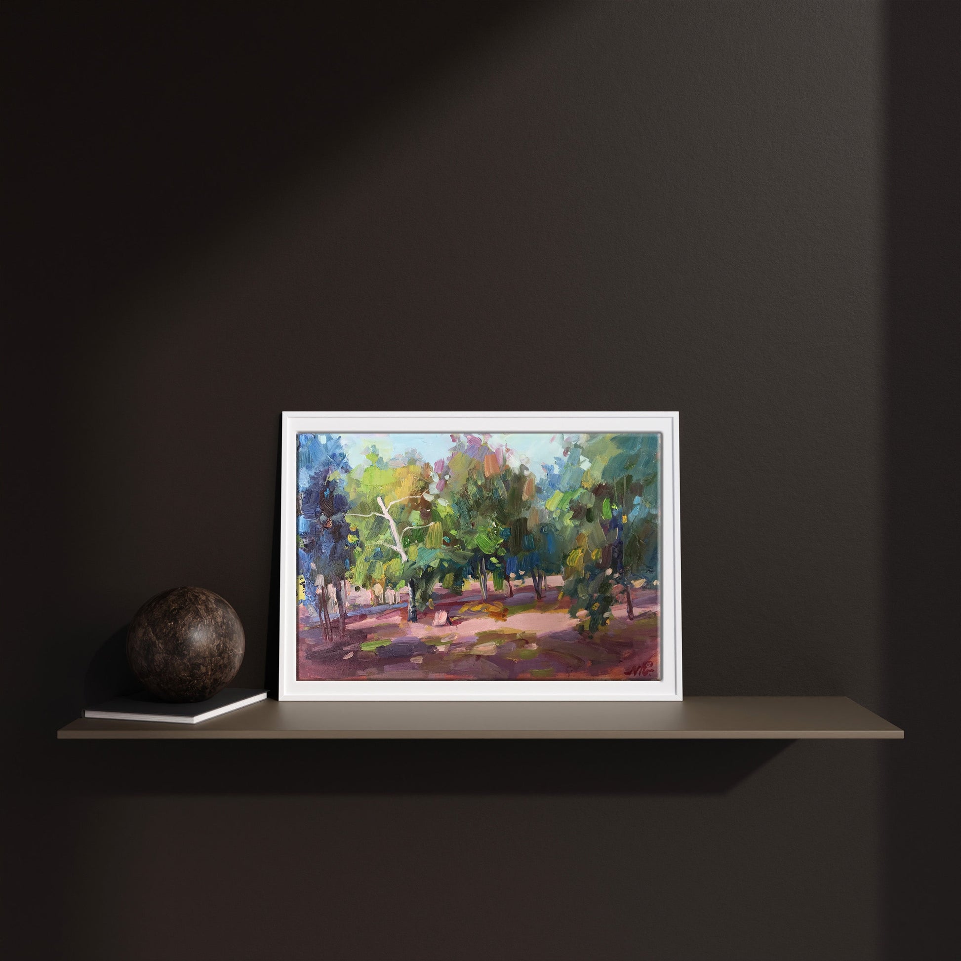 Looking for a way to escape the summer heat? Forest park is the perfect place to do just that! This oil painting captures the cooling effect of a shady glade in a summer forest. The bold greens and blues create a refreshing, inviting atmosphere. Hang this painting in your home and enjoy the feeling of being immersed in nature, even on the hot days.