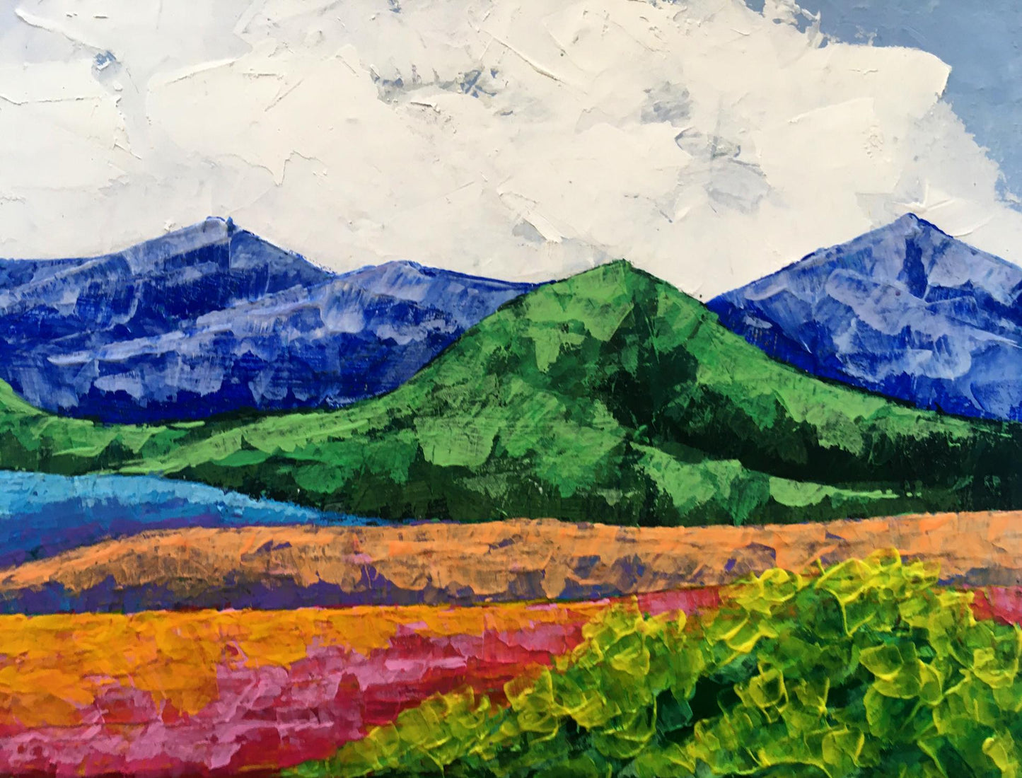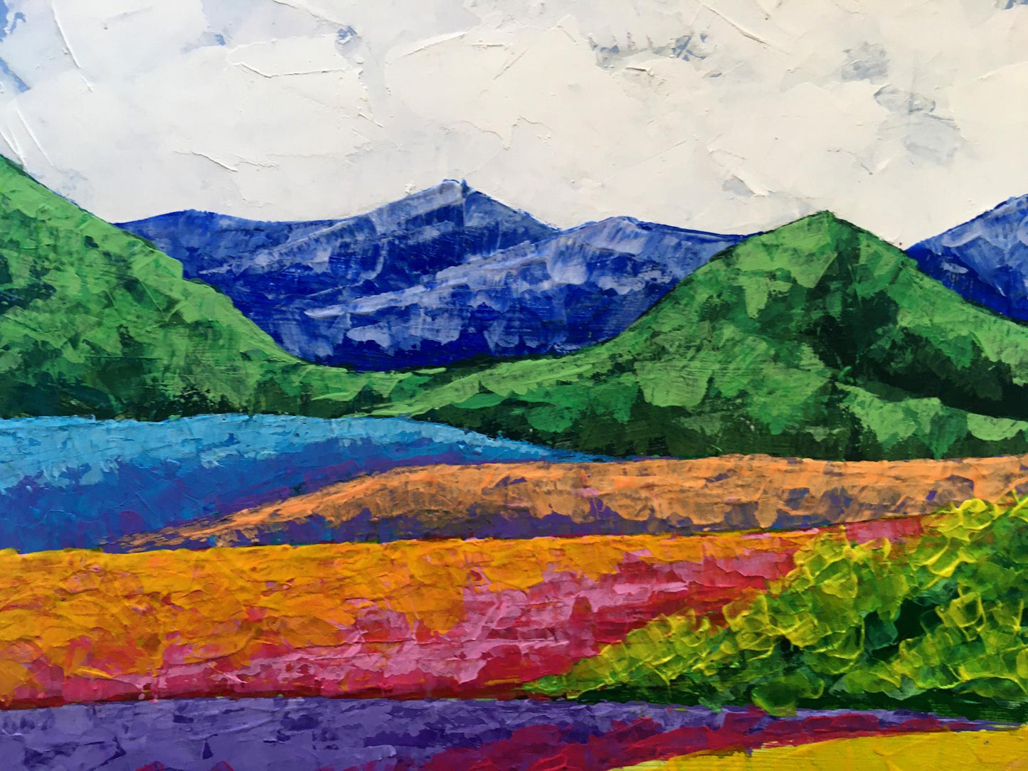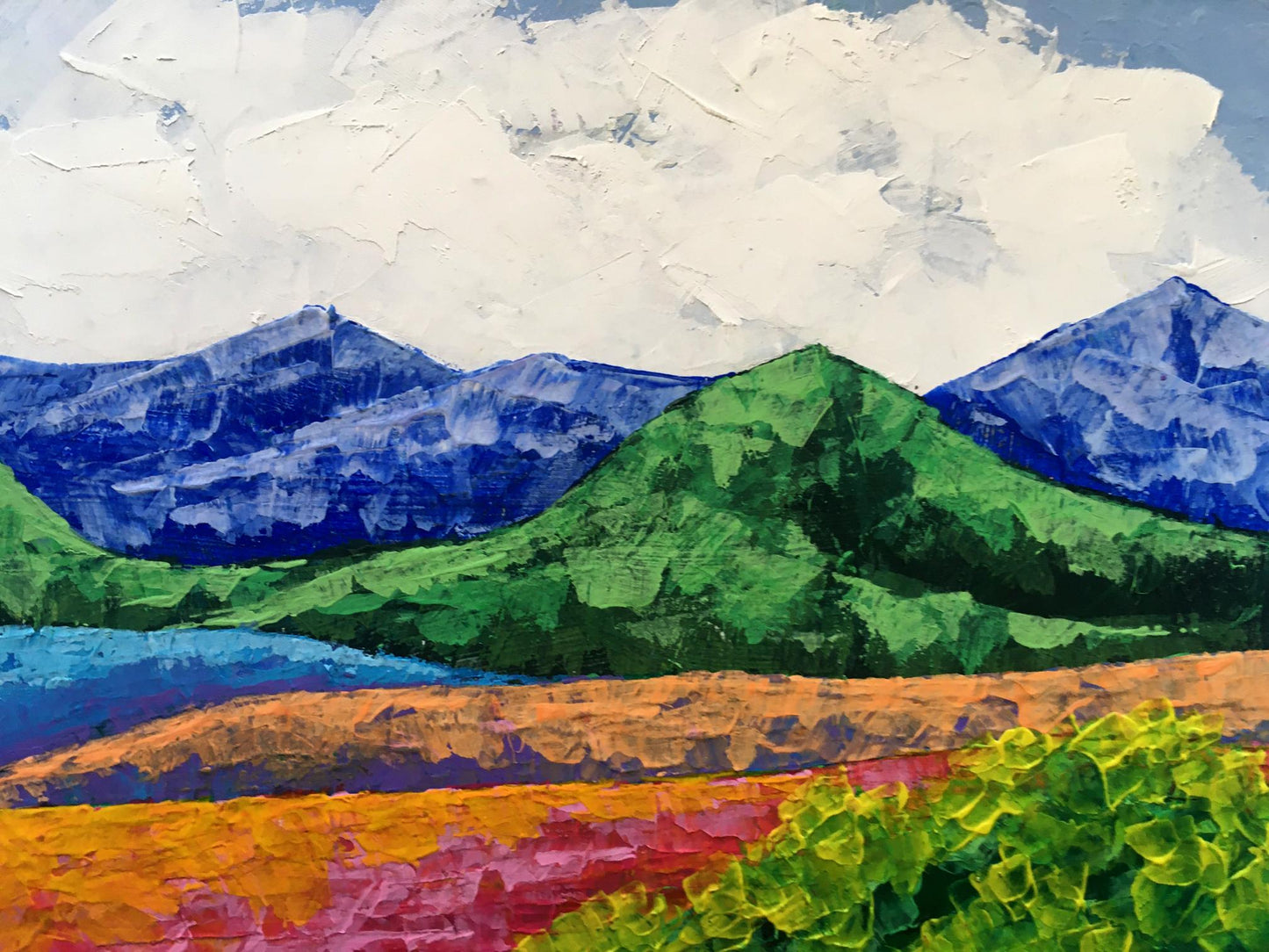 "Summer's Canvas" is an oil painting that captures the vibrant colors and majestic beauty of nature during the warm season. The painting depicts a breathtaking landscape of vast mountains, their towering peaks shrouded in misty clouds, creating an ethereal backdrop to the foreground. In the foreground, a vast field of grasses and wildflowers spreads out, bursting with a rich spectrum of colors in shades of orange, red, green, and yellow. The thick brushstrokes used to create the field convey a sense of texture and depth, making it feel as though one could reach out and touch the soft, waving grass. The bright hues and lush composition of the painting evoke a sense of vitality and energy, celebrating the abundance of life during the height of summer. "Summer's Canvas" invites the viewer to immerse themselves in the natural beauty of the world and experience the joy and wonder of the season.
