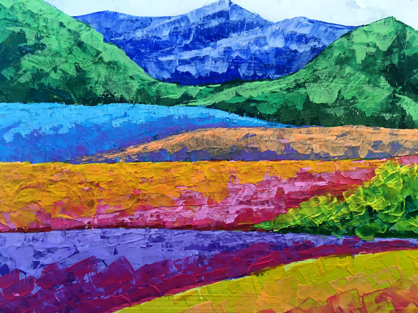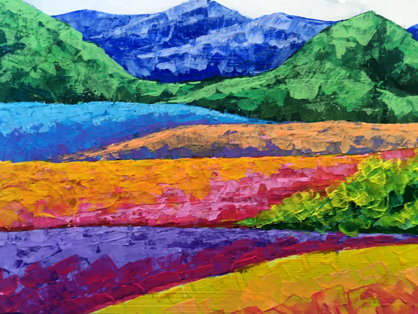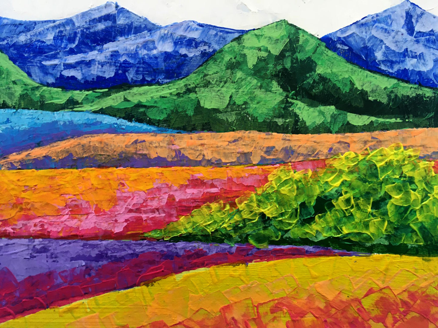 "Summer's Canvas" is an oil painting that captures the vibrant colors and majestic beauty of nature during the warm season. The painting depicts a breathtaking landscape of vast mountains, their towering peaks shrouded in misty clouds, creating an ethereal backdrop to the foreground. In the foreground, a vast field of grasses and wildflowers spreads out, bursting with a rich spectrum of colors in shades of orange, red, green, and yellow. The thick brushstrokes used to create the field convey a sense of texture and depth, making it feel as though one could reach out and touch the soft, waving grass. The bright hues and lush composition of the painting evoke a sense of vitality and energy, celebrating the abundance of life during the height of summer. "Summer's Canvas" invites the viewer to immerse themselves in the natural beauty of the world and experience the joy and wonder of the season.