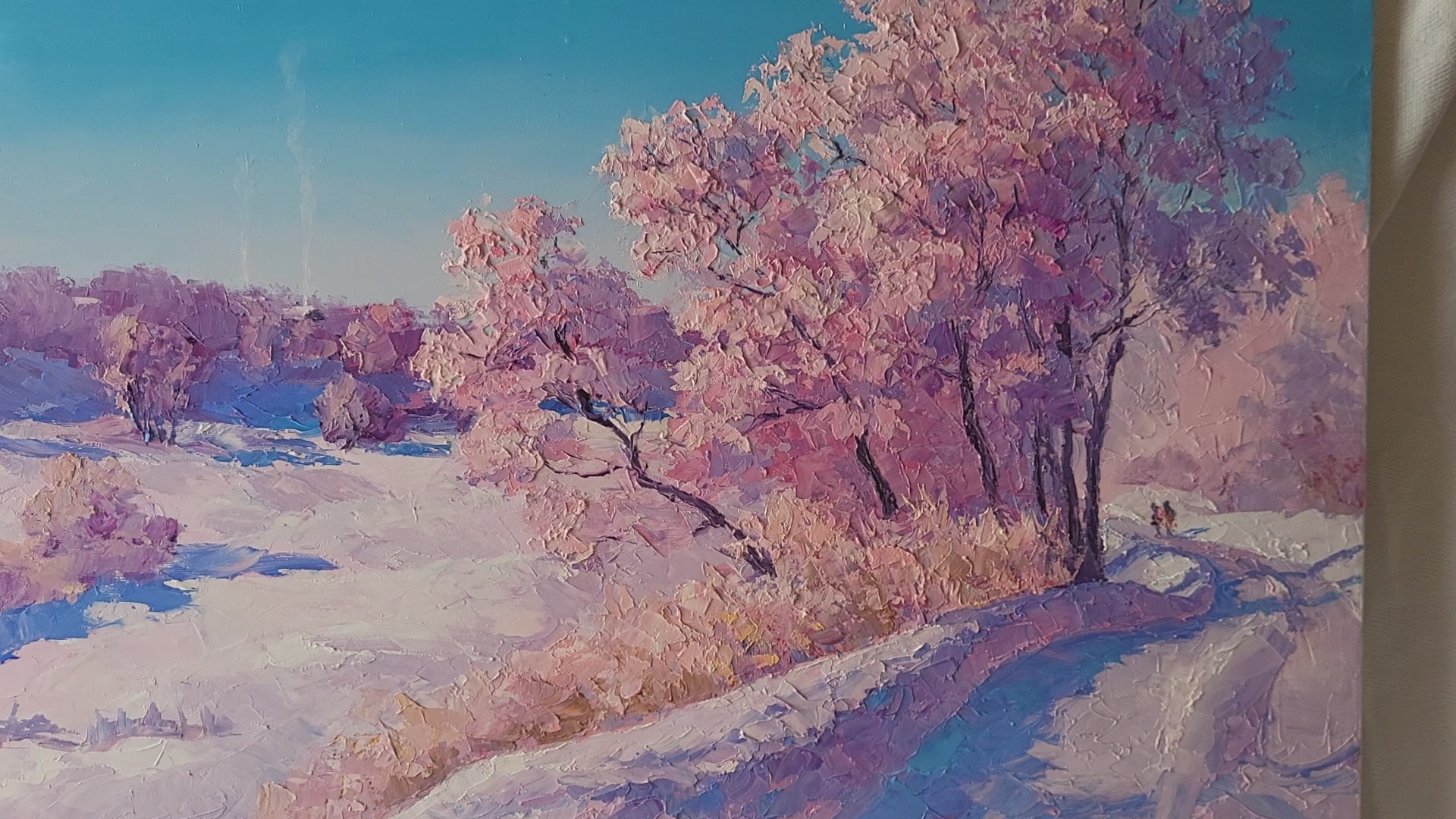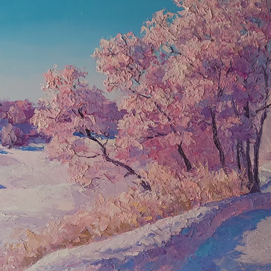 "Frosty Morning," an enchanting oil landscape by Boris Serdyuk, captures the serene beauty of a winter scene with a masterful use of light and color. Rendered in an impressionistic style, this piece evokes the crisp, tranquil atmosphere of a winter's day, where nature is cloaked in a blanket of snow, under a canopy of delicate pink-hued trees—perhaps kissed by the last rays of a setting sun or the gentle glow of a rare winter sunrise.