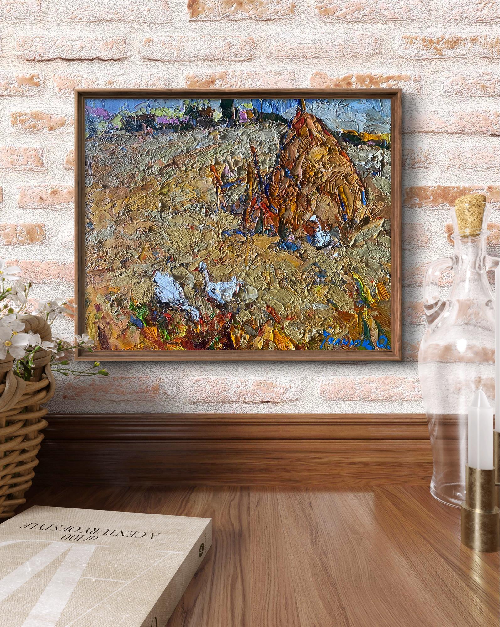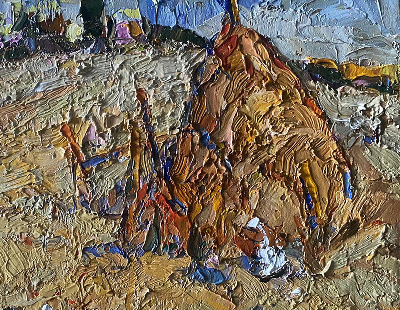 The painting "Geese in the Fields" captures a serene rural scene, evoking the charm and tranquility of countryside life. The composition is dominated by golden tones of dry fields, textured with thick, dynamic brushstrokes that give the surface of the painting a three-dimensional effect. The warm earth colors suggest the end of summer or early autumn, when the fields are dry and ready for harvest. At the center of the composition stands a large haystack, rendered with rich, warm shades of brown and ochre, giving it a sculptural presence on the canvas. The haystack symbolizes the hard work of farmers and the cycle of rural life. Surrounding the haystack, patches of green and blue hues hint at distant trees and skies, adding depth and contrast to the warm foreground. In the lower part of the painting, a small group of white geese wander freely across the field. The artist has depicted the geese using bright, contrasting strokes of white, making them stand out against the golden landscape. Their presence brings life and movement to the otherwise calm and static scene. The geese, often associated with rural farms, add a sense of simplicity and peace to the painting. The overall mood of the painting is peaceful and nostalgic, evoking a sense of quiet countryside life. The earthy colors and rural motifs create a warm and inviting atmosphere, making the viewer feel connected to the natural world and the simple pleasures of rural living. "Geese in the Fields" is a celebration of rural life, filled with textures and vibrant colors that bring the natural landscape to life. The painting invites the viewer to experience the calm and beauty of the countryside, offering a moment of reflection and peace amidst the hustle of everyday life. The artist's expressive brushwork and rich color palette create a dynamic and visually engaging scene, capturing the essence of pastoral simplicity.