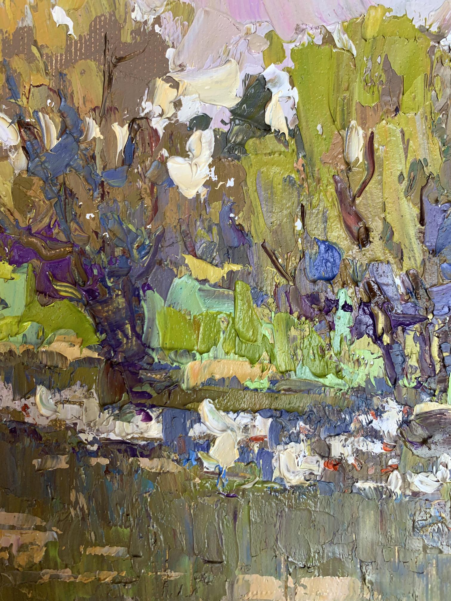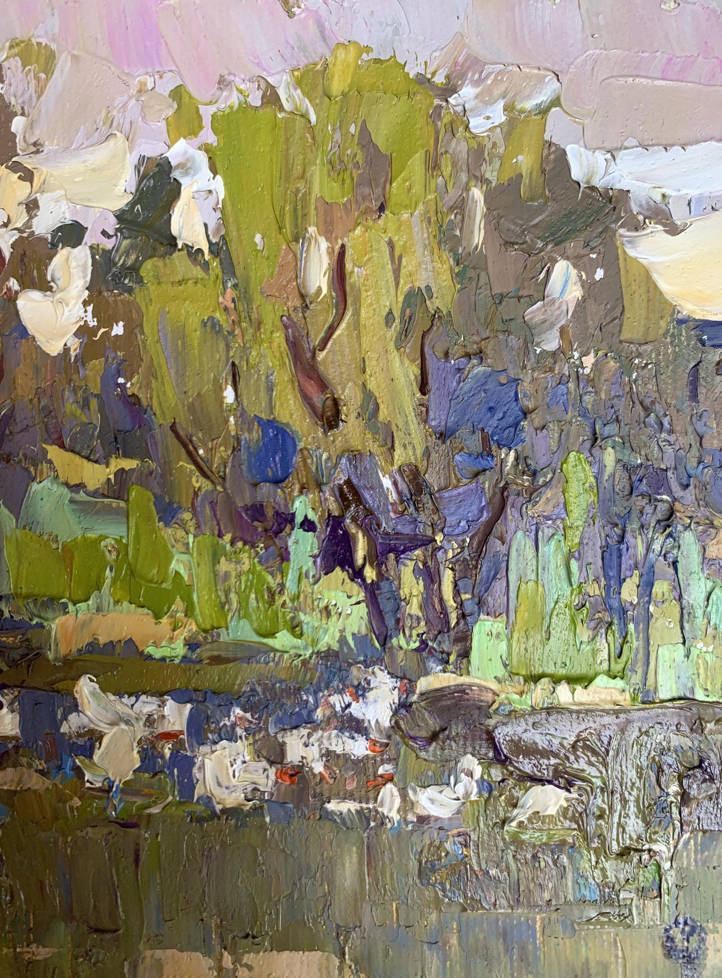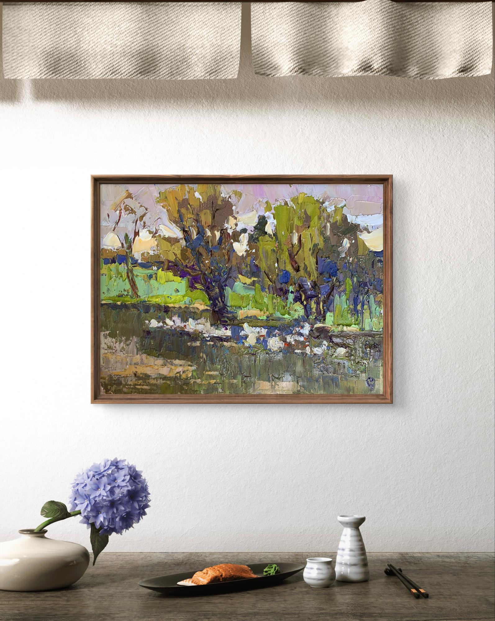 The painting "Geese in the Lake" is an expressive and textured oil on canvas piece that captures the serene and lively scene of geese swimming in a lake surrounded by lush greenery. The artist employs a vibrant and earthy color palette, with dominant shades of green, brown, blue, and white. The technique is characterized by thick, impasto brushstrokes, creating a textured and dynamic surface. The use of bold, contrasting colors and layered brushwork gives the painting a rich and immersive quality. The composition centers around a group of geese swimming in the lake, with trees and foliage in the background. The lake occupies the lower portion of the painting, while the middle and upper sections are filled with the dense and colorful vegetation. The geese are depicted in the lower center of the painting, swimming peacefully in the lake. They are painted in white with hints of orange and blue, rendered with expressive and textured brushstrokes. Their presence adds a focal point and a sense of movement to the scene. The lake is depicted with a mix of blues, greens, and browns, reflecting the surrounding vegetation. The water's texture is created with thick brushstrokes, capturing the ripples and reflections of the geese and trees. The background features dense trees and foliage, painted in various shades of green, brown, and purple. The trees are rendered with dynamic and swirling brushstrokes, creating a sense of depth and vitality. The leaves and branches are painted in layers, adding to the richness of the scene. The sky is depicted with soft hues of pink and white, suggesting either dawn or dusk. The gentle colors of the sky contrast with the vibrant greens and browns of the trees, adding a sense of tranquility to the scene. The overall mood of the painting is peaceful and lively, capturing the natural beauty and activity of geese in their habitat. The vibrant colors and dynamic brushstrokes convey a sense of harmony and vitality, inviting viewers to appreciate the serene environment. "Geese in the Lake" can be interpreted as a celebration of nature's beauty and the peaceful coexistence of wildlife. The painting captures a moment of calm and tranquility, reflecting the artist's appreciation for the natural world. The use of bright colors and expressive brushstrokes reflects the artist's emotional response to the scene, conveying a sense of joy and wonder. This painting masterfully combines elements of realism and expressionism to create a vivid and immersive depiction of a serene lakeside scene, using color and texture to evoke a sense of peace and natural beauty.