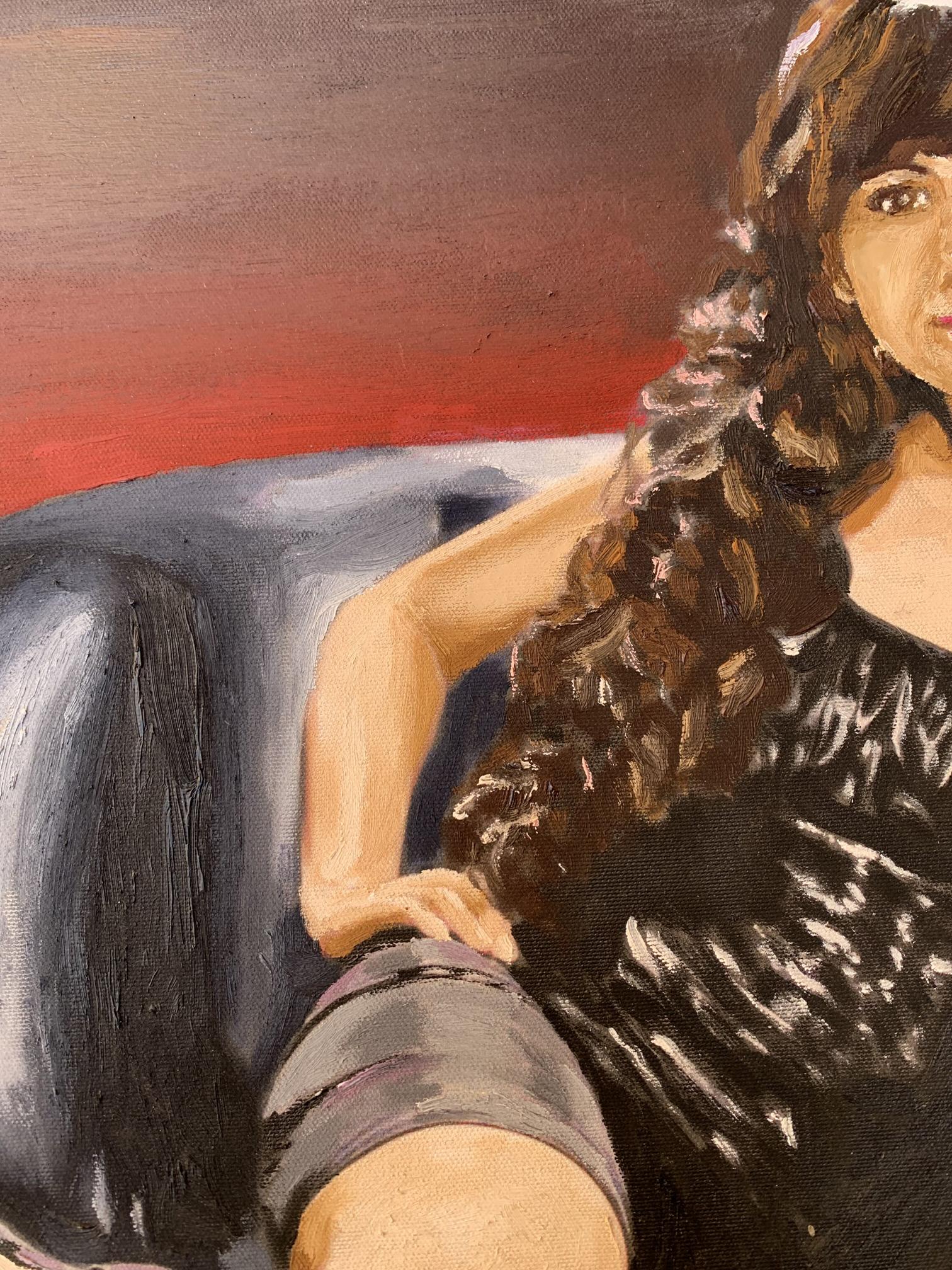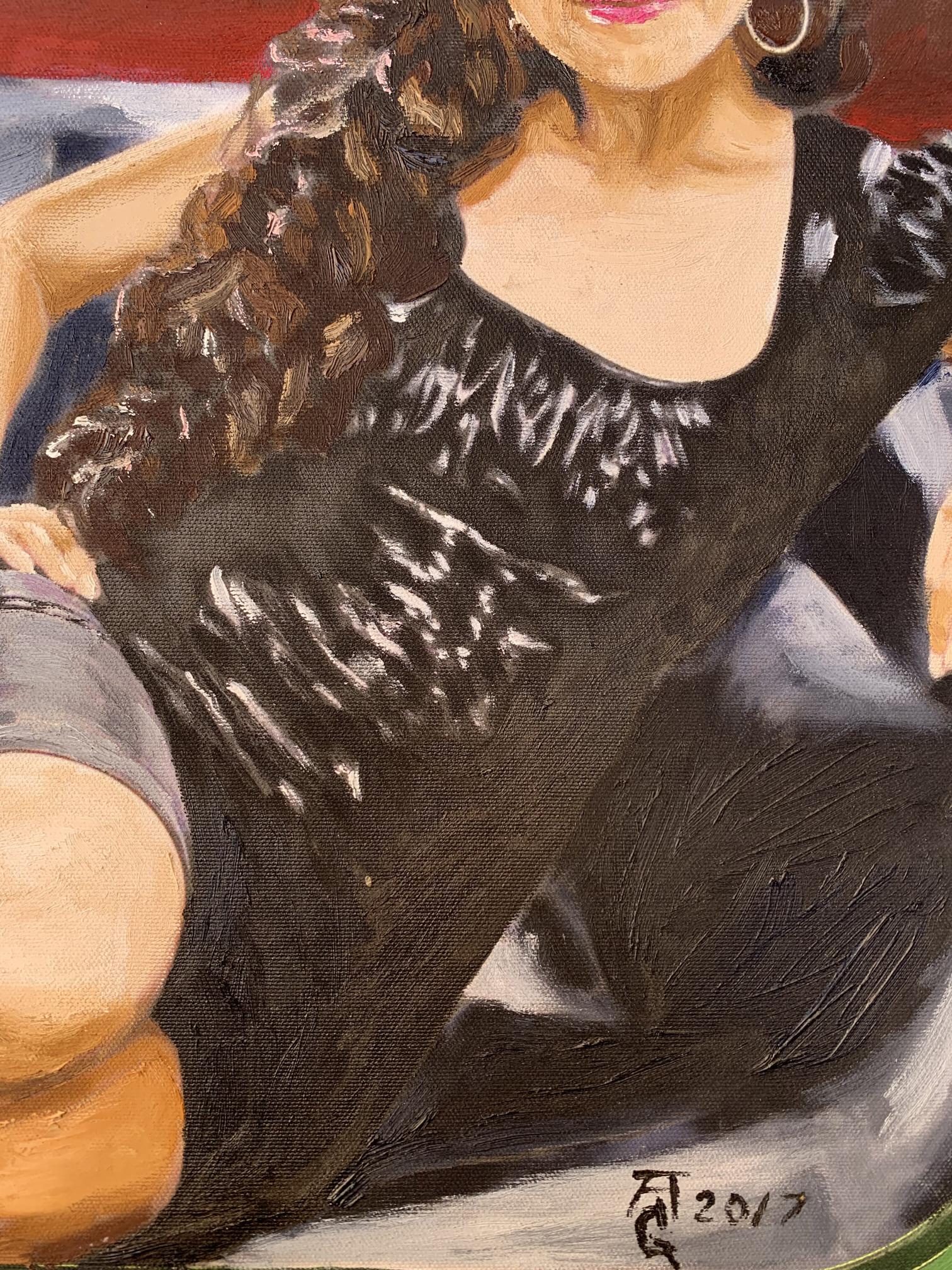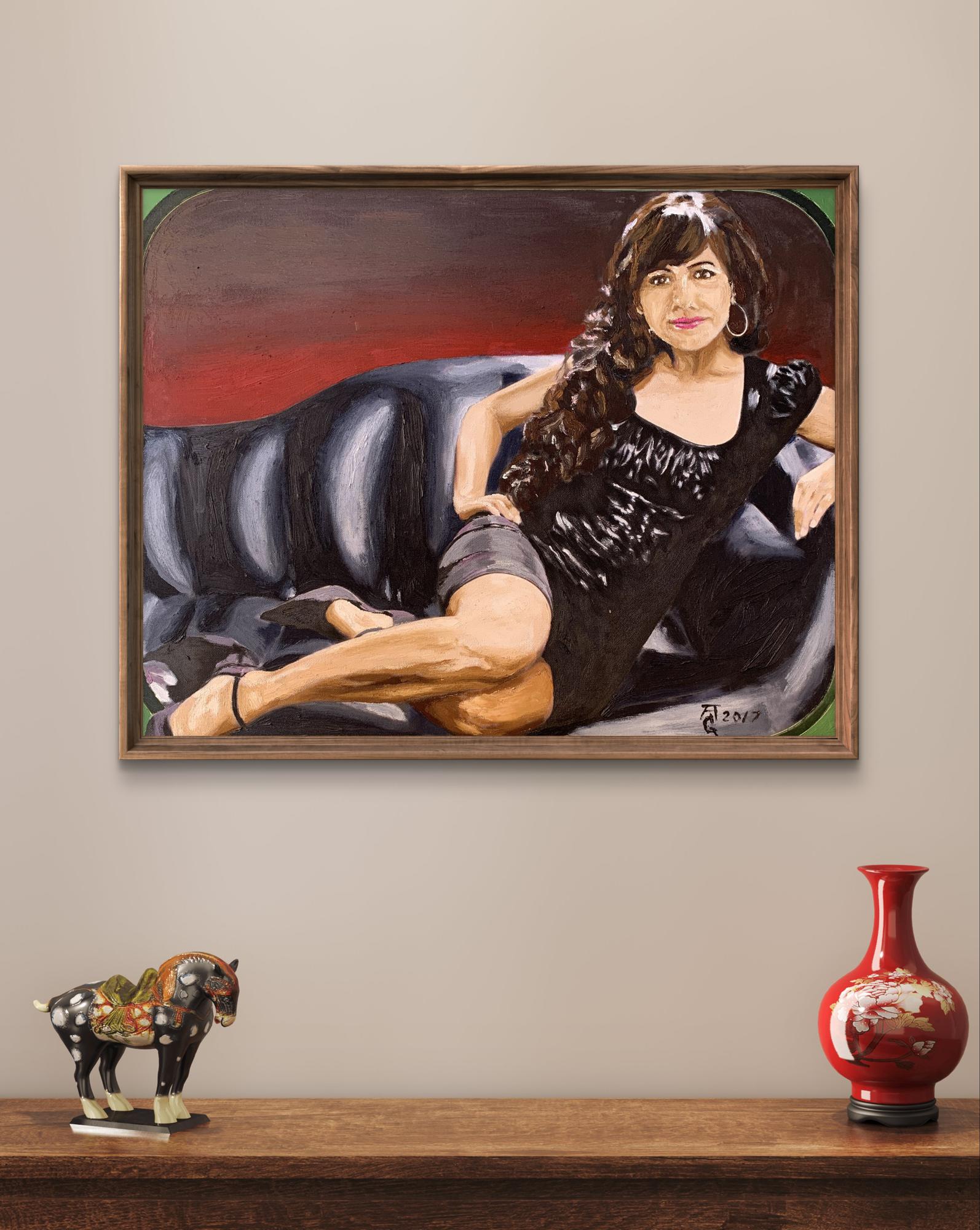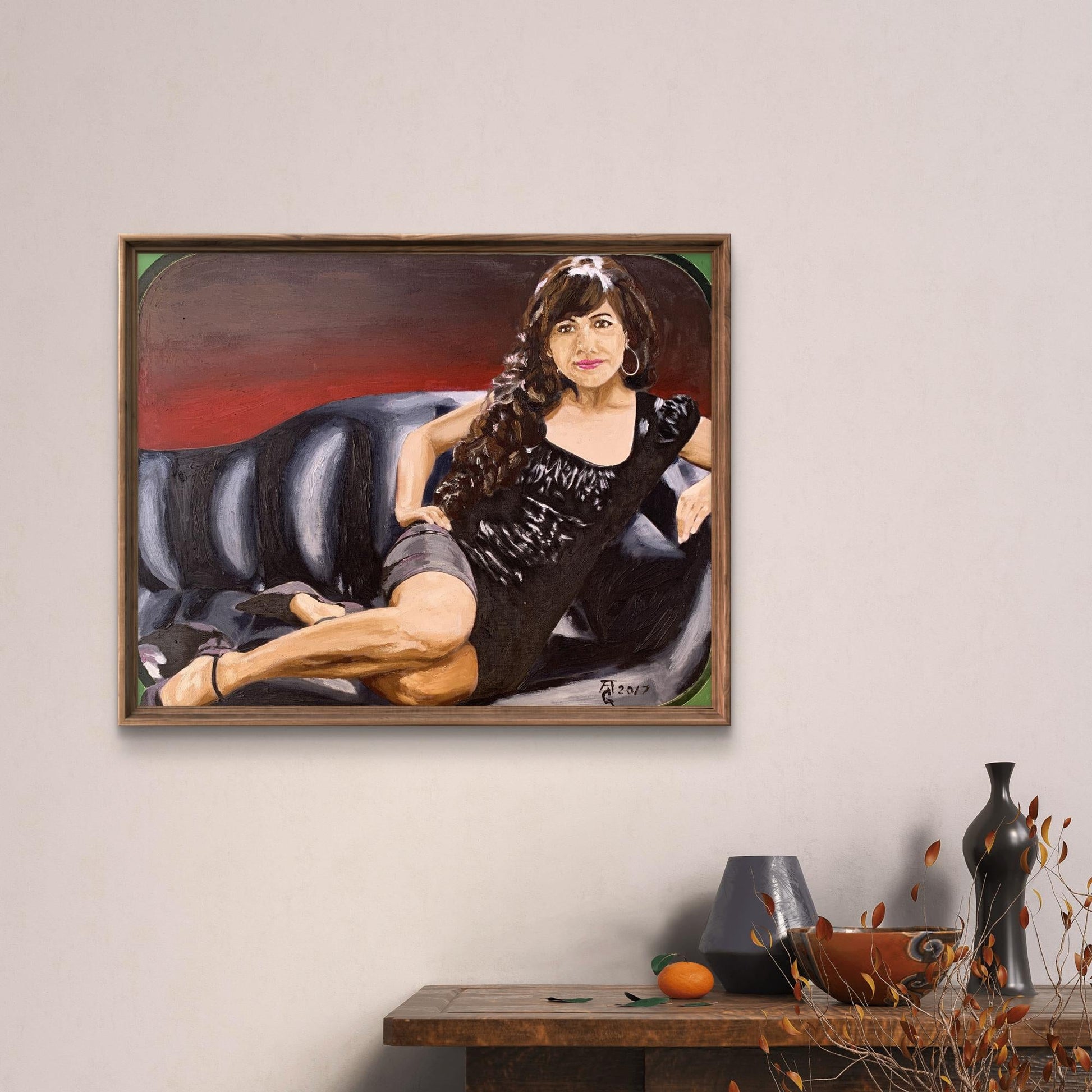 "Girl on the Sofa" is a captivating oil painting that portrays a young woman lounging elegantly on a plush, dark sofa. The artwork captures a moment of relaxed sophistication, with the subject exuding confidence and poise. The painting uses a rich palette of colors, emphasizing the contrast between the dark background and the bright, warm tones of the woman’s skin and dress. The young woman is dressed in a stylish black outfit, which highlights her slender figure. Her dress is detailed with subtle folds and sheen, adding texture and realism to the fabric. She wears hoop earrings and has long, wavy hair cascading over her shoulder, contributing to her chic appearance. Her expression is calm and self-assured, with a hint of a smile playing on her lips. The background is painted in deep, muted tones, with a gradient effect that transitions from dark to a warm red hue. This choice of colors creates a cozy, intimate atmosphere, drawing the viewer’s focus to the subject. The sofa, with its soft curves and rich texture, adds to the luxurious feel of the scene. The woman’s pose is relaxed yet graceful, with one arm resting on the back of the sofa and the other on her thigh. Her legs are elegantly crossed, and she wears high-heeled shoes that add a touch of glamour to her look. The composition of the painting is well-balanced, with the diagonal lines of her body creating a dynamic yet harmonious effect. "Girl on the Sofa" captures a moment of leisure and elegance, celebrating the beauty and confidence of the modern woman. The artist's use of color and texture enhances the overall mood, creating a sense of warmth and intimacy. The painting invites viewers to appreciate the serene yet powerful presence of the subject, making it a striking piece that resonates with themes of sophistication and self-assurance. This oil painting is a beautiful depiction of contemporary femininity, combining elements of fashion, elegance, and relaxation. The artist’s attention to detail and skillful use of color create a vivid, lifelike image that draws viewers into the scene. "Girl on the Sofa" is a testament to the timeless appeal of portraiture, capturing not just the likeness, but the essence of the subject.