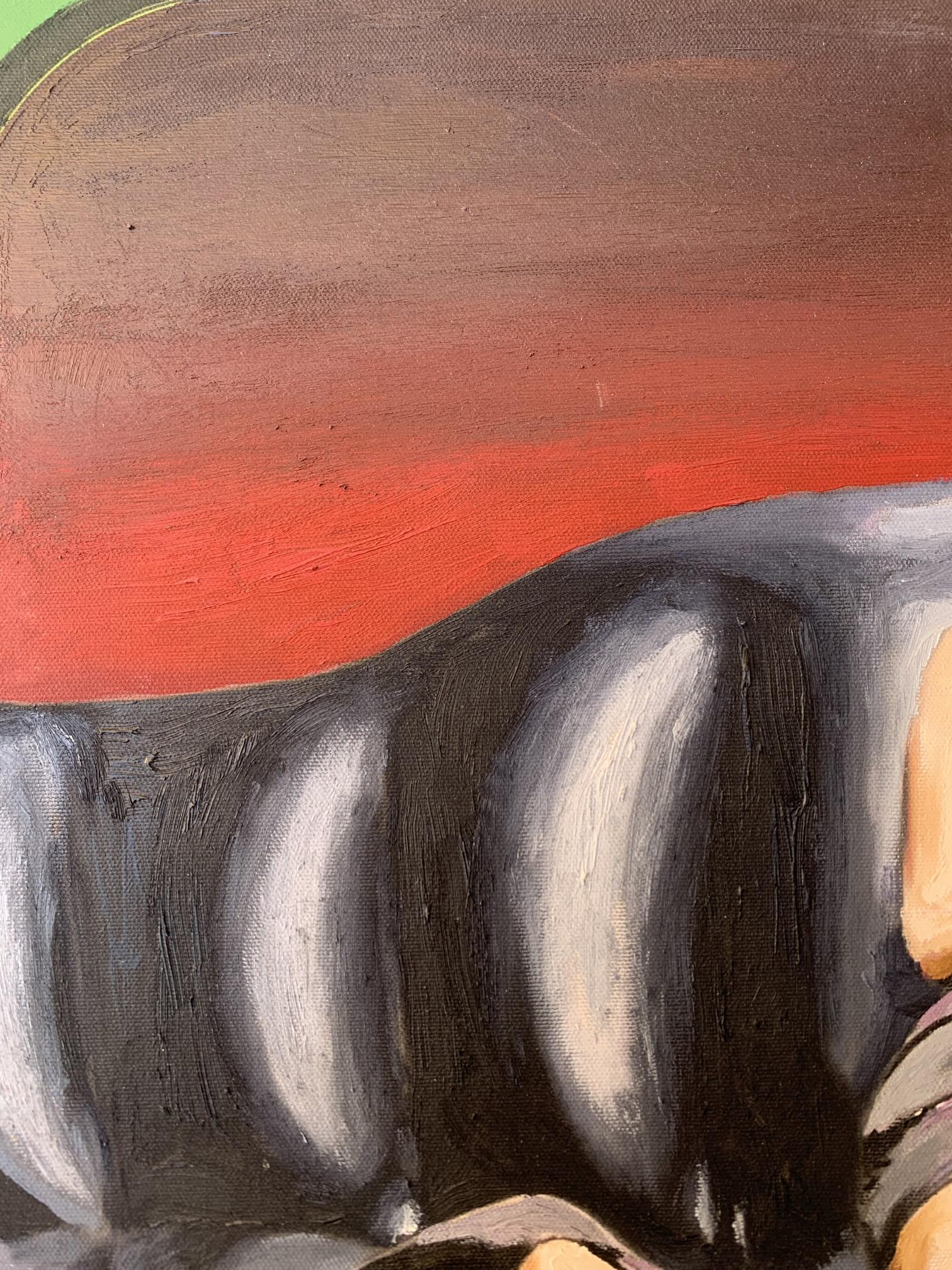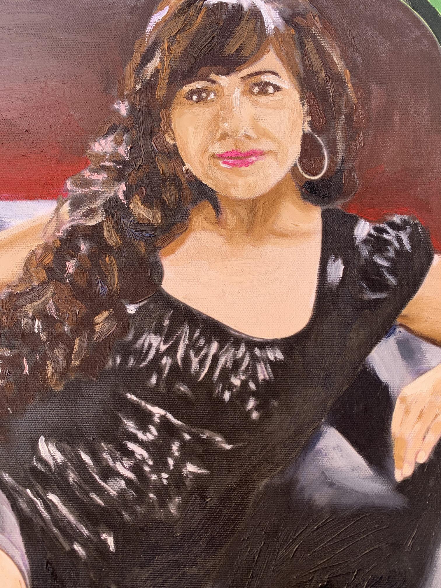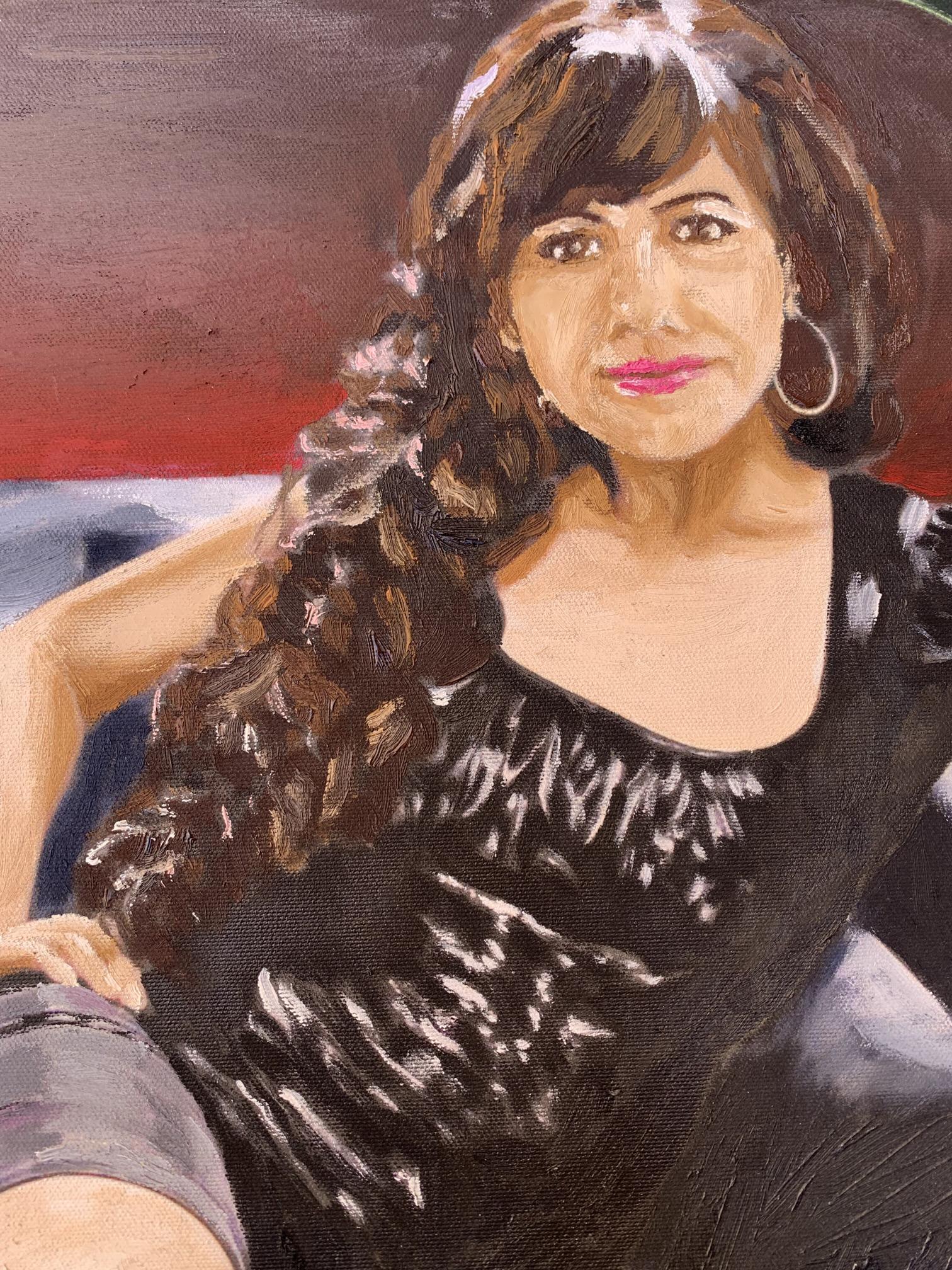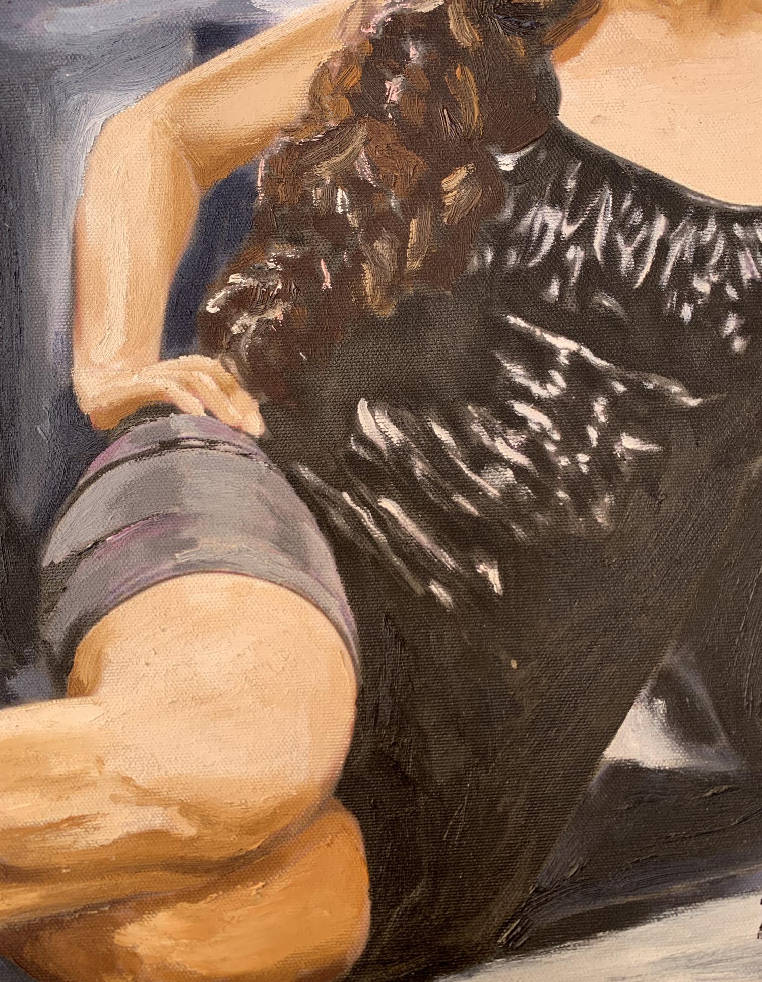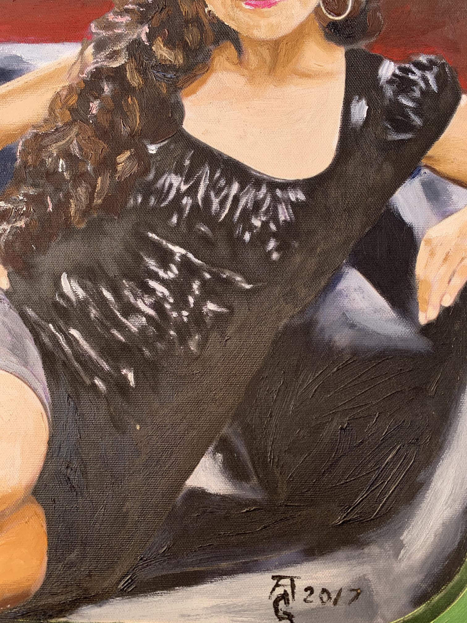 "Girl on the Sofa" is a captivating oil painting that portrays a young woman lounging elegantly on a plush, dark sofa. The artwork captures a moment of relaxed sophistication, with the subject exuding confidence and poise. The painting uses a rich palette of colors, emphasizing the contrast between the dark background and the bright, warm tones of the woman’s skin and dress. The young woman is dressed in a stylish black outfit, which highlights her slender figure. Her dress is detailed with subtle folds and sheen, adding texture and realism to the fabric. She wears hoop earrings and has long, wavy hair cascading over her shoulder, contributing to her chic appearance. Her expression is calm and self-assured, with a hint of a smile playing on her lips. The background is painted in deep, muted tones, with a gradient effect that transitions from dark to a warm red hue. This choice of colors creates a cozy, intimate atmosphere, drawing the viewer’s focus to the subject. The sofa, with its soft curves and rich texture, adds to the luxurious feel of the scene. The woman’s pose is relaxed yet graceful, with one arm resting on the back of the sofa and the other on her thigh. Her legs are elegantly crossed, and she wears high-heeled shoes that add a touch of glamour to her look. The composition of the painting is well-balanced, with the diagonal lines of her body creating a dynamic yet harmonious effect. "Girl on the Sofa" captures a moment of leisure and elegance, celebrating the beauty and confidence of the modern woman. The artist's use of color and texture enhances the overall mood, creating a sense of warmth and intimacy. The painting invites viewers to appreciate the serene yet powerful presence of the subject, making it a striking piece that resonates with themes of sophistication and self-assurance. This oil painting is a beautiful depiction of contemporary femininity, combining elements of fashion, elegance, and relaxation. The artist’s attention to detail and skillful use of color create a vivid, lifelike image that draws viewers into the scene. "Girl on the Sofa" is a testament to the timeless appeal of portraiture, capturing not just the likeness, but the essence of the subject.