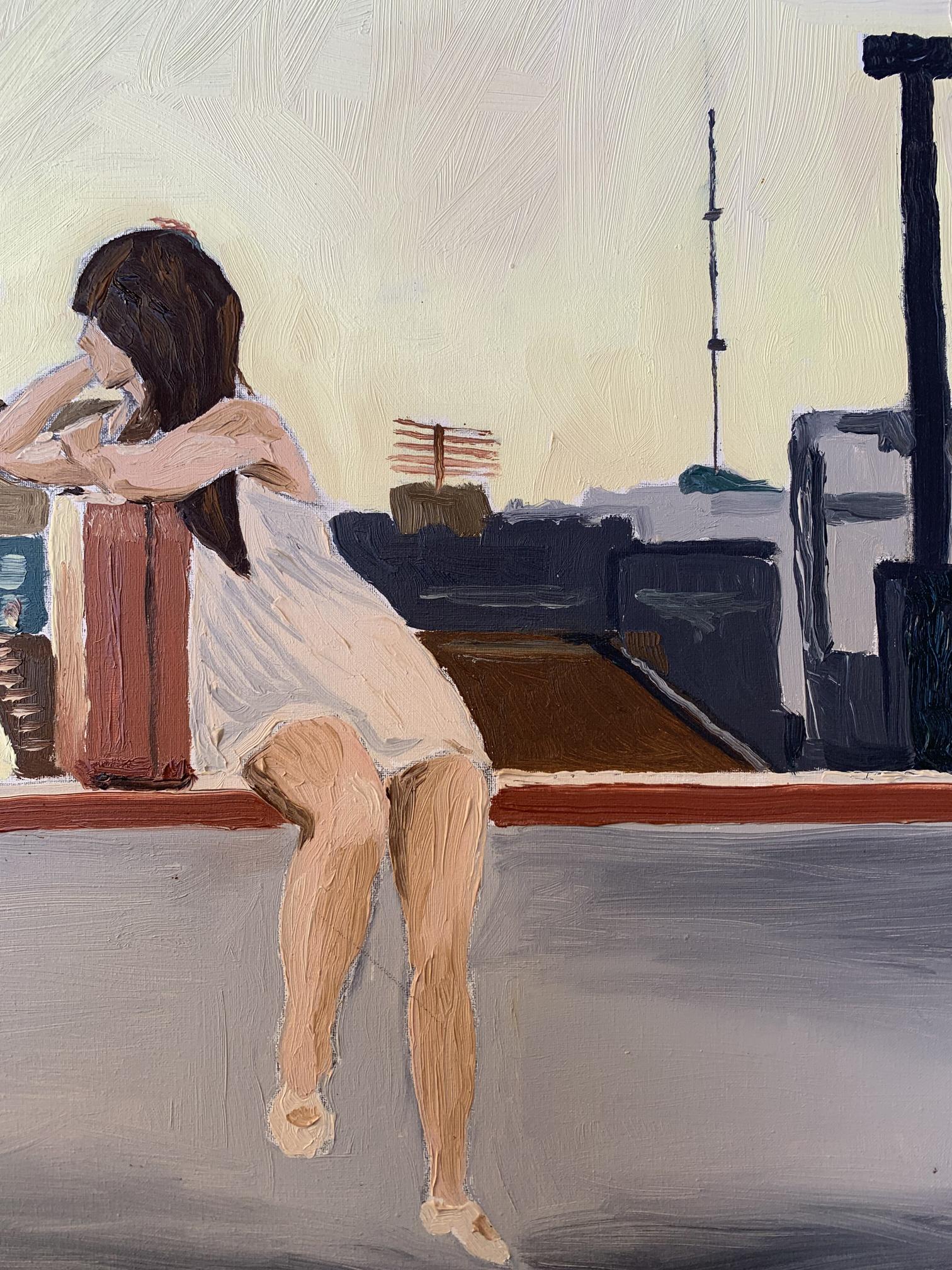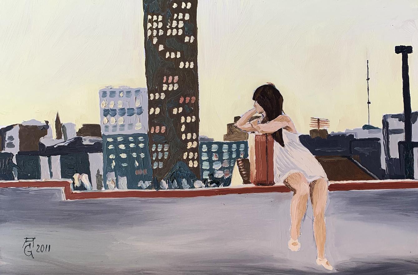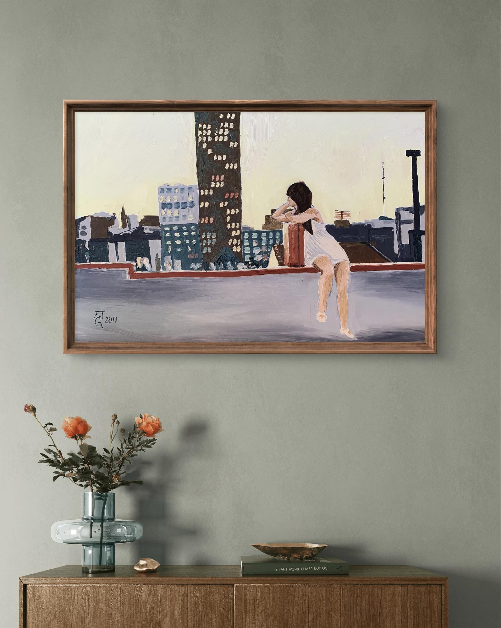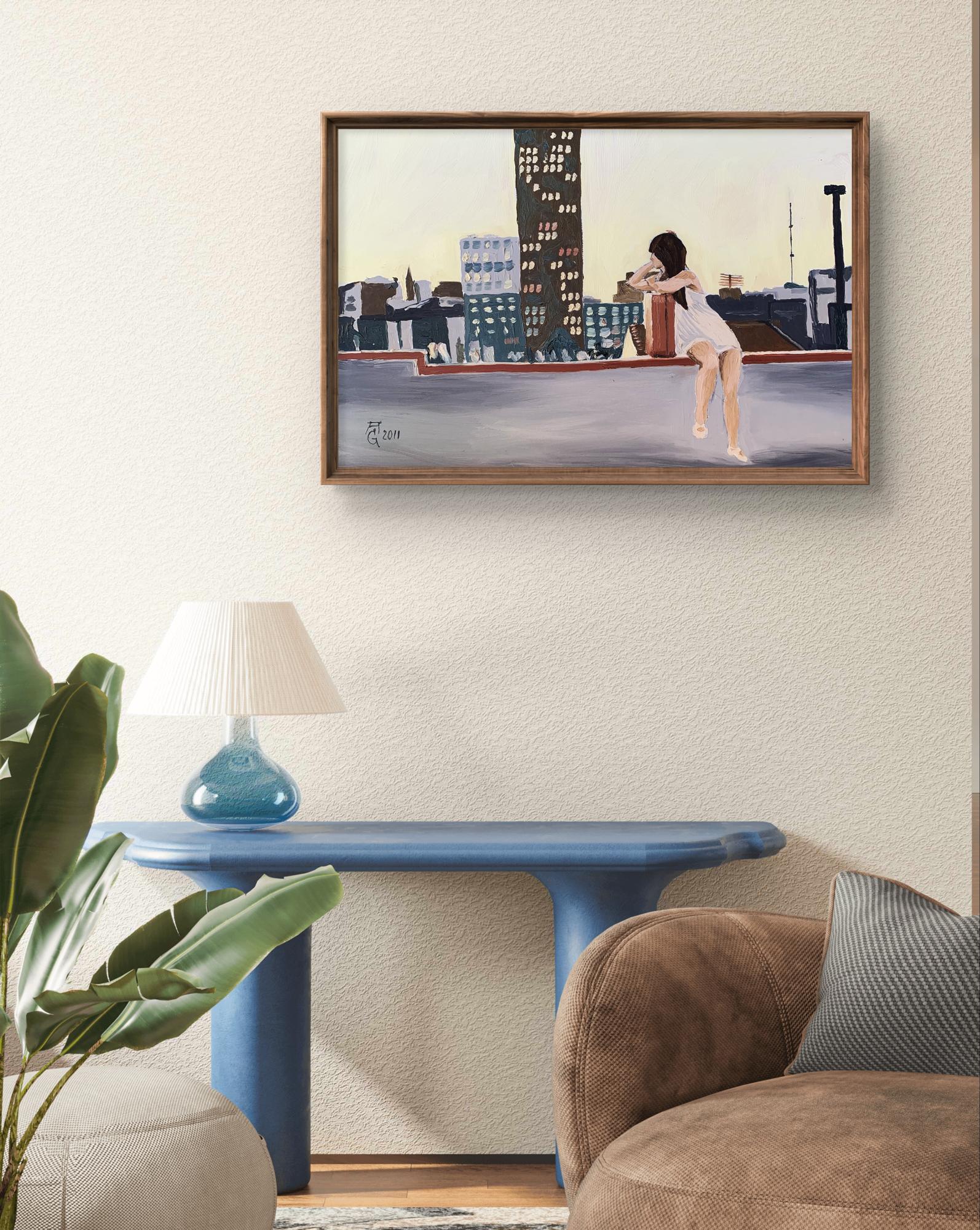 "Girl Waiting" is an evocative oil painting that captures a moment of solitude and introspection. The composition centers on a young woman seated on the edge of a rooftop, her posture suggesting a contemplative or melancholic mood. She leans forward, resting her elbows on a ledge, and looks out over an urban skyline, lost in thought. The color palette is subdued and muted, with soft tones of gray, beige, and pastel colors dominating the scene. The background features a cityscape at dusk, where the sky takes on a pale yellow hue, transitioning to a deeper blue as it meets the silhouettes of tall buildings. The buildings themselves are depicted with minimal detail, using simple geometric shapes and dabs of color to suggest windows and architectural features. This minimalist approach draws attention to the girl and her emotional state. The girl is dressed in a simple white dress, her dark hair cascading over her shoulders, contrasting with the pale colors around her. The simplicity of her attire and the lack of distracting details emphasize her presence and the poignancy of her wait. The way she is seated, with her legs dangling over the edge and her body slightly turned, suggests a mix of anticipation and resignation. The use of light in the painting is subtle yet effective, highlighting the girl and casting gentle shadows that add depth to the scene. The artist's brushwork is delicate, capturing the softness of the girl's dress and the rough texture of the rooftop surface. "Girl Waiting" can be interpreted as a depiction of longing, hope, or contemplation. The girl's solitary figure against the vast, impersonal cityscape evokes a sense of isolation, yet her posture and gaze suggest she is waiting for something or someone. The painting invites viewers to reflect on moments of waiting in their own lives, the emotions tied to anticipation, and the quiet introspection that often accompanies such times. This oil painting beautifully captures a fleeting moment of introspection, using a muted color palette and minimalist cityscape to focus on the emotional state of the central figure. "Girl Waiting" stands out for its ability to convey a narrative through subtle details and evocative composition, making it a poignant and thought-provoking piece of art.