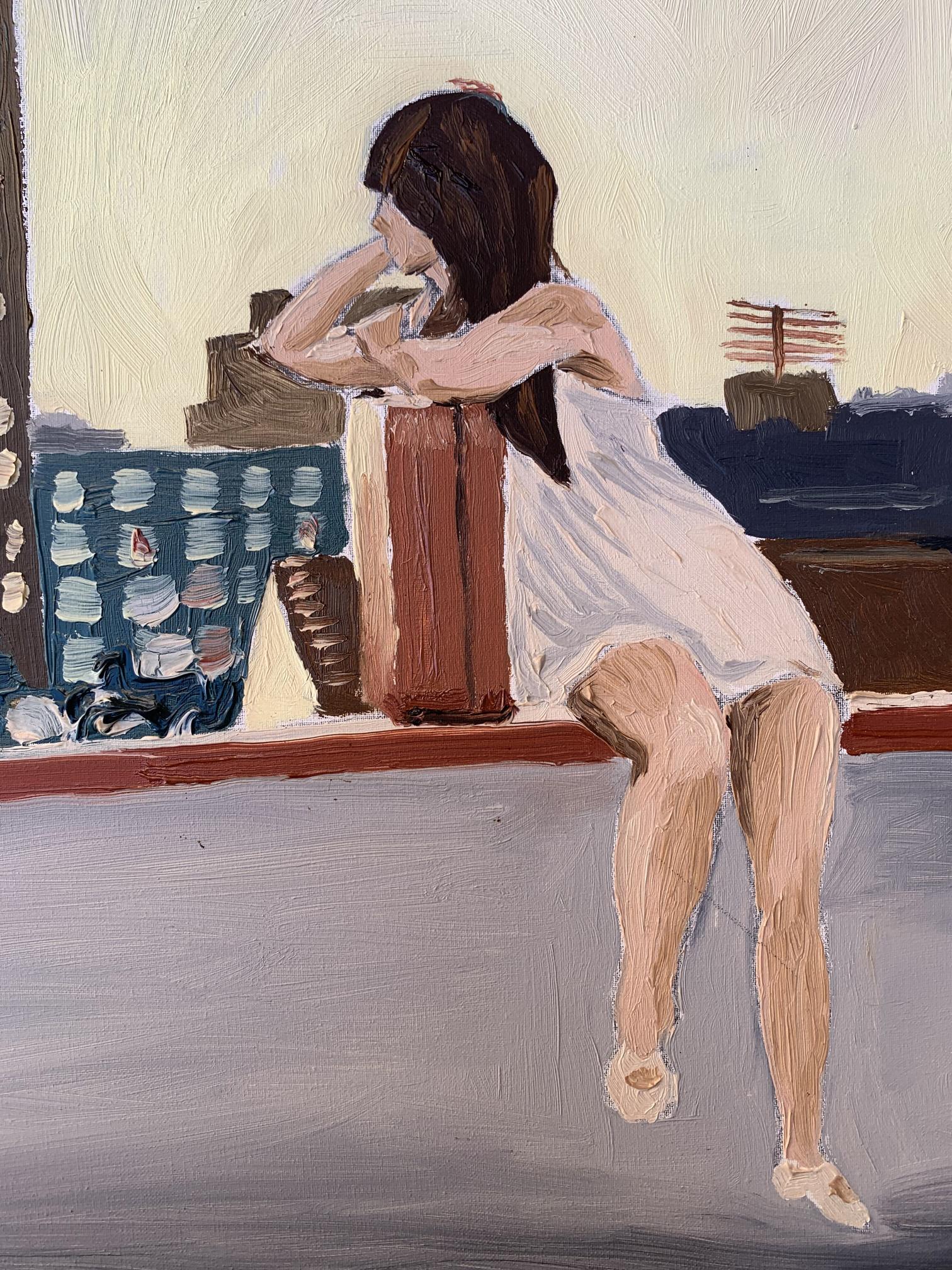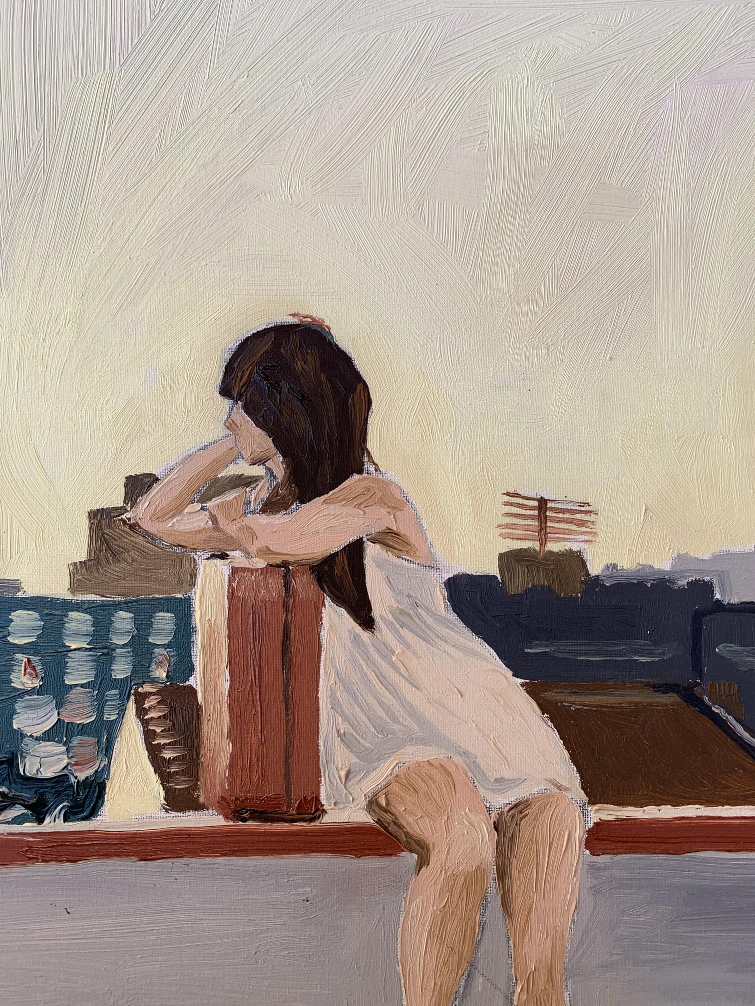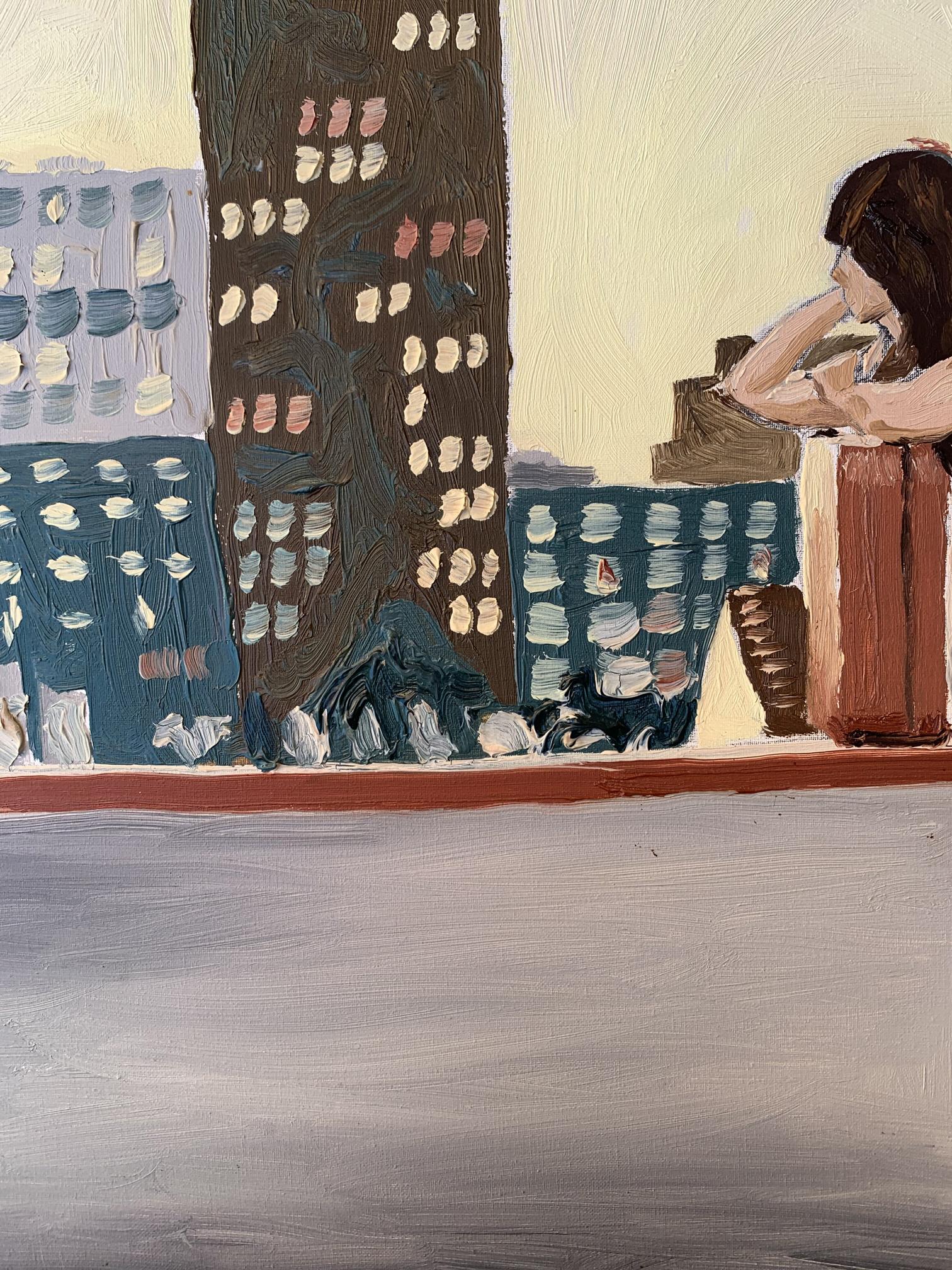 "Girl Waiting" is an evocative oil painting that captures a moment of solitude and introspection. The composition centers on a young woman seated on the edge of a rooftop, her posture suggesting a contemplative or melancholic mood. She leans forward, resting her elbows on a ledge, and looks out over an urban skyline, lost in thought. The color palette is subdued and muted, with soft tones of gray, beige, and pastel colors dominating the scene. The background features a cityscape at dusk, where the sky takes on a pale yellow hue, transitioning to a deeper blue as it meets the silhouettes of tall buildings. The buildings themselves are depicted with minimal detail, using simple geometric shapes and dabs of color to suggest windows and architectural features. This minimalist approach draws attention to the girl and her emotional state. The girl is dressed in a simple white dress, her dark hair cascading over her shoulders, contrasting with the pale colors around her. The simplicity of her attire and the lack of distracting details emphasize her presence and the poignancy of her wait. The way she is seated, with her legs dangling over the edge and her body slightly turned, suggests a mix of anticipation and resignation. The use of light in the painting is subtle yet effective, highlighting the girl and casting gentle shadows that add depth to the scene. The artist's brushwork is delicate, capturing the softness of the girl's dress and the rough texture of the rooftop surface. "Girl Waiting" can be interpreted as a depiction of longing, hope, or contemplation. The girl's solitary figure against the vast, impersonal cityscape evokes a sense of isolation, yet her posture and gaze suggest she is waiting for something or someone. The painting invites viewers to reflect on moments of waiting in their own lives, the emotions tied to anticipation, and the quiet introspection that often accompanies such times. This oil painting beautifully captures a fleeting moment of introspection, using a muted color palette and minimalist cityscape to focus on the emotional state of the central figure. "Girl Waiting" stands out for its ability to convey a narrative through subtle details and evocative composition, making it a poignant and thought-provoking piece of art.