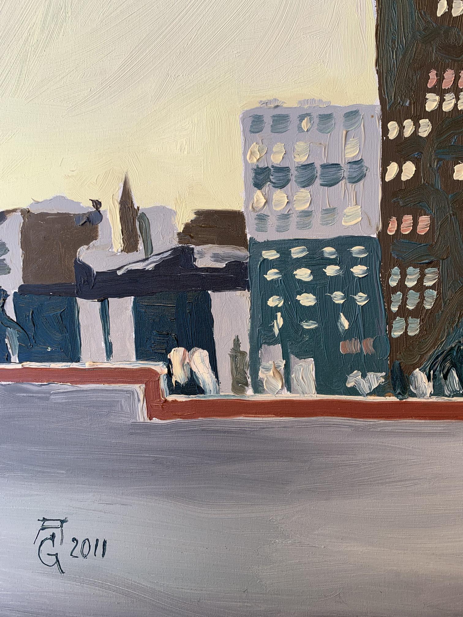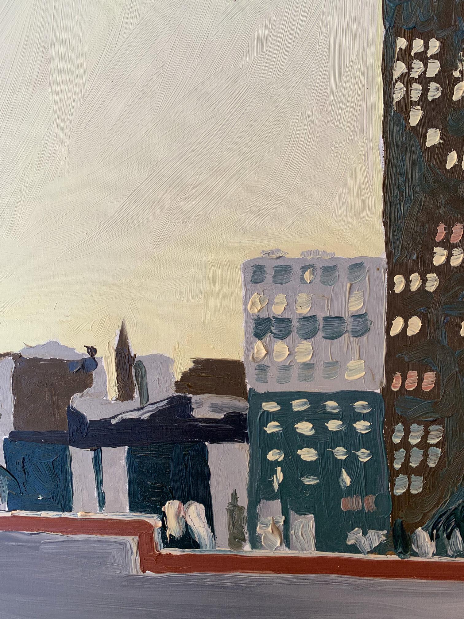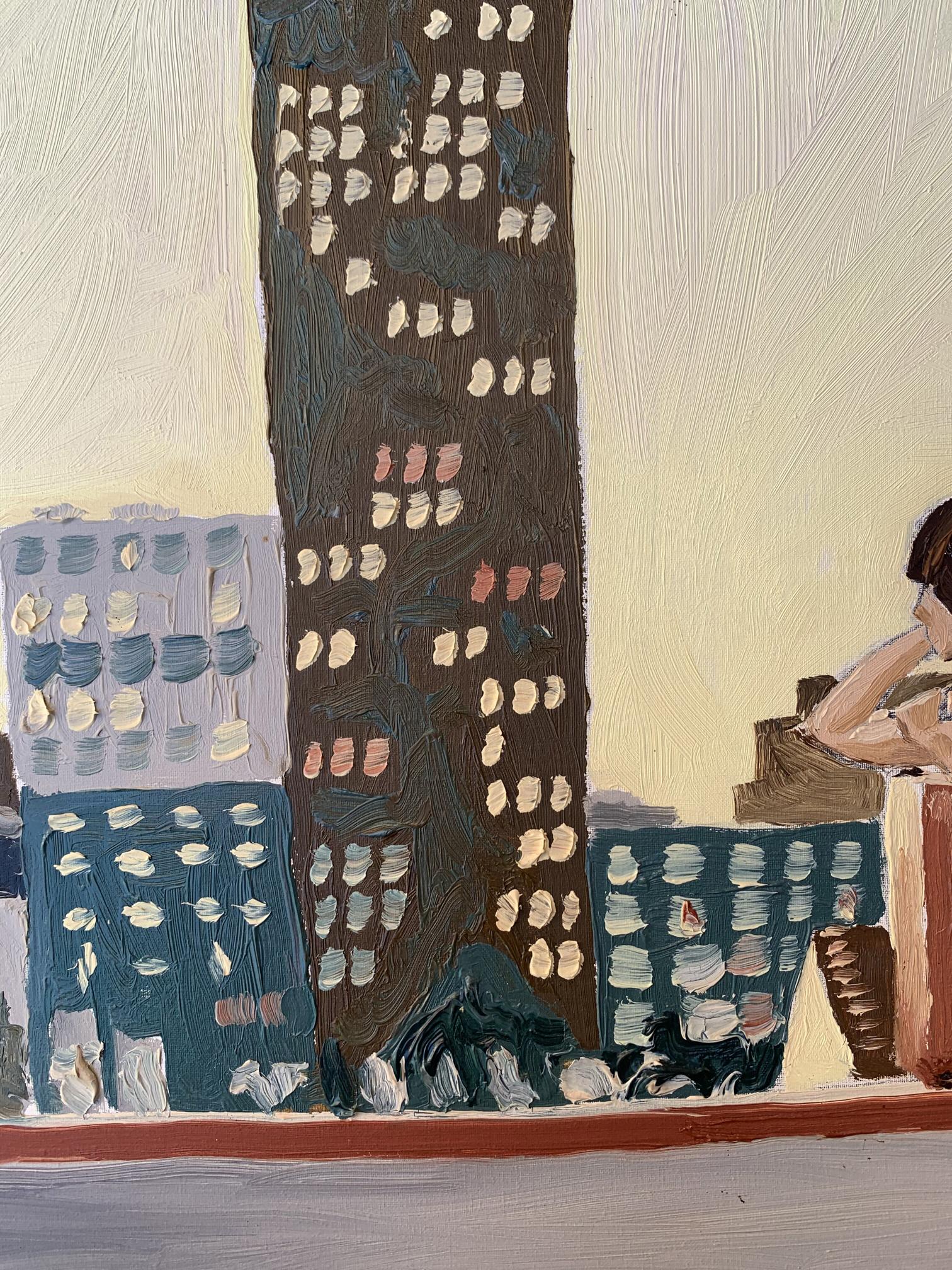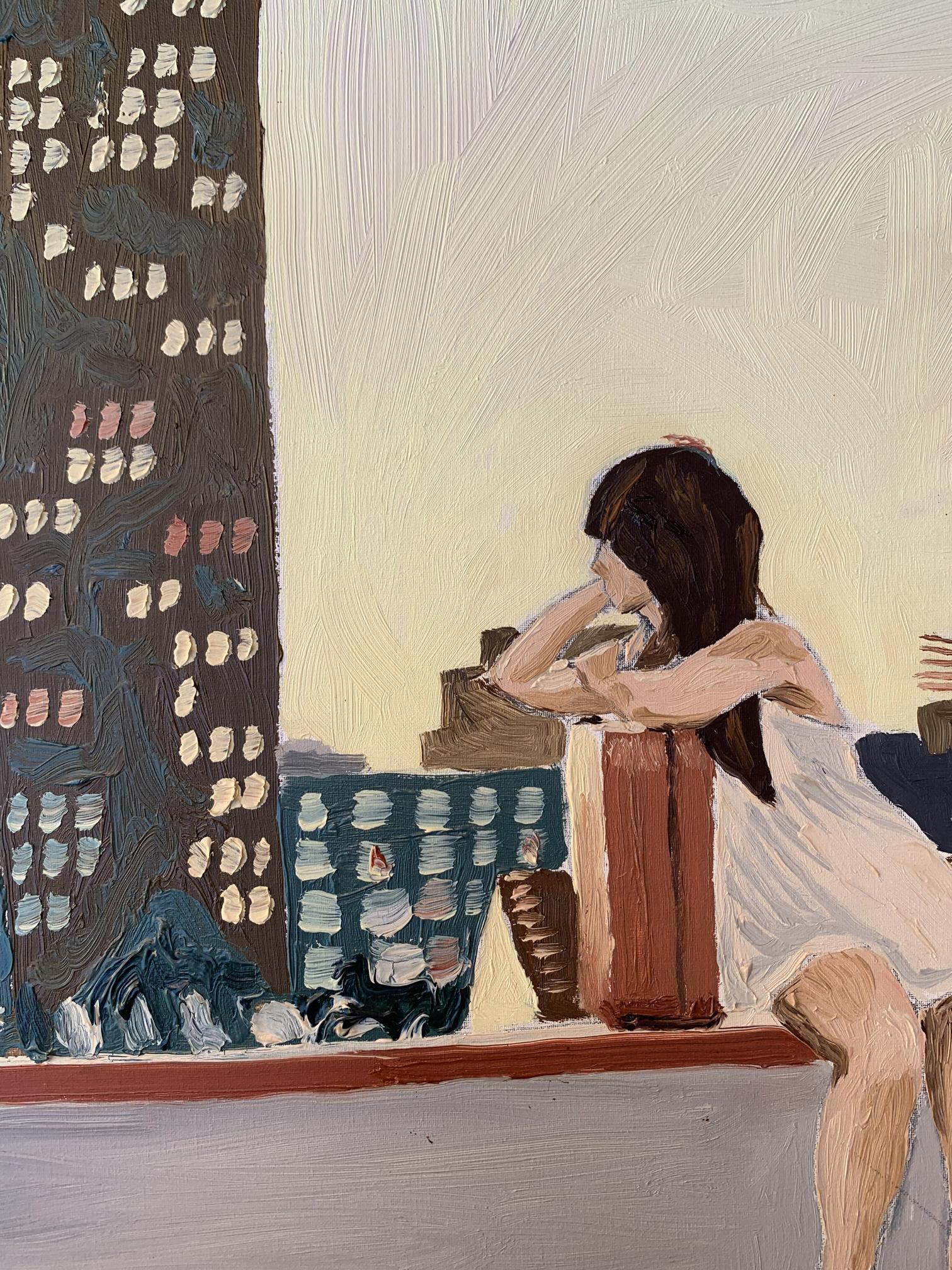 "Girl Waiting" is an evocative oil painting that captures a moment of solitude and introspection. The composition centers on a young woman seated on the edge of a rooftop, her posture suggesting a contemplative or melancholic mood. She leans forward, resting her elbows on a ledge, and looks out over an urban skyline, lost in thought. The color palette is subdued and muted, with soft tones of gray, beige, and pastel colors dominating the scene. The background features a cityscape at dusk, where the sky takes on a pale yellow hue, transitioning to a deeper blue as it meets the silhouettes of tall buildings. The buildings themselves are depicted with minimal detail, using simple geometric shapes and dabs of color to suggest windows and architectural features. This minimalist approach draws attention to the girl and her emotional state. The girl is dressed in a simple white dress, her dark hair cascading over her shoulders, contrasting with the pale colors around her. The simplicity of her attire and the lack of distracting details emphasize her presence and the poignancy of her wait. The way she is seated, with her legs dangling over the edge and her body slightly turned, suggests a mix of anticipation and resignation. The use of light in the painting is subtle yet effective, highlighting the girl and casting gentle shadows that add depth to the scene. The artist's brushwork is delicate, capturing the softness of the girl's dress and the rough texture of the rooftop surface. "Girl Waiting" can be interpreted as a depiction of longing, hope, or contemplation. The girl's solitary figure against the vast, impersonal cityscape evokes a sense of isolation, yet her posture and gaze suggest she is waiting for something or someone. The painting invites viewers to reflect on moments of waiting in their own lives, the emotions tied to anticipation, and the quiet introspection that often accompanies such times. This oil painting beautifully captures a fleeting moment of introspection, using a muted color palette and minimalist cityscape to focus on the emotional state of the central figure. "Girl Waiting" stands out for its ability to convey a narrative through subtle details and evocative composition, making it a poignant and thought-provoking piece of art.